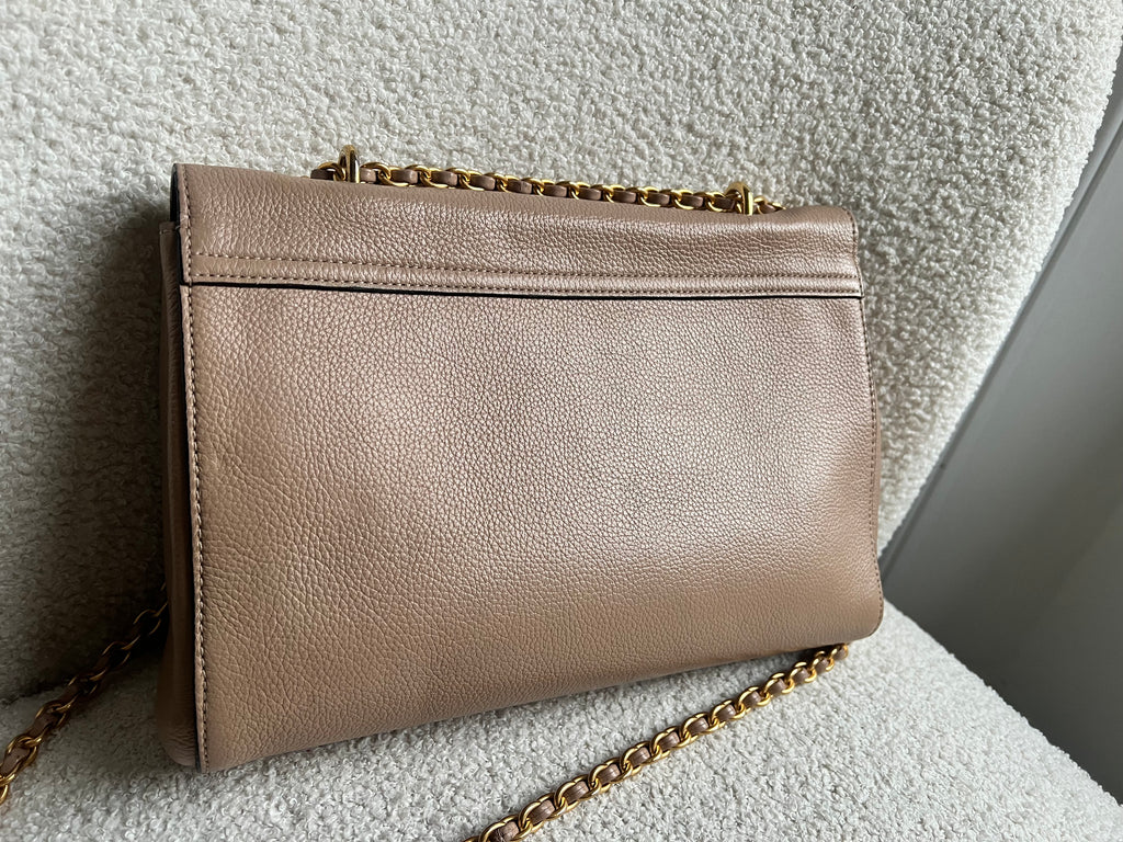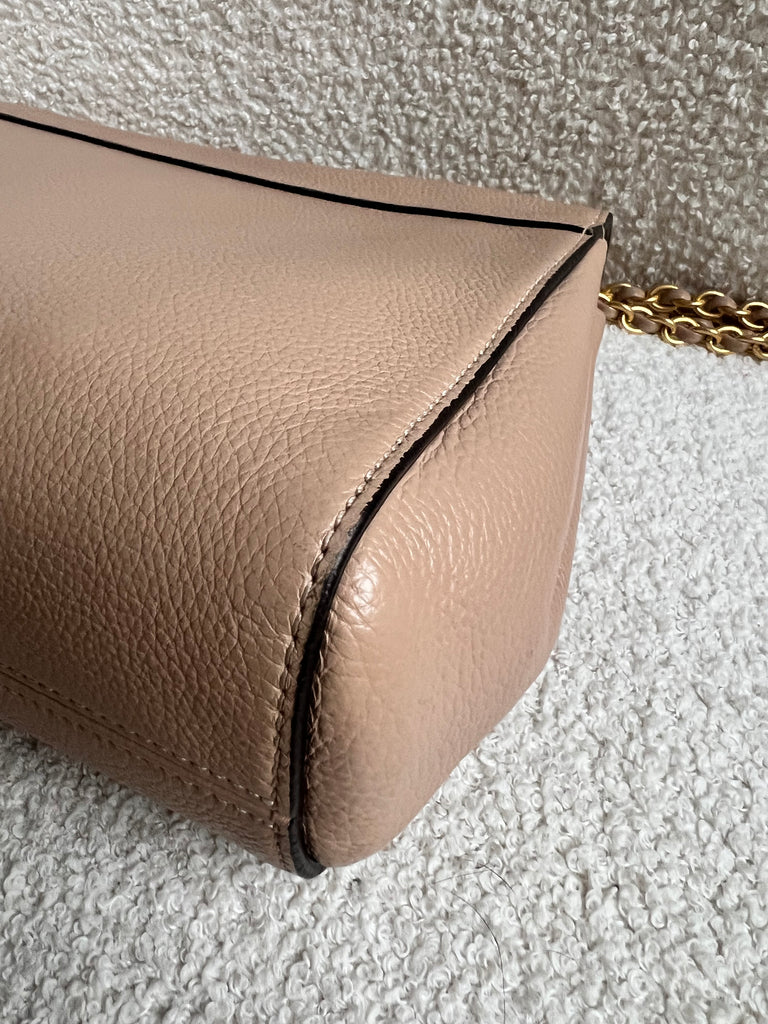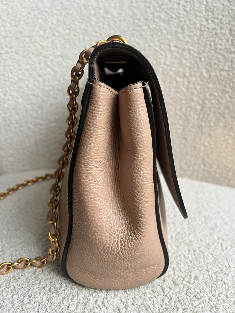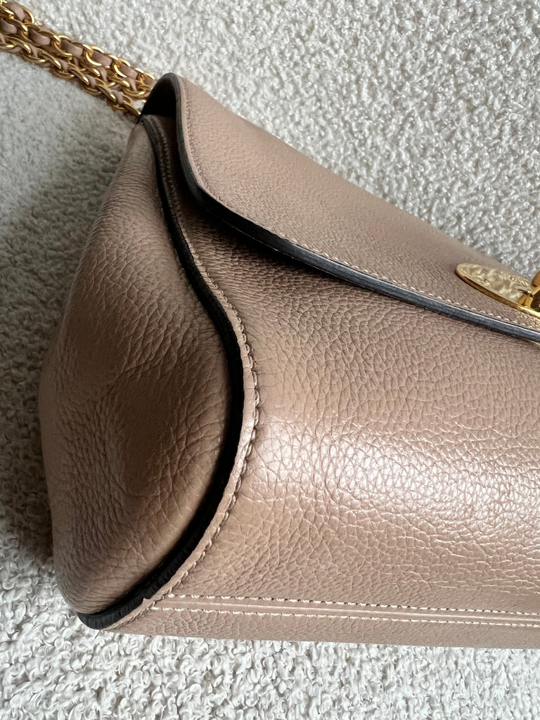 Mulberry Medium Lily in Rosewater Small Classic Grain with gold hardware. The Lily is an effortlessly elegant style with a compact shape. The ultimate evening bag, this style can also be used for day or event wear. The woven leather and chain strap can be worn short or long, and the Lily features the iconic postmans lock and padlock. Can be worn over shoulder or crossbody.