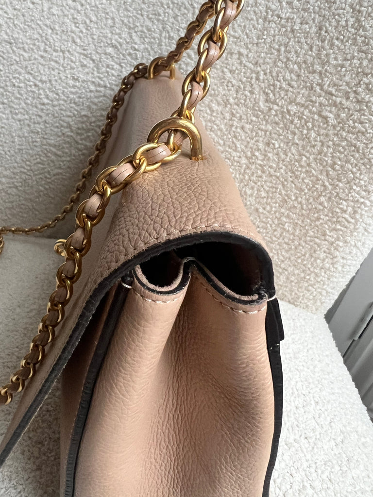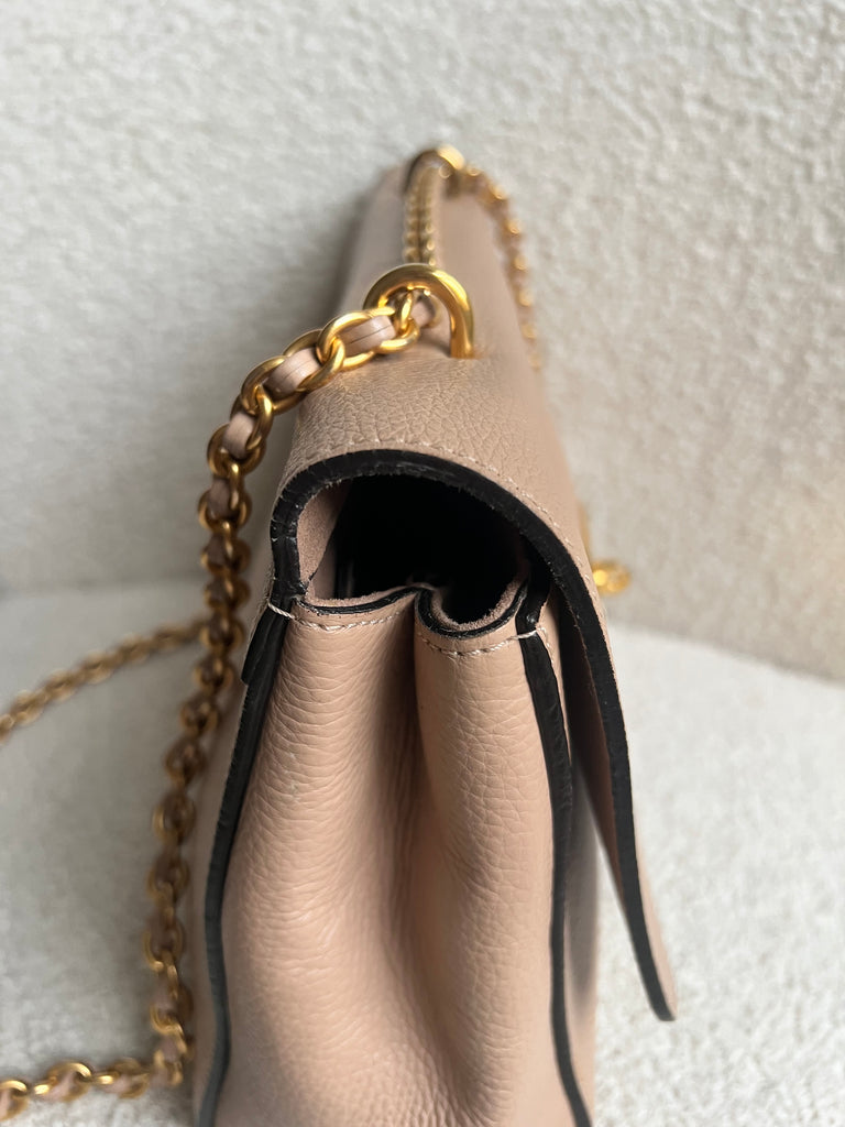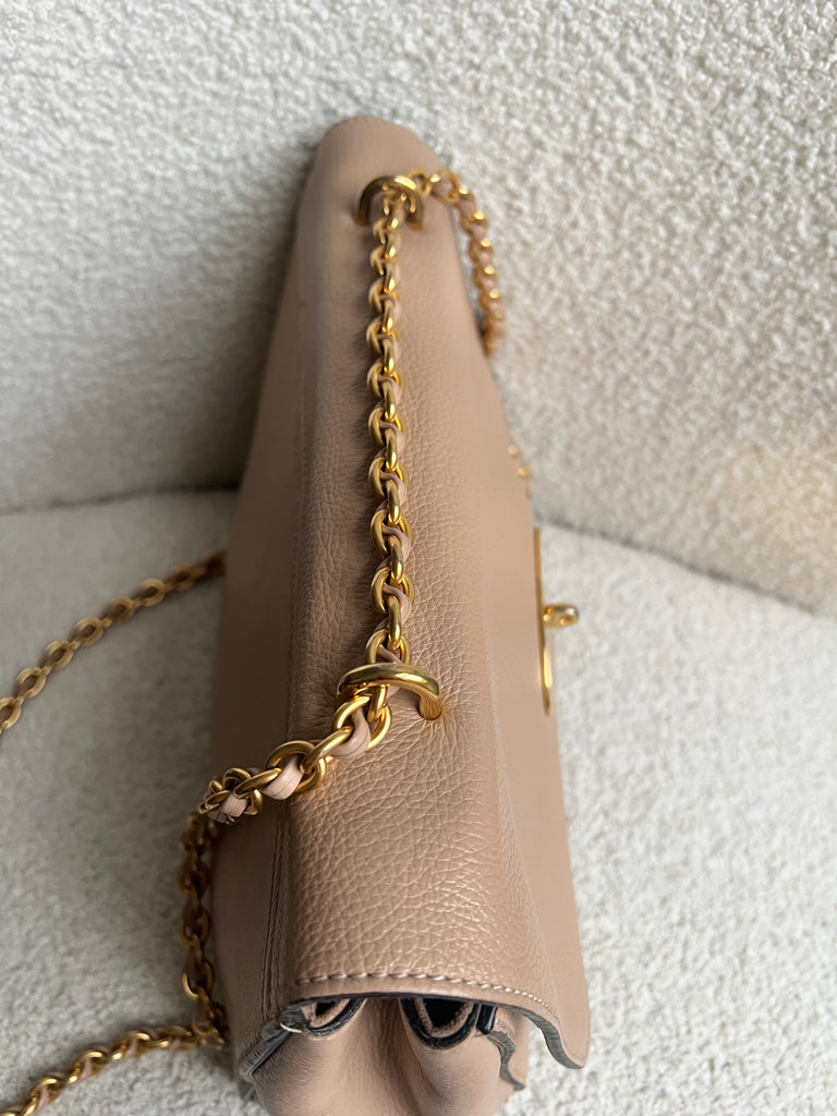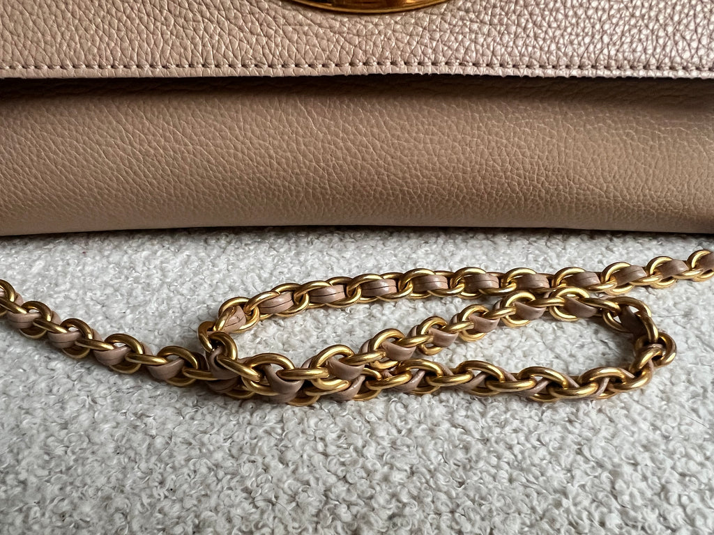 Mulberry Medium Lily in Rosewater Small Classic Grain with gold hardware. The Lily is an effortlessly elegant style with a compact shape. The ultimate evening bag, this style can also be used for day or event wear. The woven leather and chain strap can be worn short or long, and the Lily features the iconic postmans lock and padlock. Can be worn over shoulder or crossbody.