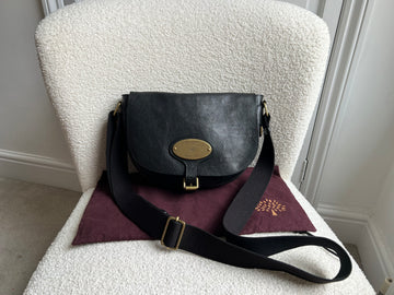 Mulberry Bonnie Satchel in Black Natural Leather with brass hardware. This older style is sought after and doesn’t come up preloved often. The natural leather is beautiful and ages well. This item is practical in size and half moon shape and can be worn over shoulder or cross body using the long adjustable canvas strap.
