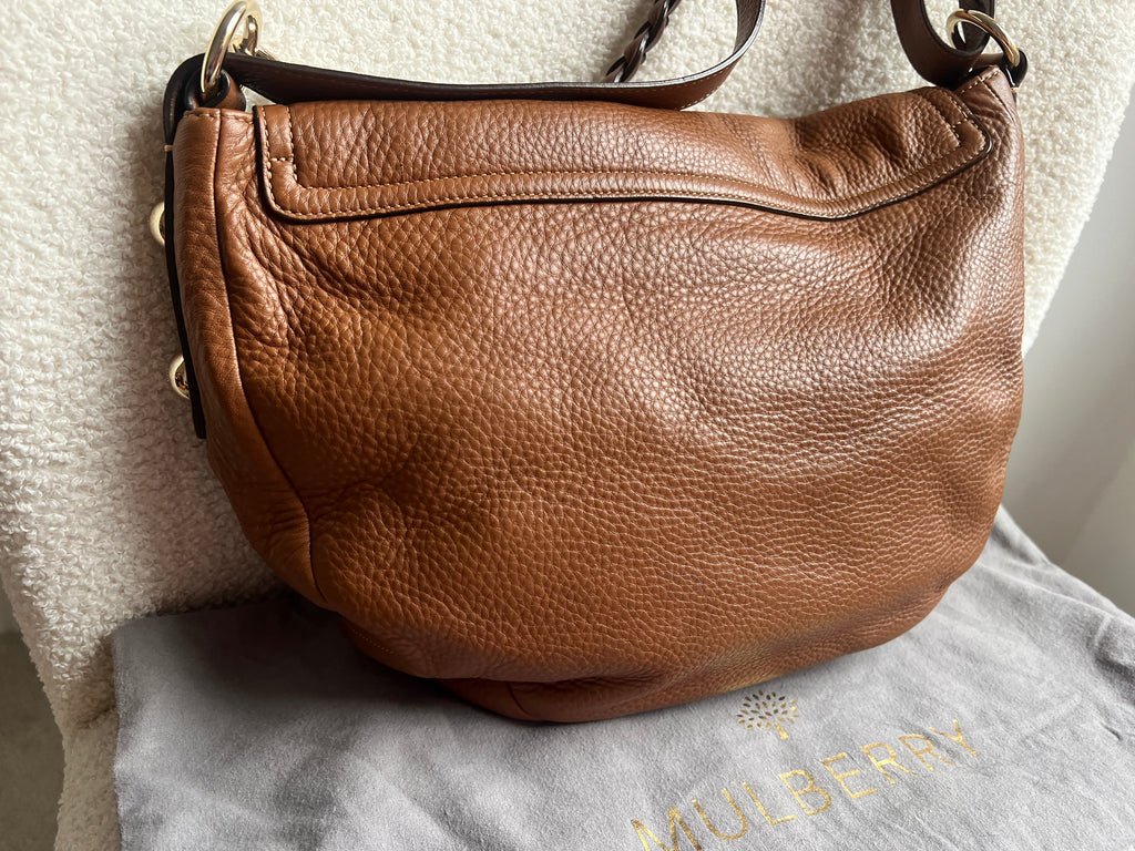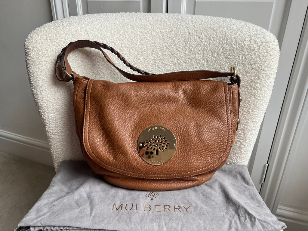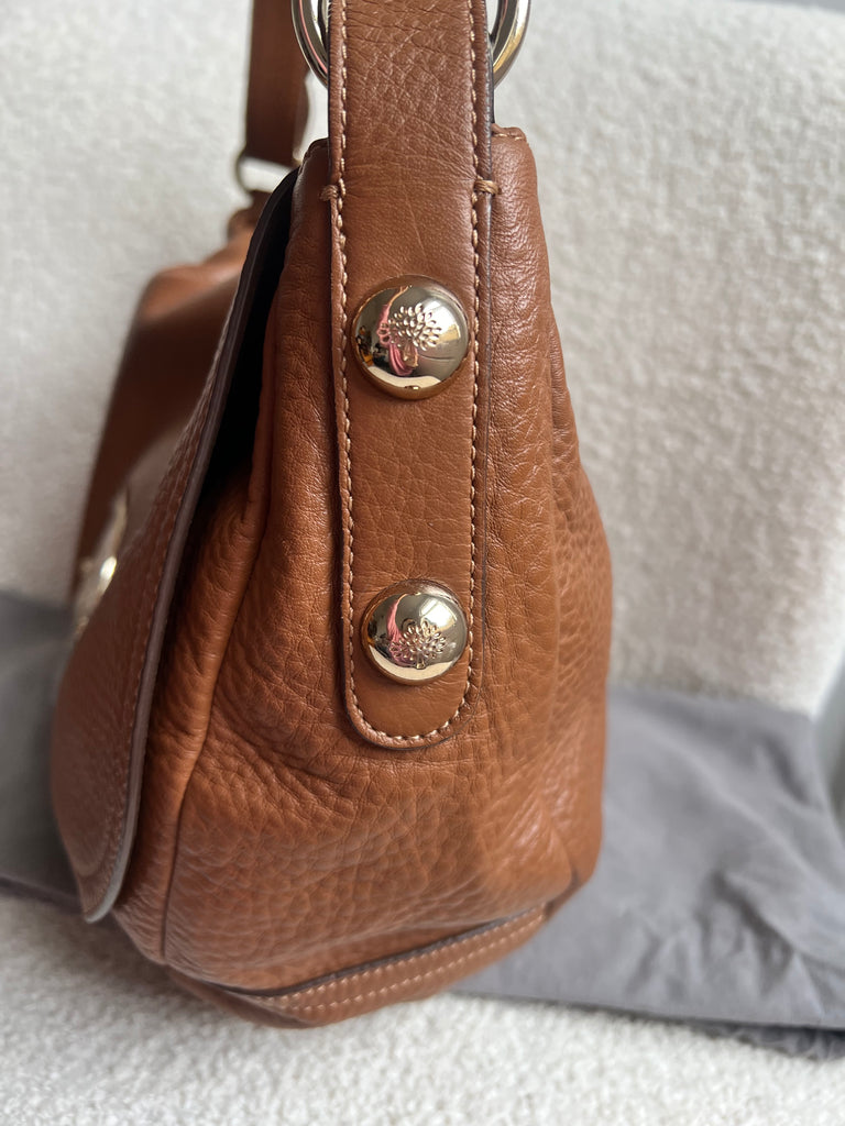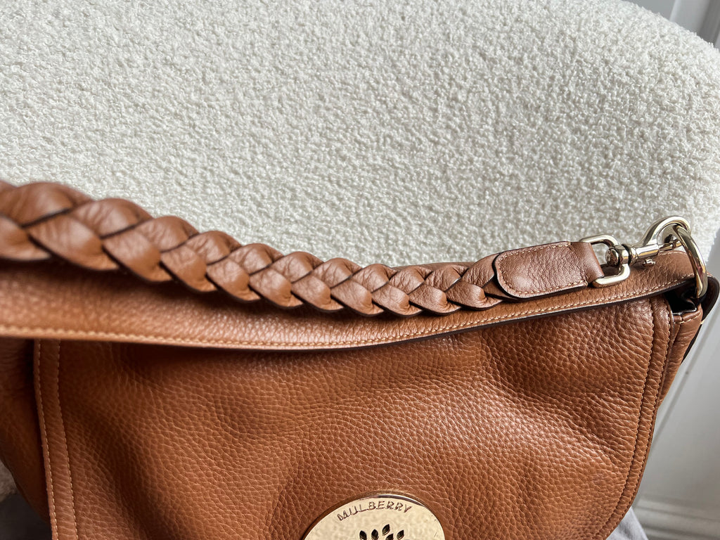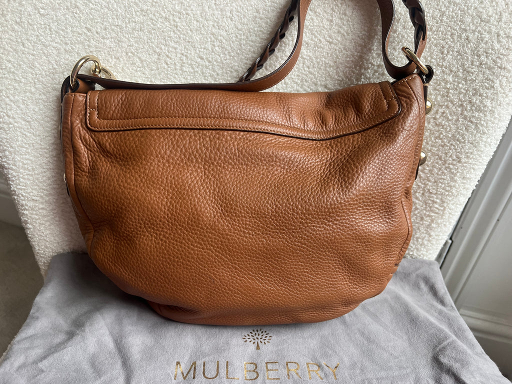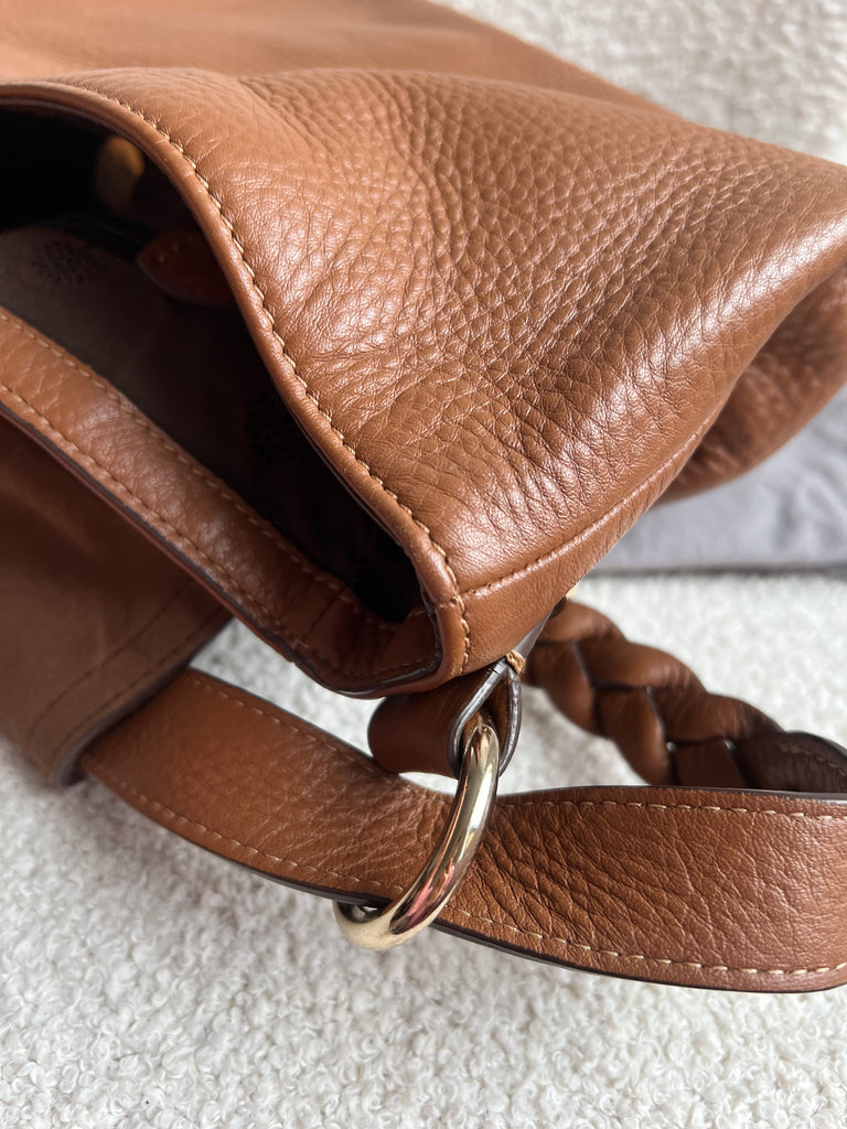 Mulberry Daria Satchel in Oak Spongy Pebbled Leather with gold hardware. This medium sized satchel has a slouchy shape and is stunning in the thick, soft, spongy pebbled leather. Featuring the mulberry round plaque, flap and magnetic closure - the part braided strap can be worn doubled up or single and longer. This style is now discontinued at Mulberry. Ideal for day to day or work use. Can be carried in over shoulder or cross body.