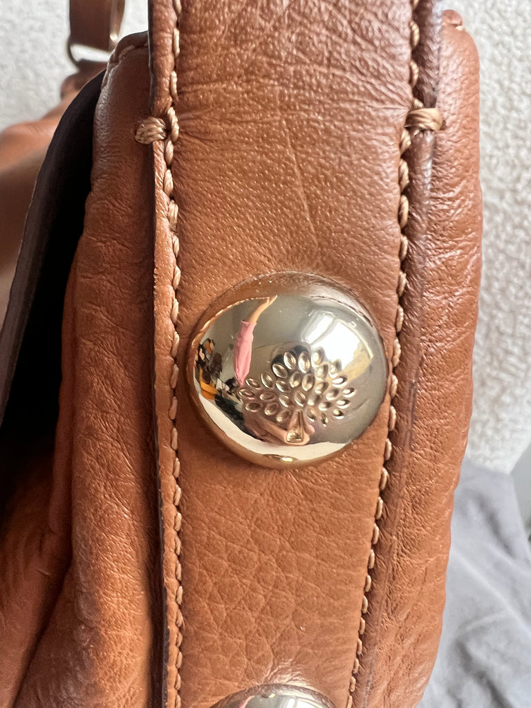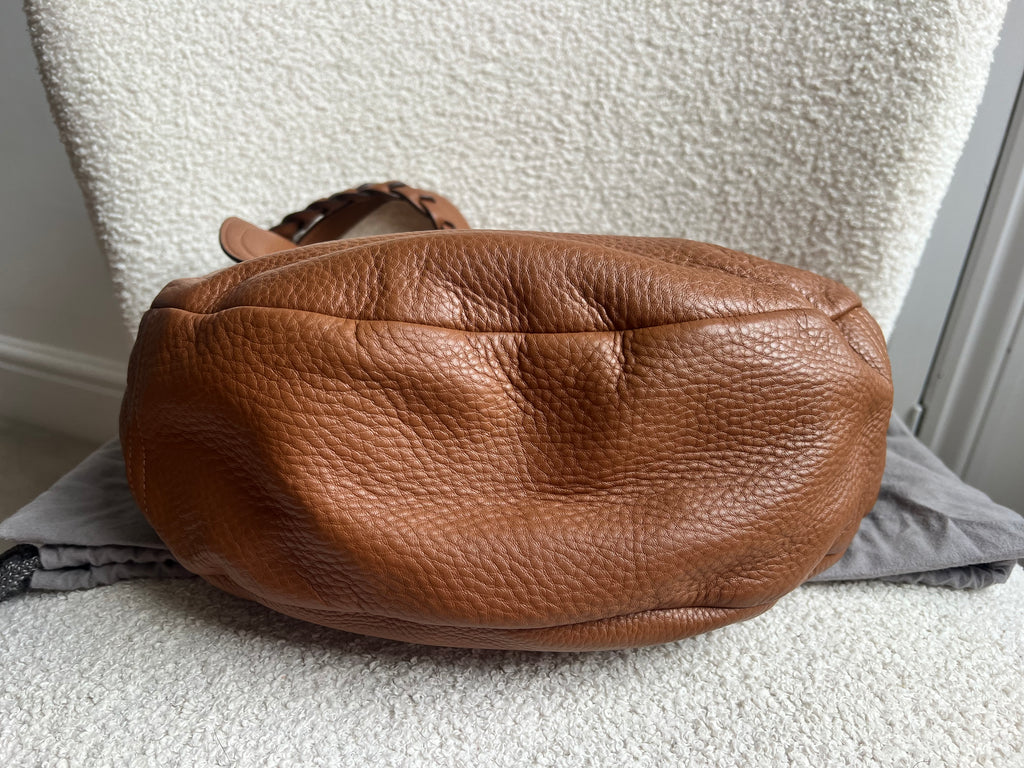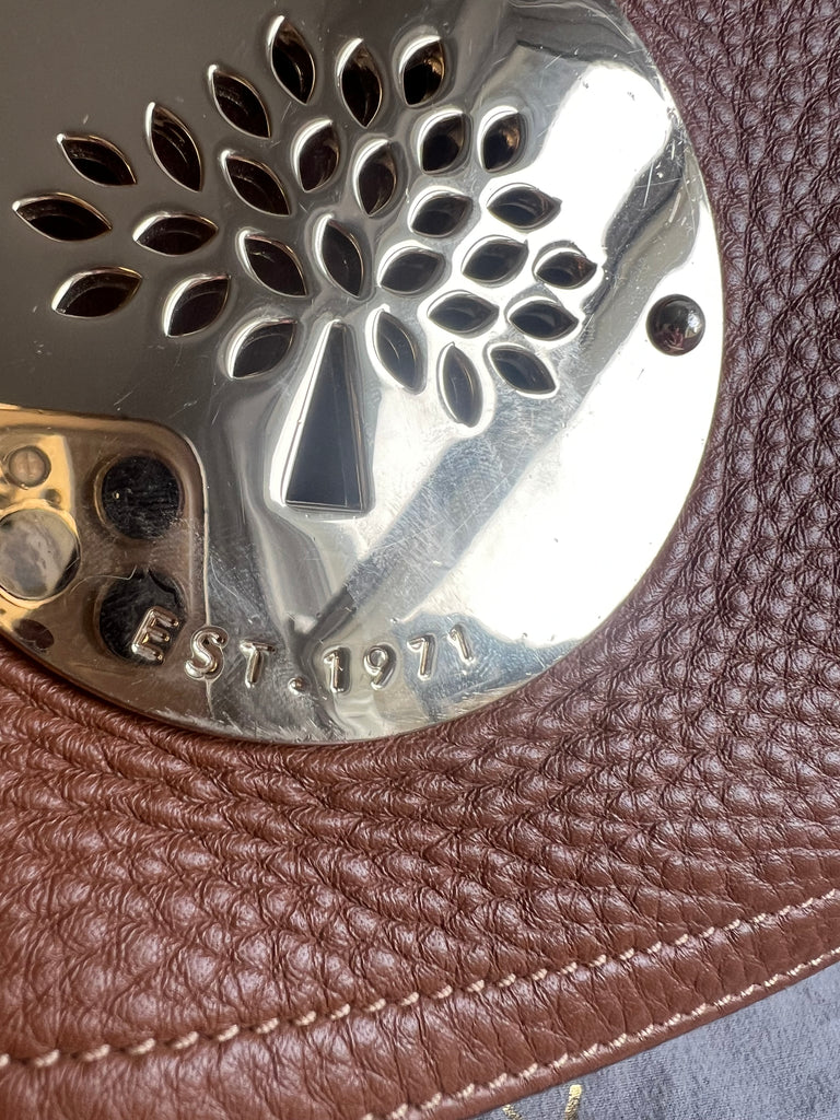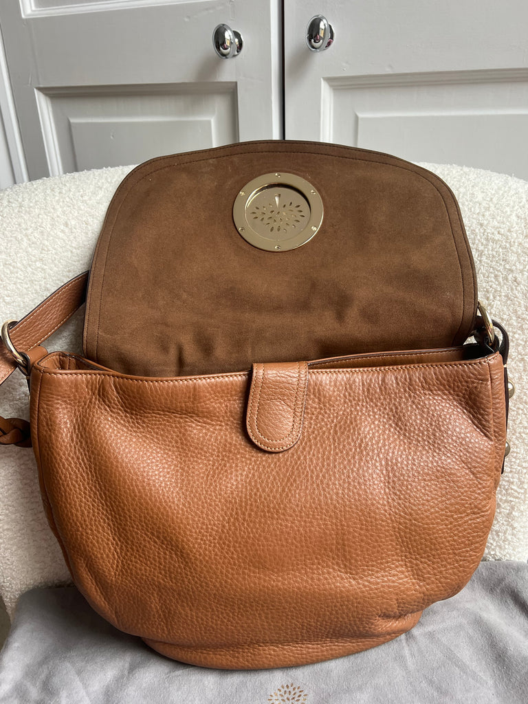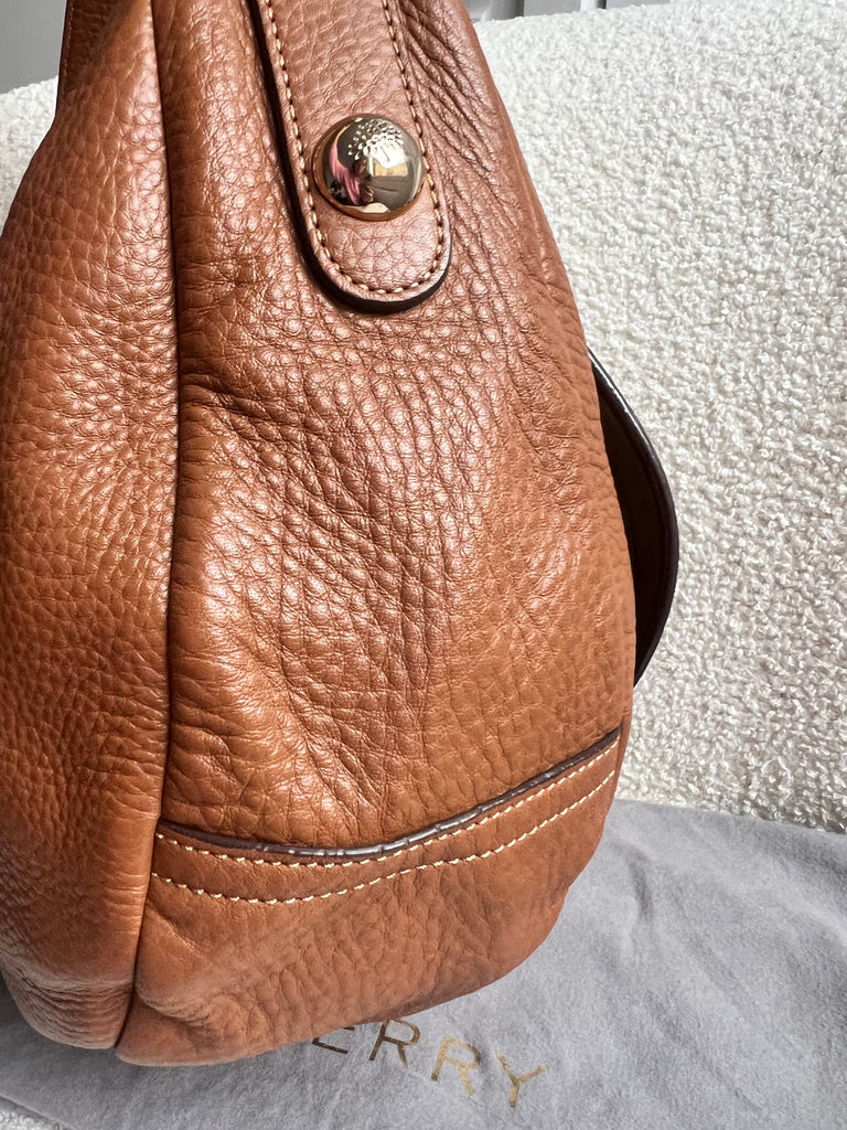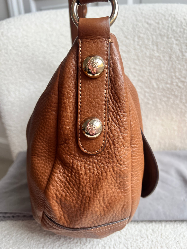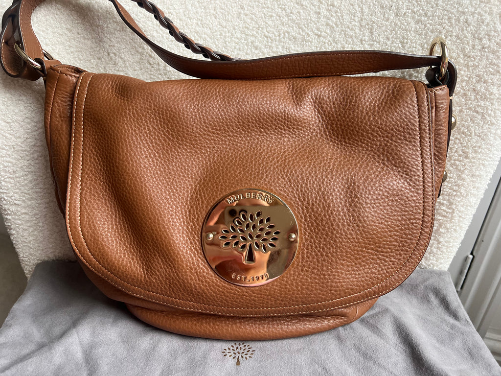 Mulberry Daria Satchel in Oak Spongy Pebbled Leather with gold hardware. This medium sized satchel has a slouchy shape and is stunning in the thick, soft, spongy pebbled leather. Featuring the mulberry round plaque, flap and magnetic closure - the part braided strap can be worn doubled up or single and longer. This style is now discontinued at Mulberry. Ideal for day to day or work use. Can be carried in over shoulder or cross body.