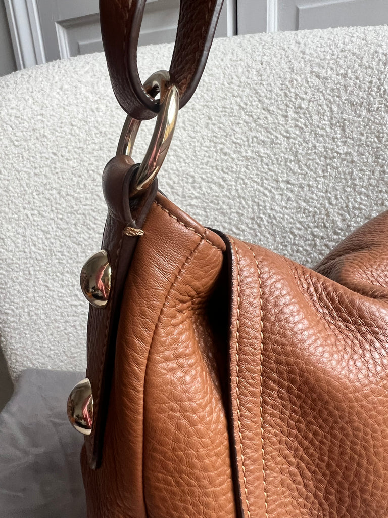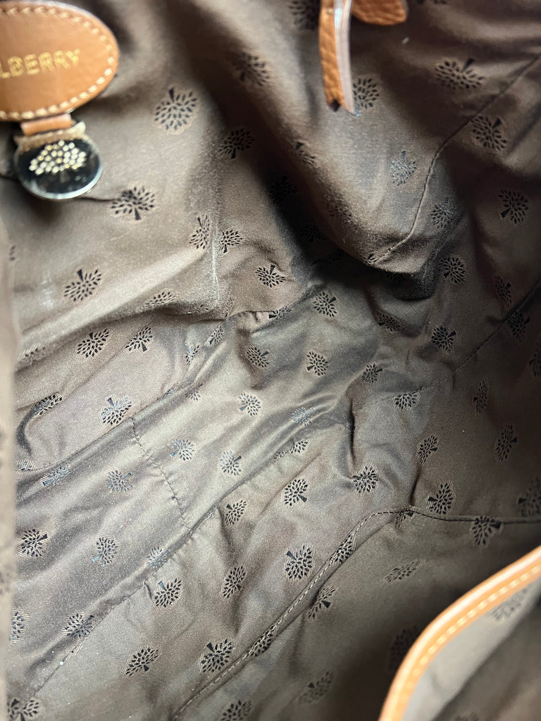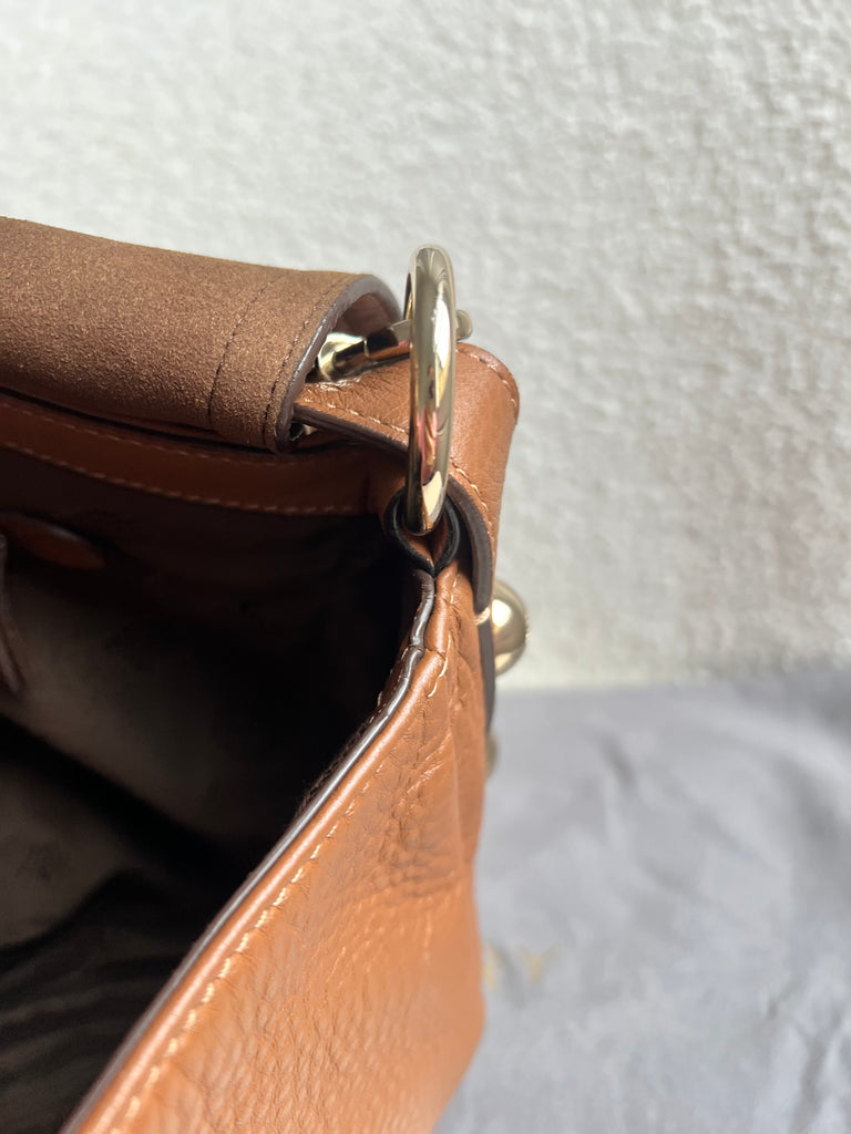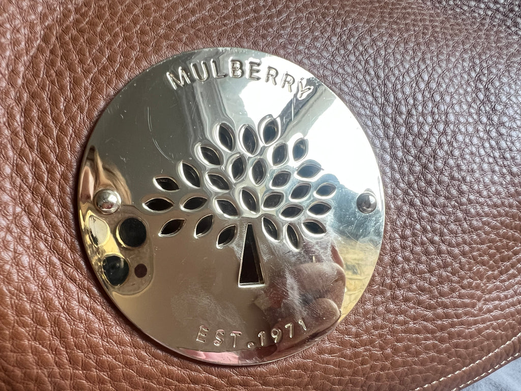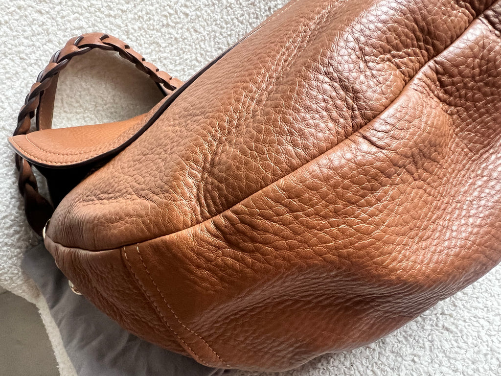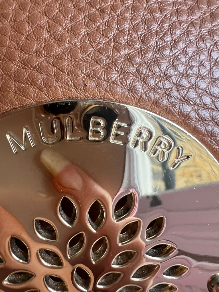Mulberry Daria Satchel in Oak Spongy Pebbled Leather with gold hardware. This medium sized satchel has a slouchy shape and is stunning in the thick, soft, spongy pebbled leather. Featuring the mulberry round plaque, flap and magnetic closure - the part braided strap can be worn doubled up or single and longer. This style is now discontinued at Mulberry. Ideal for day to day or work use. Can be carried in over shoulder or cross body.