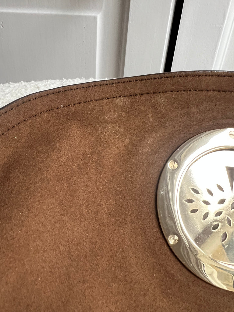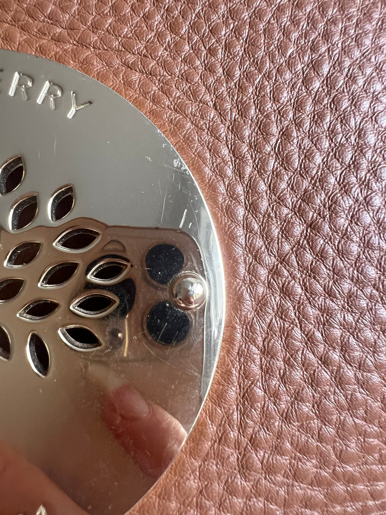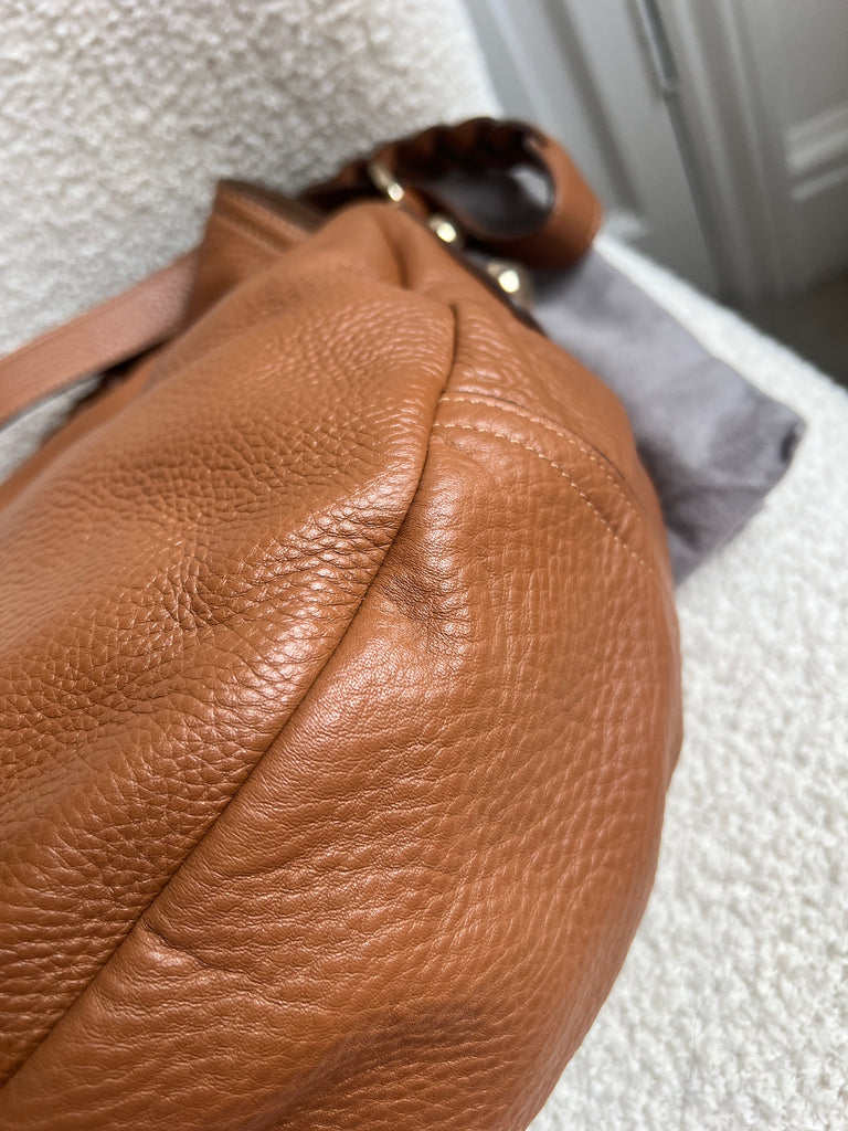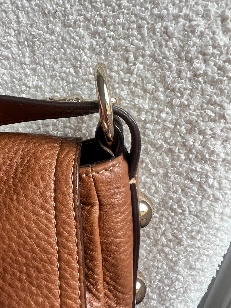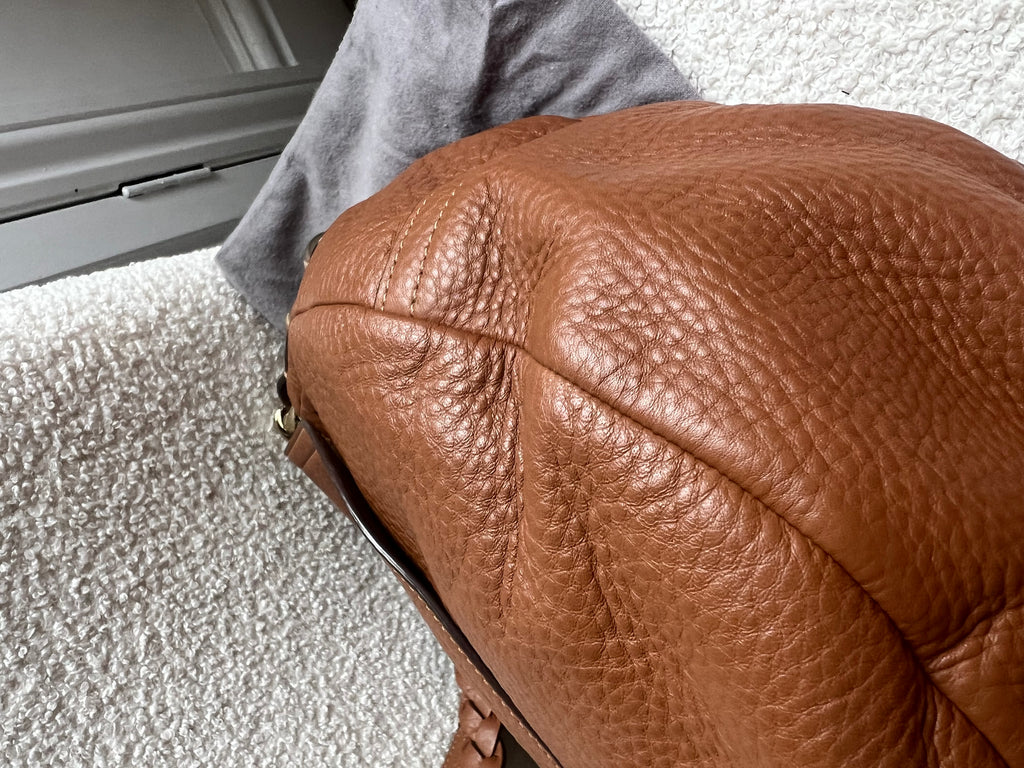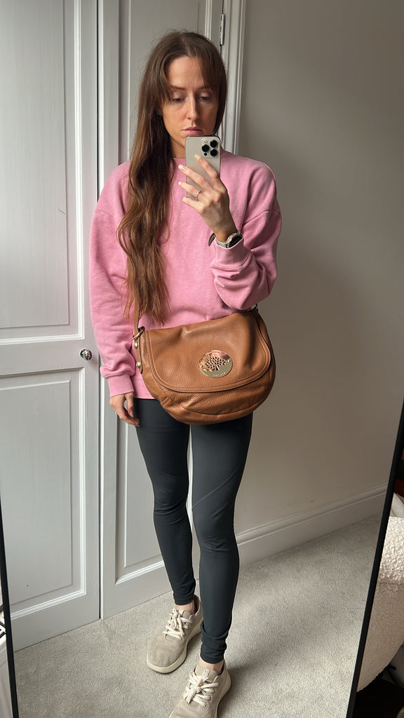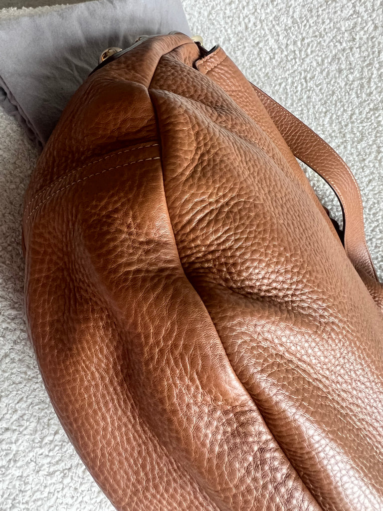 Mulberry Daria Satchel in Oak Spongy Pebbled Leather with gold hardware. This medium sized satchel has a slouchy shape and is stunning in the thick, soft, spongy pebbled leather. Featuring the mulberry round plaque, flap and magnetic closure - the part braided strap can be worn doubled up or single and longer. This style is now discontinued at Mulberry. Ideal for day to day or work use. Can be carried in over shoulder or cross body.