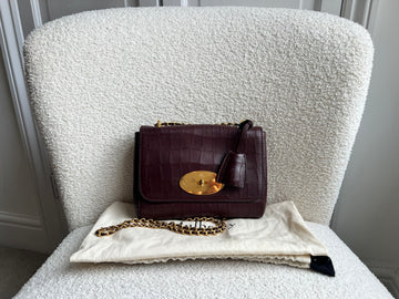 Mulberry Regular Lily in Oxblood Deep Embossed Croc Print with pale gold hardware. The Lily is an effortlessly elegant style with a compact shape. The ultimate evening bag, this style can also be used for day or event wear. The woven leather and chain strap can be worn short or long, and the Lily features the iconic postmans lock. Can be worn over shoulder or cross body.