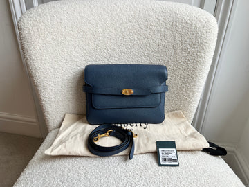 Mulberry Belted Bayswater Satchel in Pale Navy Small Classic Grain leather with gold hardware. This casual and chic crossbody style features the classic postmans lock, and combines design features from the iconic bag with a practical construction for modern lifestyle. Ideal for day to day use for those who prefer cross body and small - medium sized bags. Can be worn over shoulder or cross body. Image 2 shows rust version for size reference.