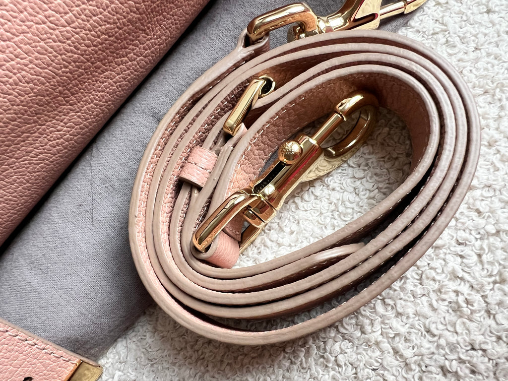 Mulberry Regular Alexa in Rose Petal Goat Printed Calfskin with pale gold hardware. This "old" style of Alexa is timeless in a pale pink shade. The Alexa is a roomy and practical style with postmans lock closure. Can be carried in hand using the top handle or worn over shoulder or cross body using the long detachable strap.