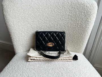 Mulberry Small Darley in Black Quilted Smooth Calf leather with silver hardware. A classic evening bag with the iconic postman lock detailing. Perfect for evening or event wear for carrying the essentials. Can be worn cross body using the chain or held as a handheld clutch.