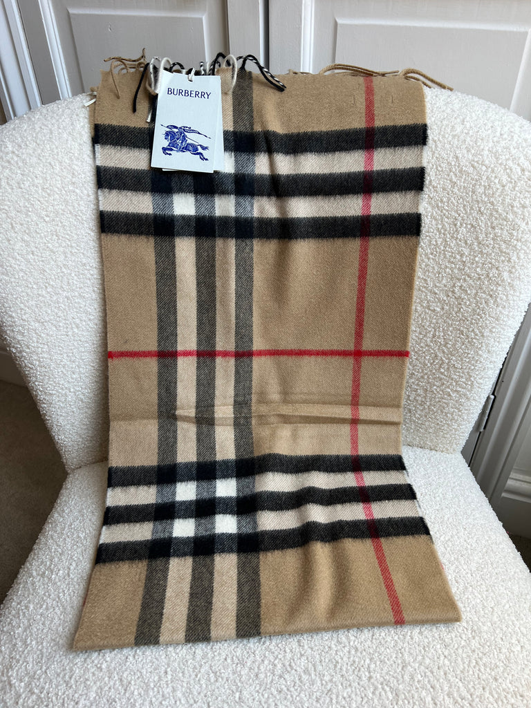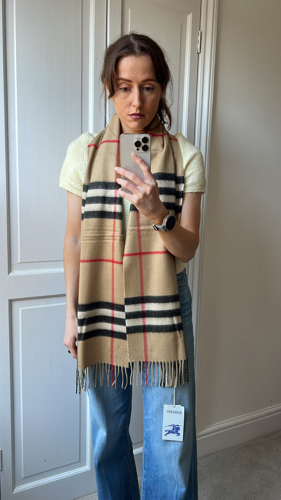 Burberry Classic Check Scarf in Archive Beige Cashmere. The classic iconic scarf is a must have accessory for winter. Goes with almost any outfit and has a super soft finish.