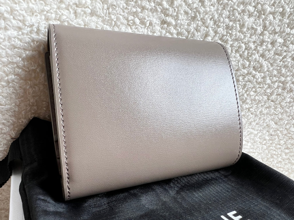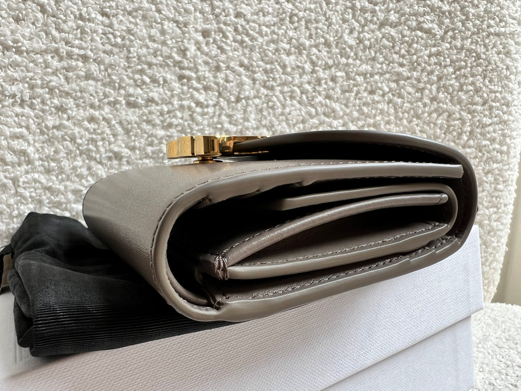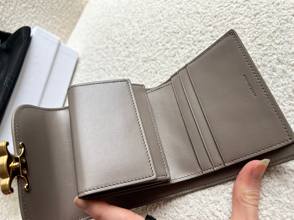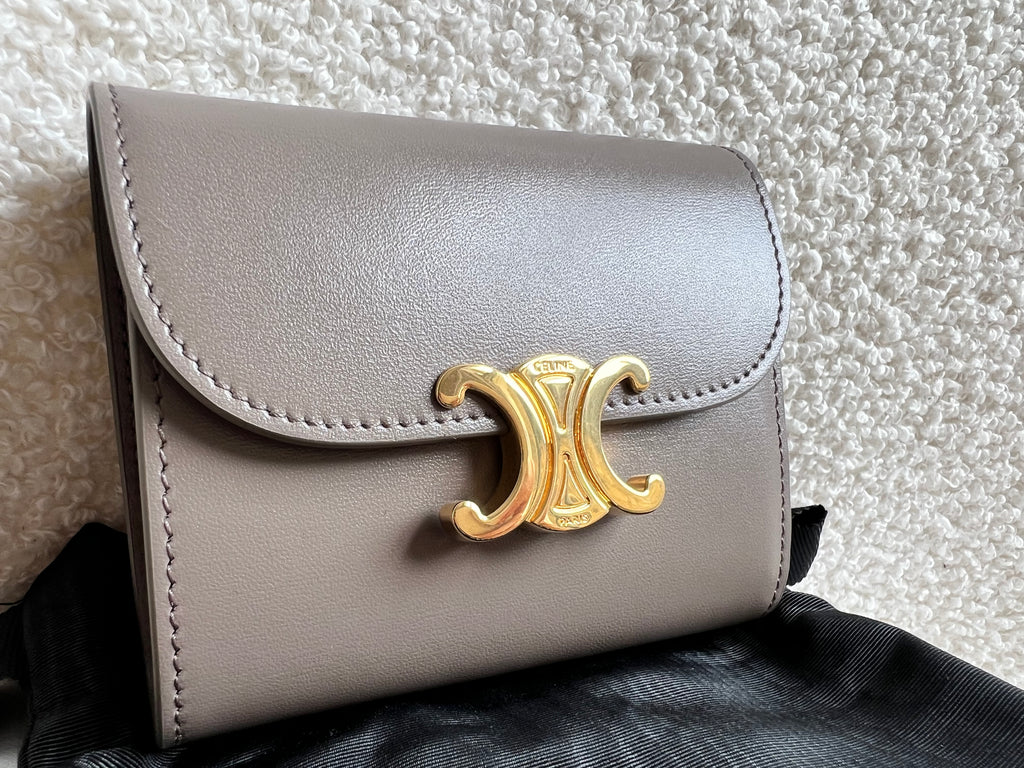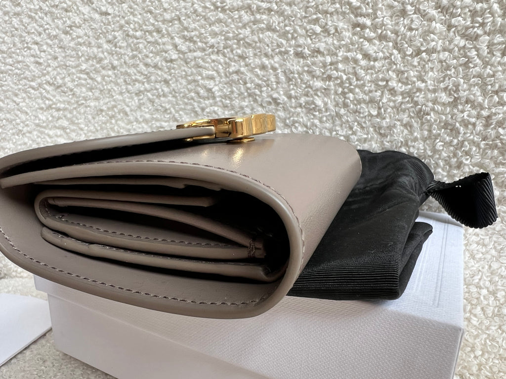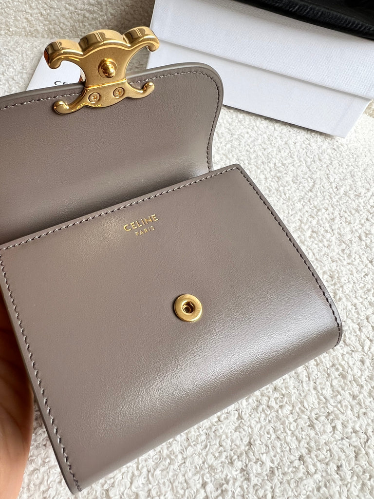 Celine Triomphe Small Flap Wallet in Pebble Shiny Calfskin with gold hardware. This Small wallet features a snap closure, and various slots and compartments. Colour is a taupe shade.