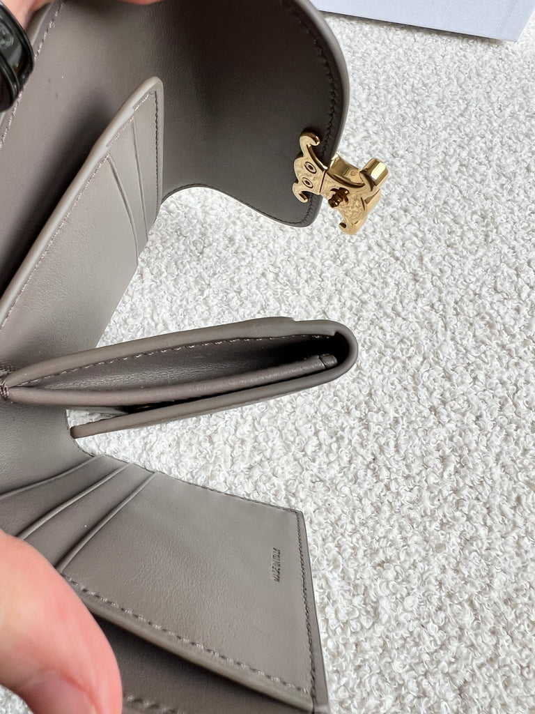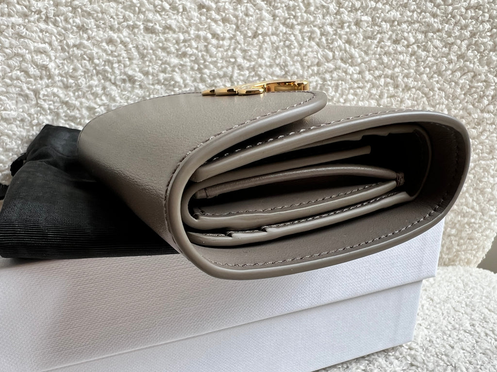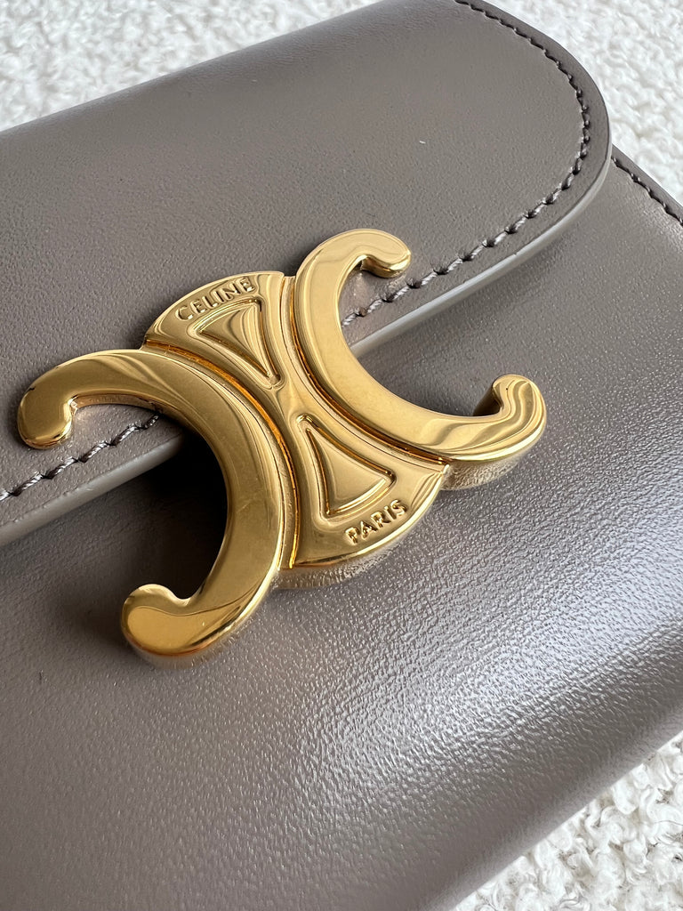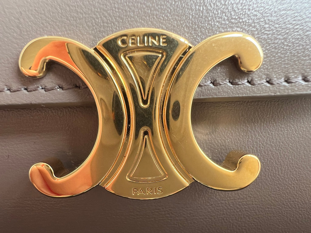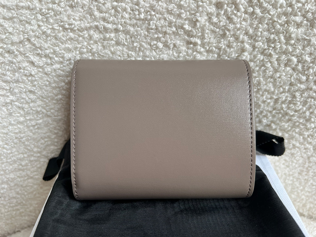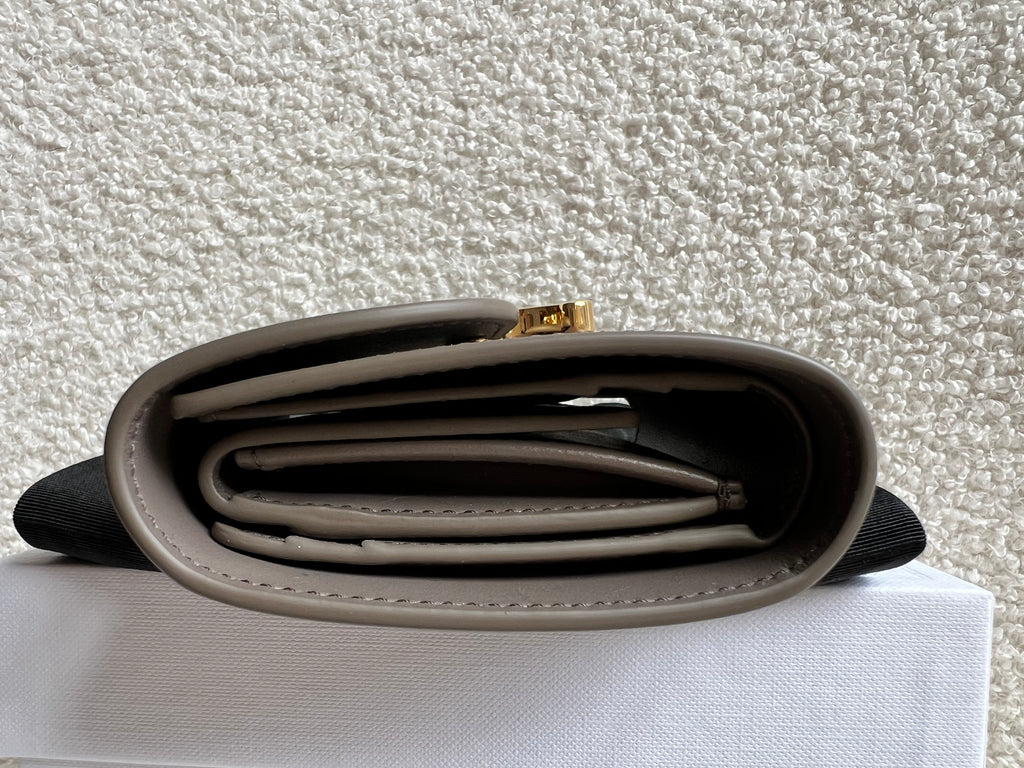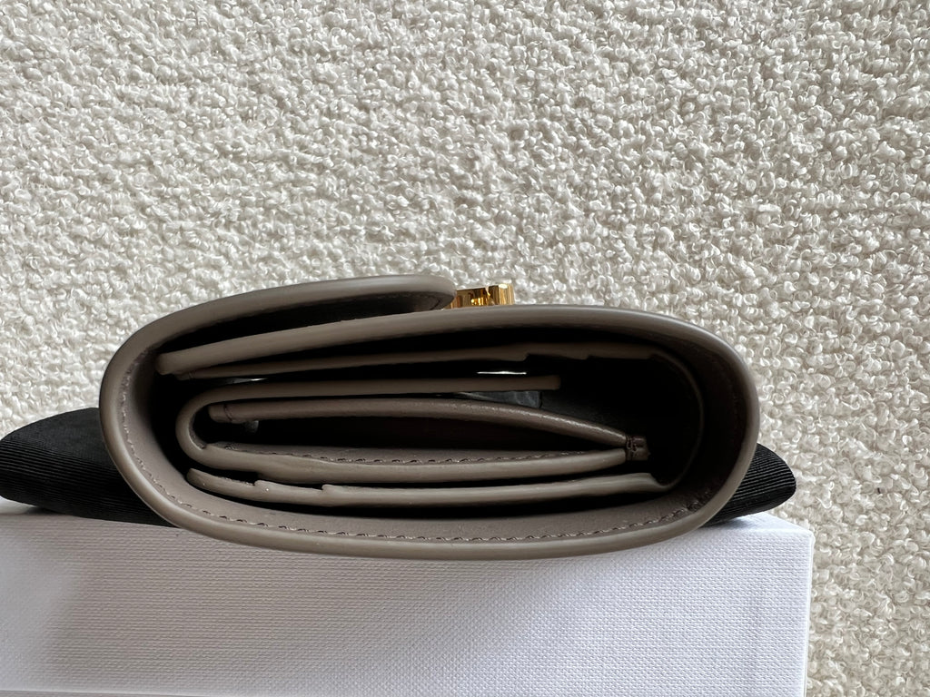 Celine Triomphe Small Flap Wallet in Pebble Shiny Calfskin with gold hardware. This Small wallet features a snap closure, and various slots and compartments. Colour is a taupe shade.