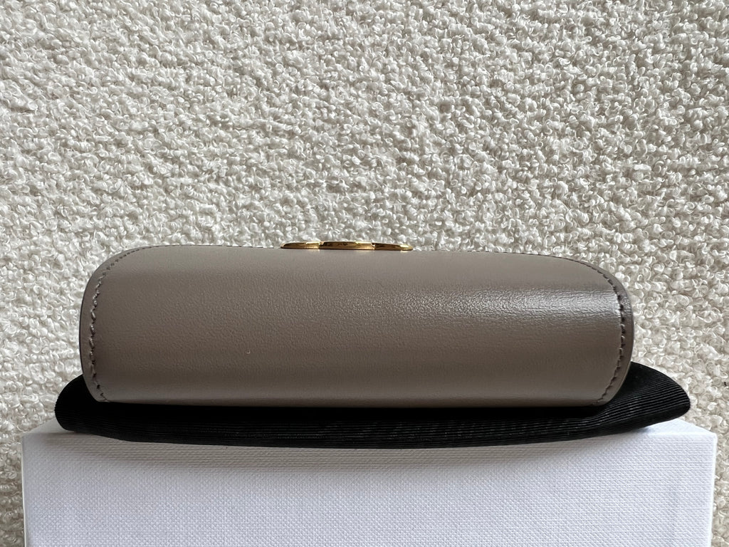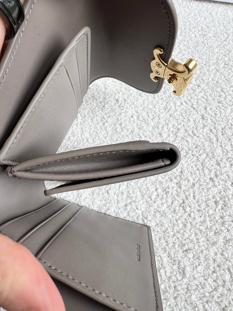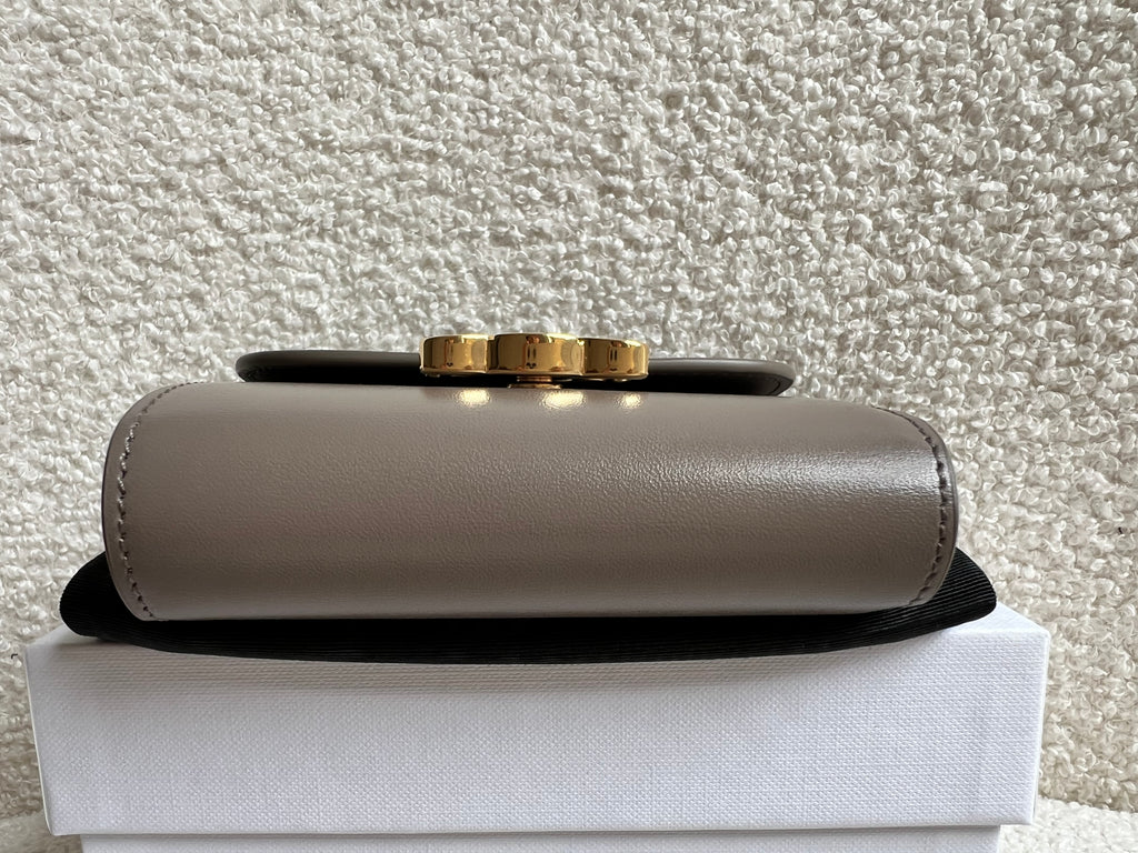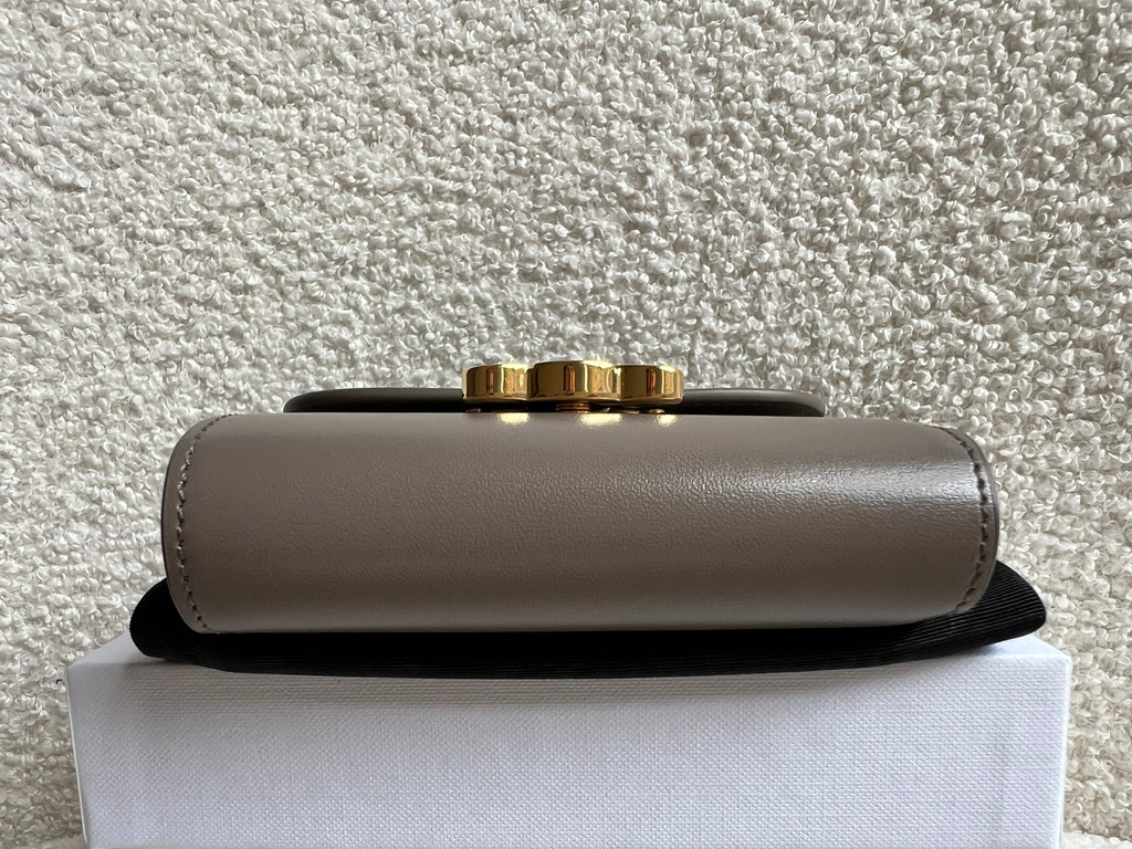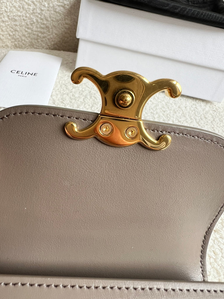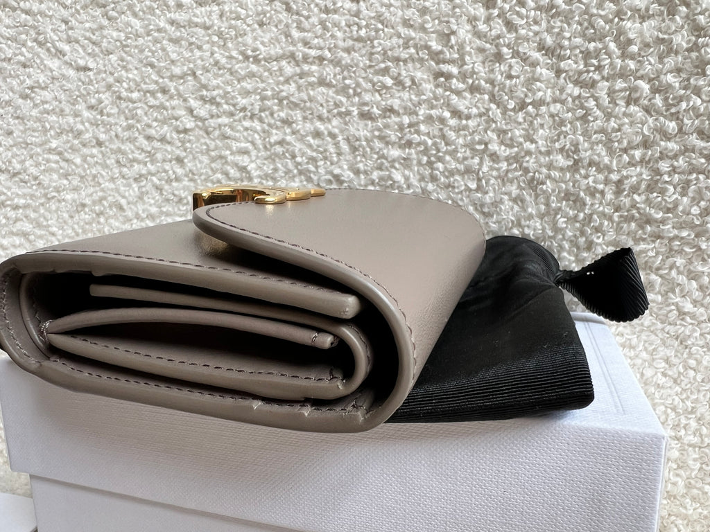 Celine Triomphe Small Flap Wallet in Pebble Shiny Calfskin with gold hardware. This Small wallet features a snap closure, and various slots and compartments. Colour is a taupe shade.