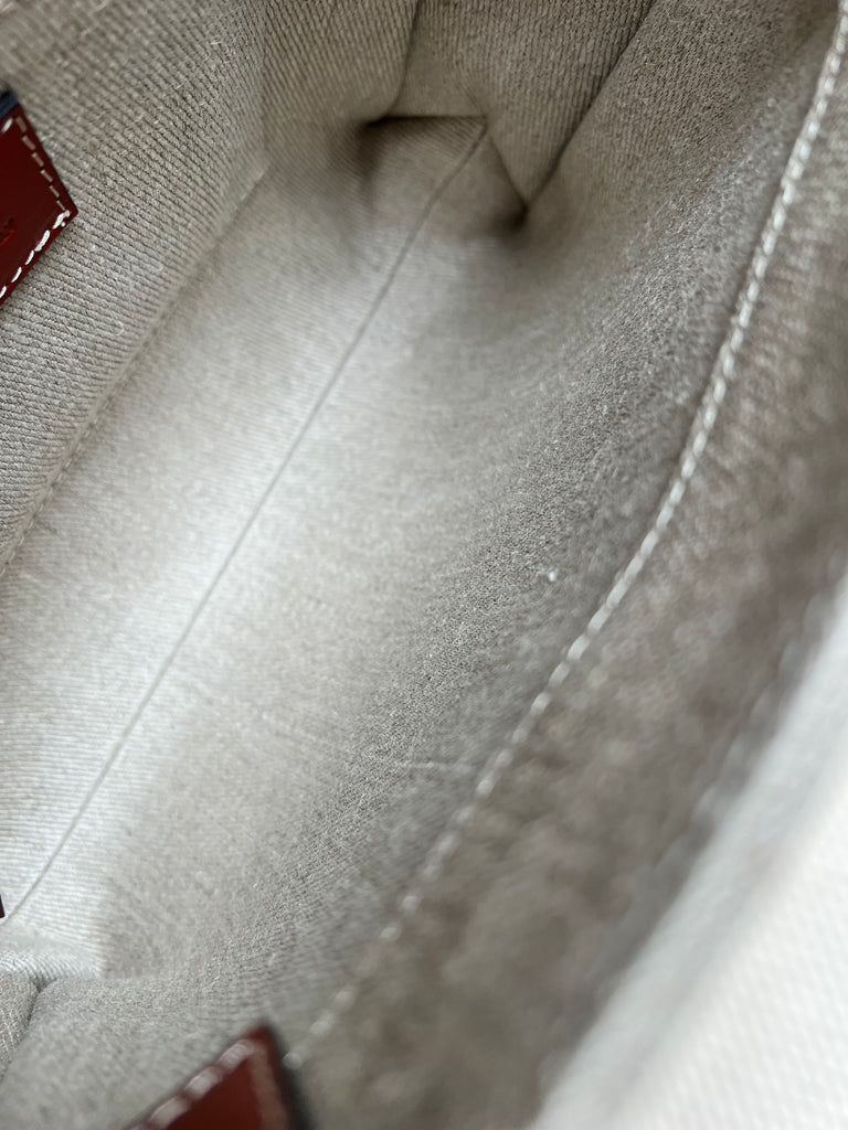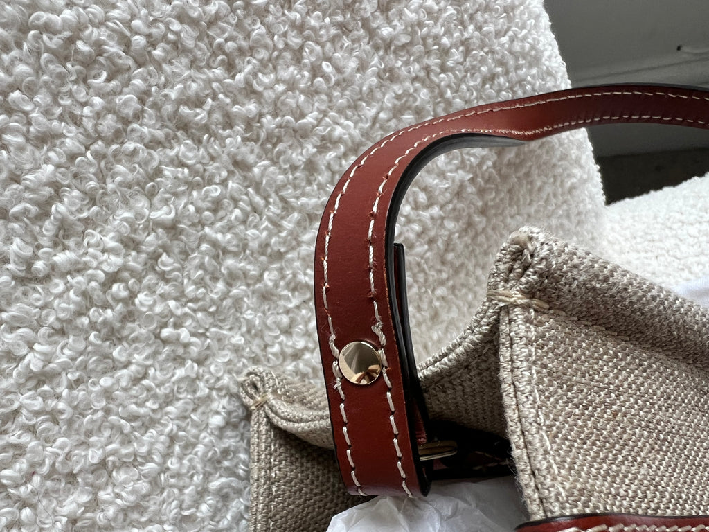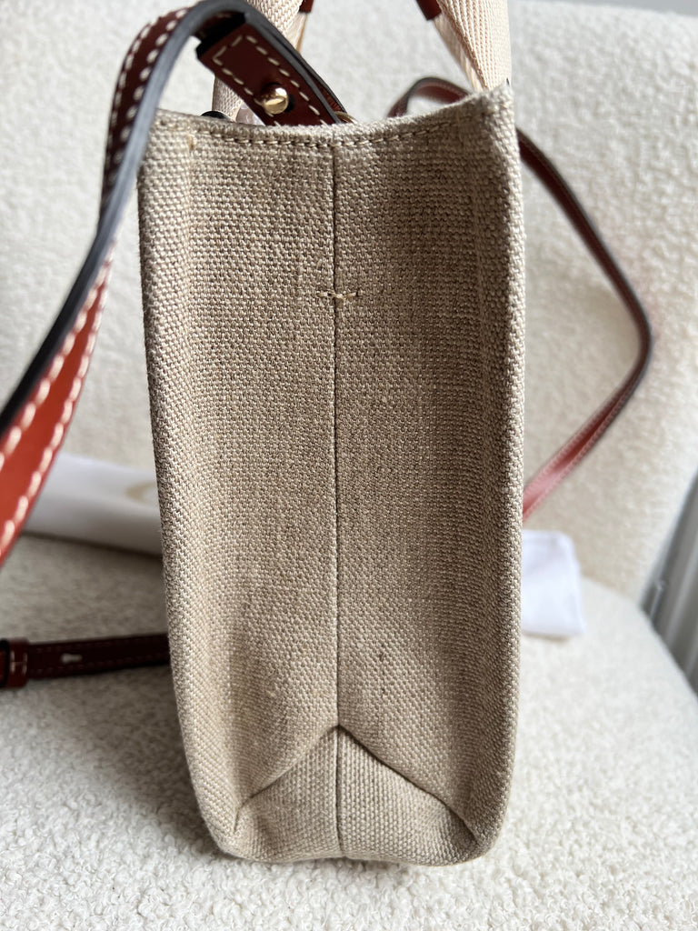 Chloe Small Woody Tote in Soft Tan Linen with calfskin strips gold hardware. The Woody line is characterised by the signature Chloé logo and showcases a modern, minimalist silhouette.Crafted from the lower impact linen canvas. The small Woody tote bag is a soft day-to-evening bag with a long, removable strap in addition to the top handles. The roomy inside compartment includes a practical flat pocket in leather for an elevated touch. Can be carried in hand or cross body using the long strap.