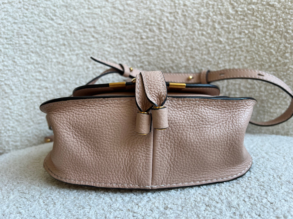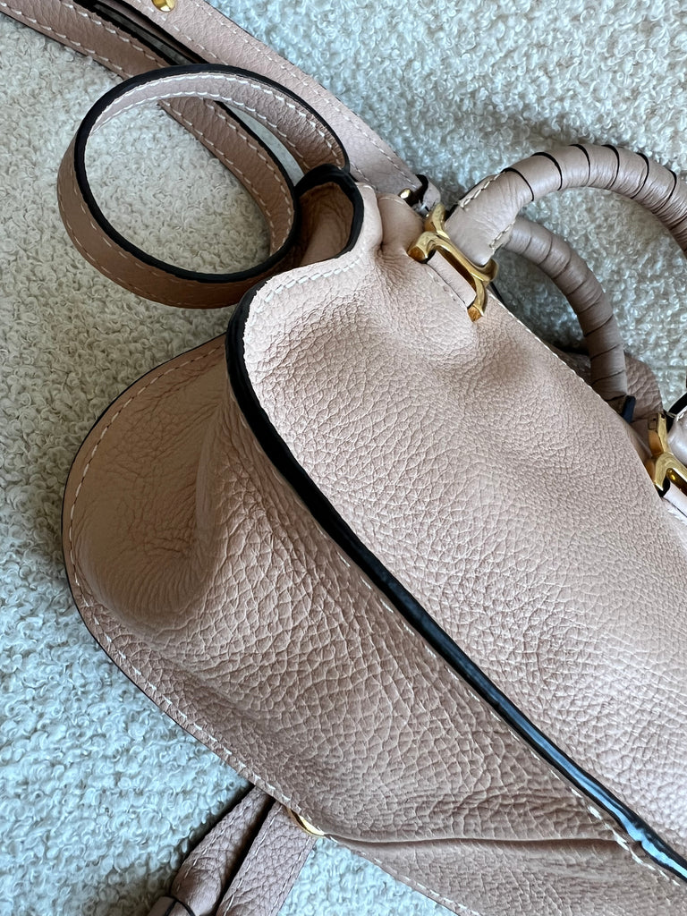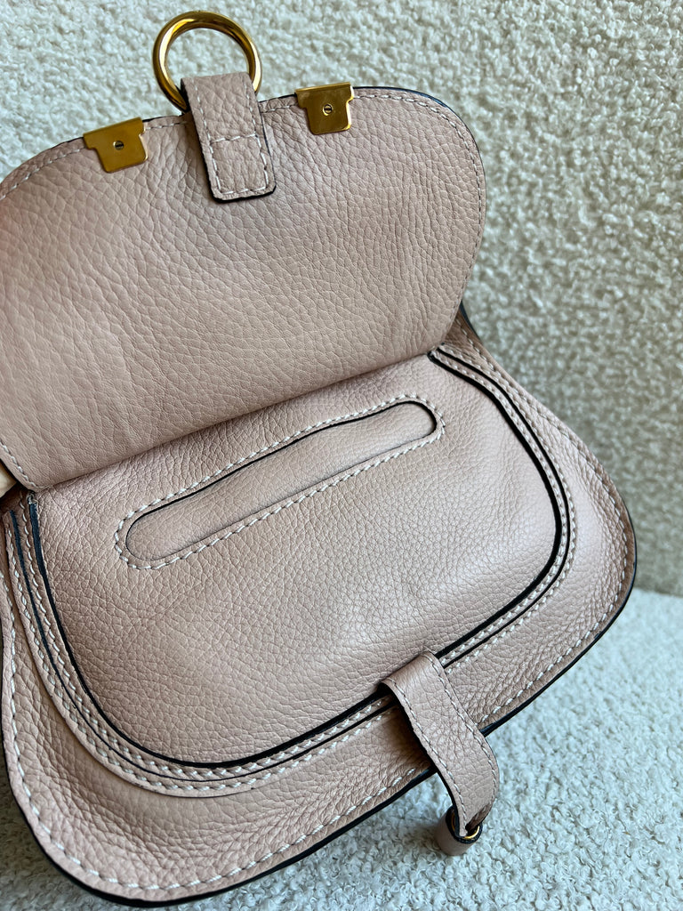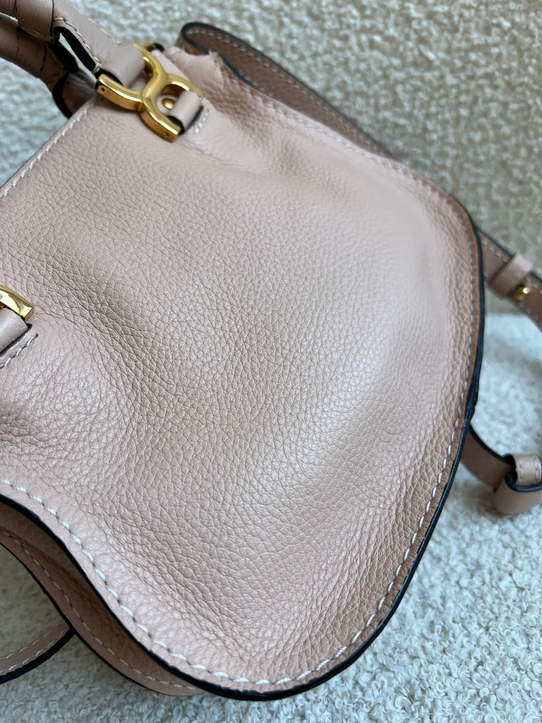 Chloe Mini Marcie Bag in Softy Pink Small Grain Calfskin with gold hardware. This mini size satchel style is crafted in a durable, slightly slouchy calfskin. Perfect for those who prefer smaller bags for day or night wear. Can be carried by the top handle or worn cross body using the detachable leather strap. Flap closure with iconic detailing on front pocket with zipper closure for main compartment for easy yet secure access. Current season at Chloe. Colour is a pale nude with pink undertones.