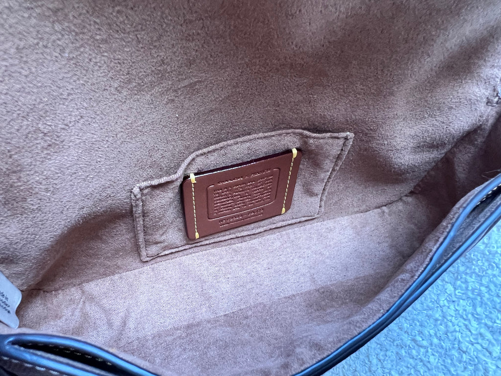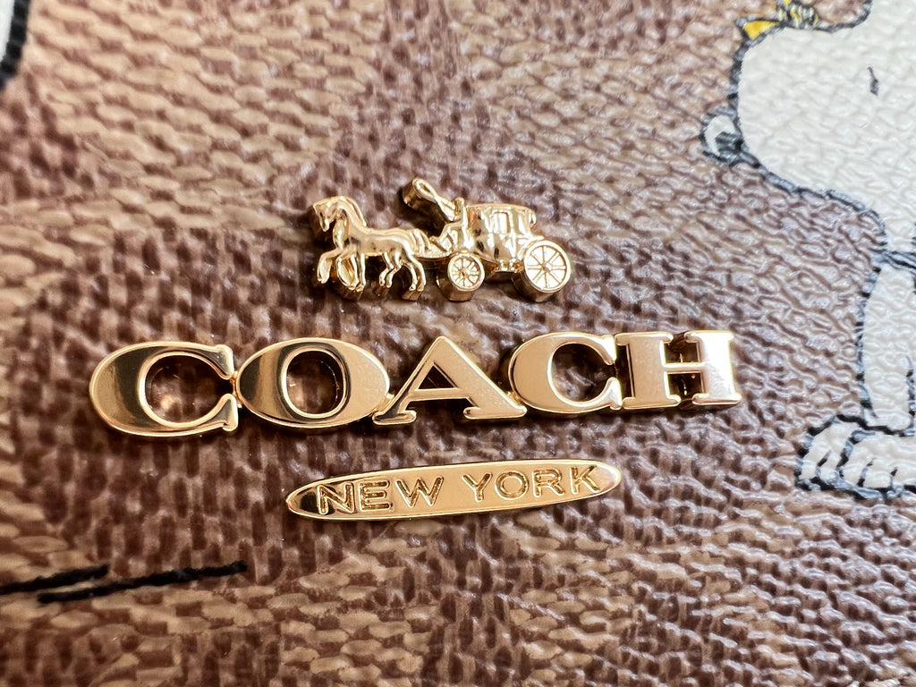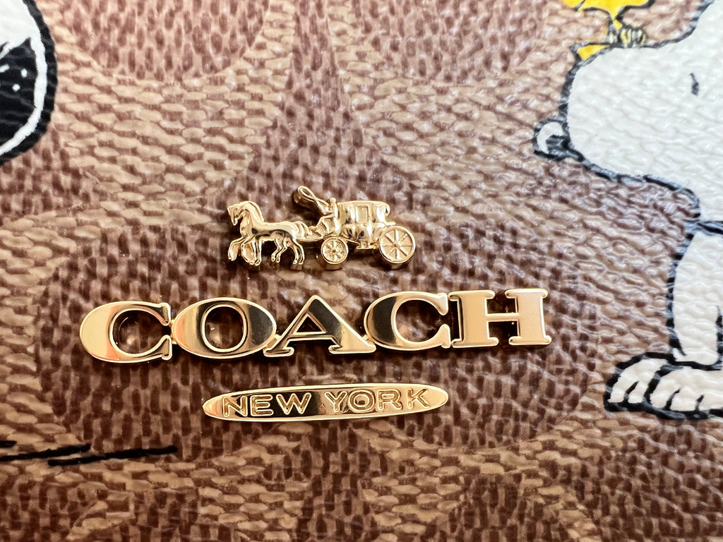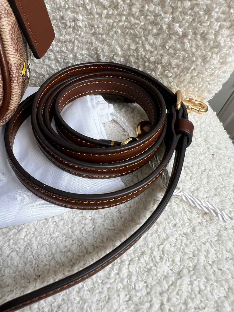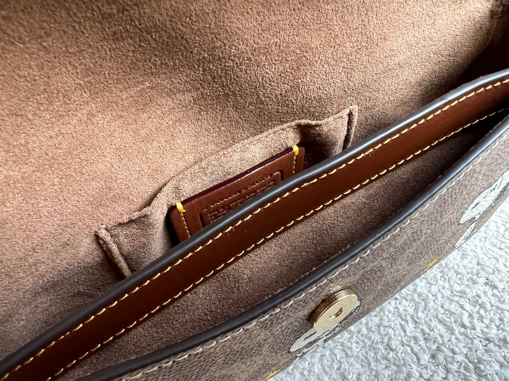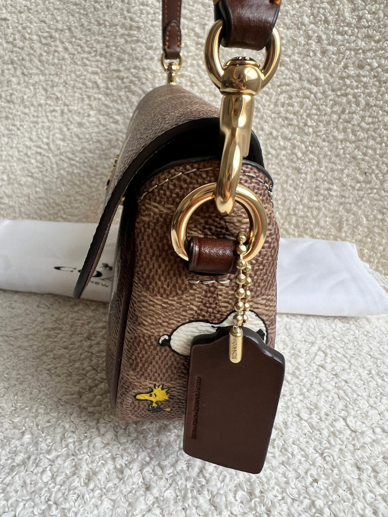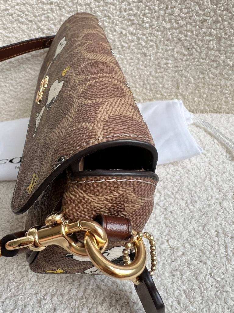 Coach x Peanuts Hayley Flap bag in coated canvas and gold hardware. This small size bag has multiple carry options and is a cute addition to an outfit. Featuring both a top handle and long strap it can be worn cross body.