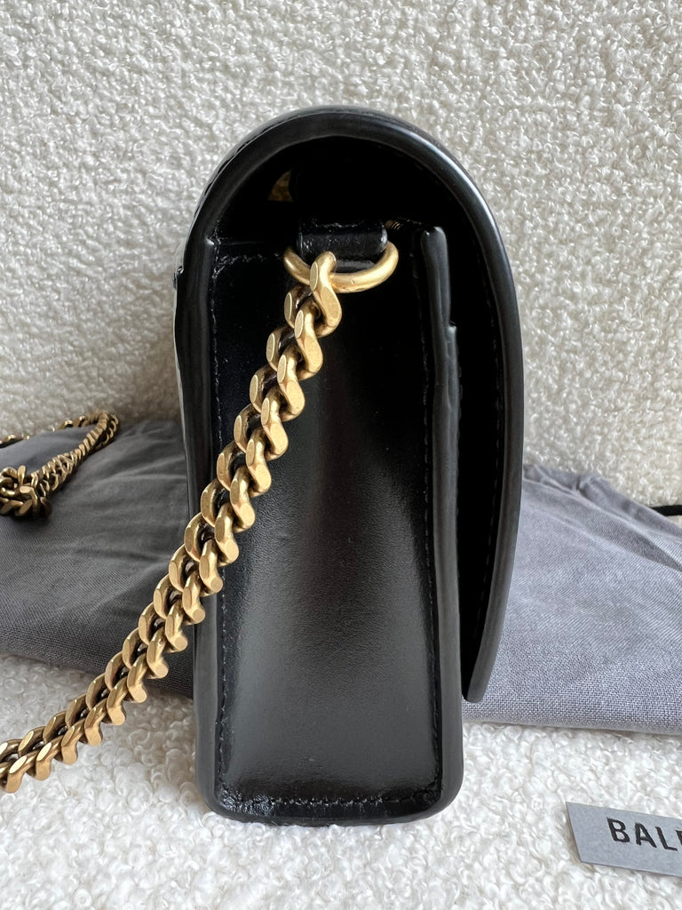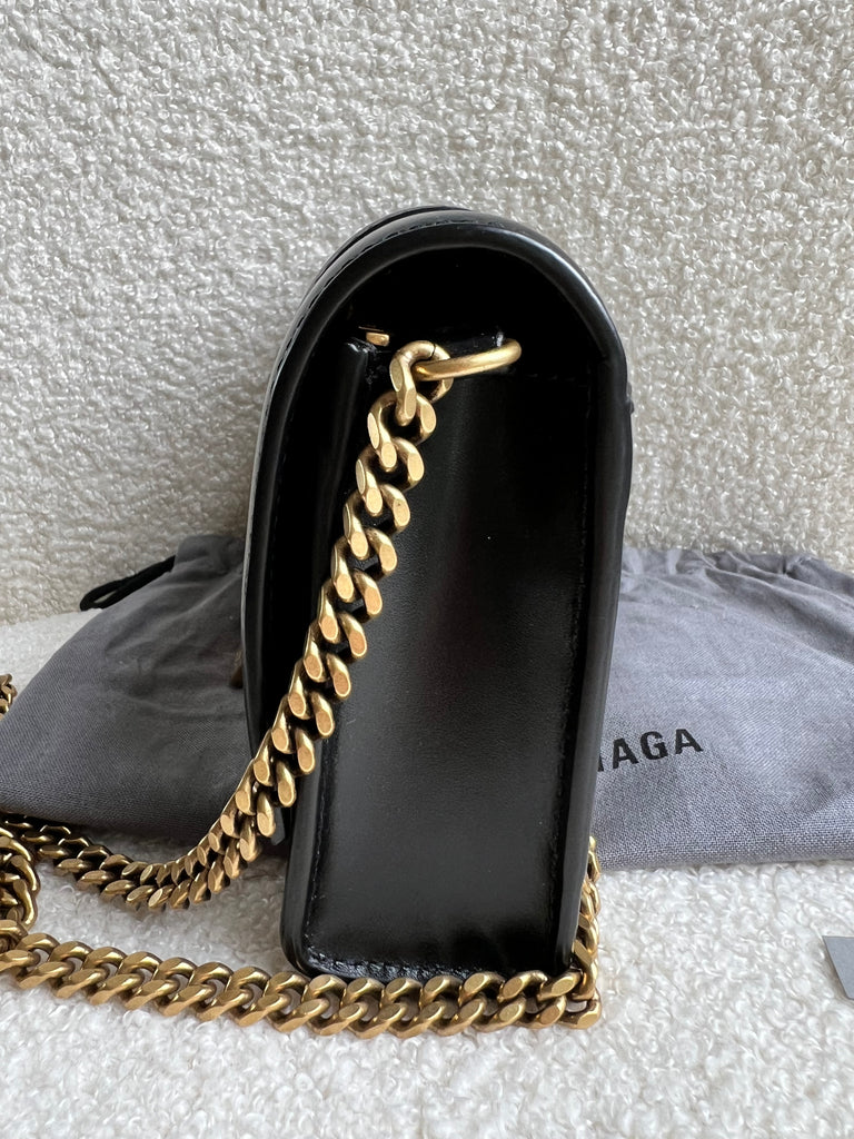 Balenciaga Hourglass Wallet on Chain Bag in black shiny box calfskin leather with aged gold hardware. Trendy and chic, the hourglass is a popular style with influencers and celebrities. With its structured shape, closure is by magnetic popper. This mini sized bag can be carried over shoulder or cross body. Could also be used as handheld clutch with strap removed.
