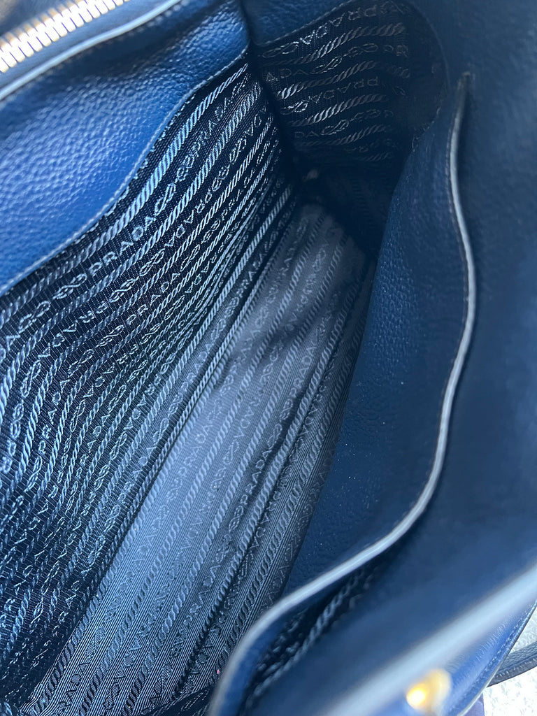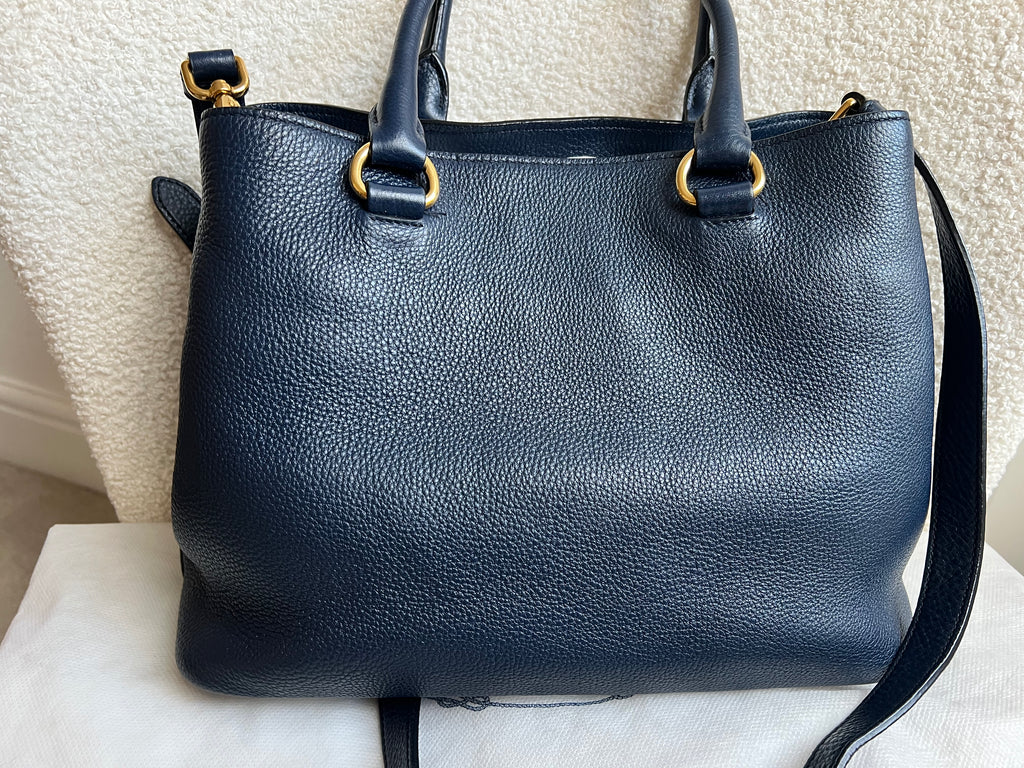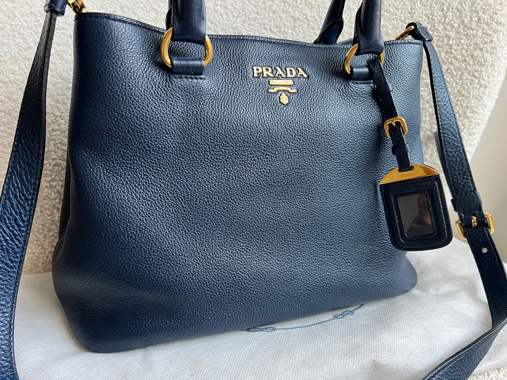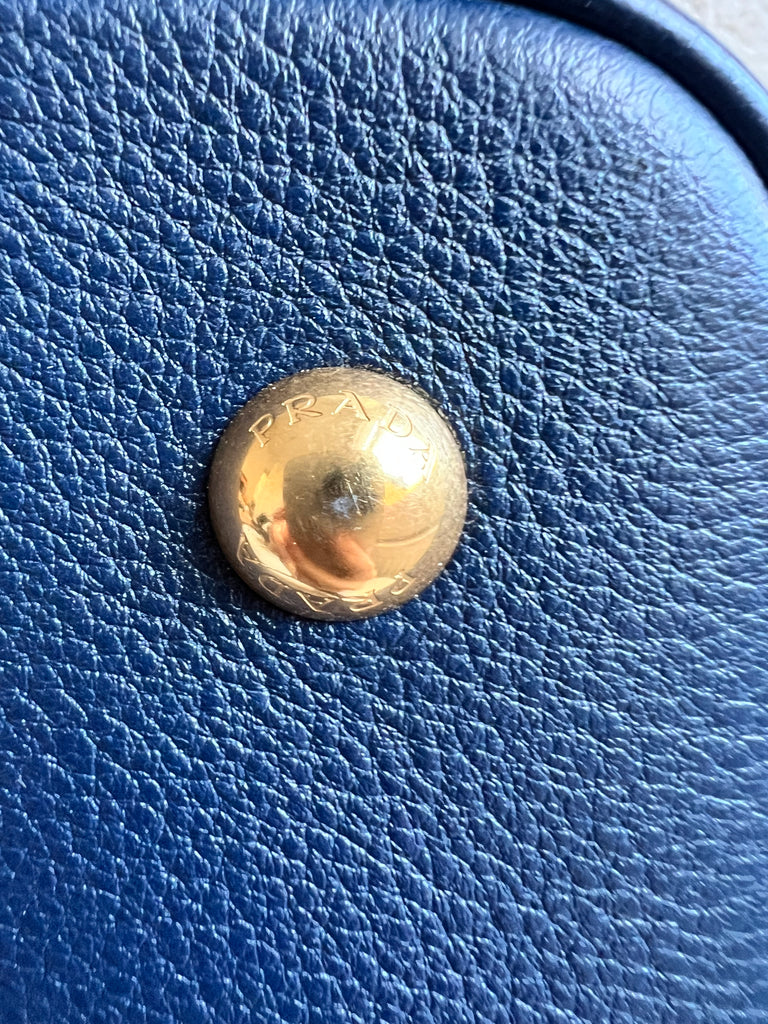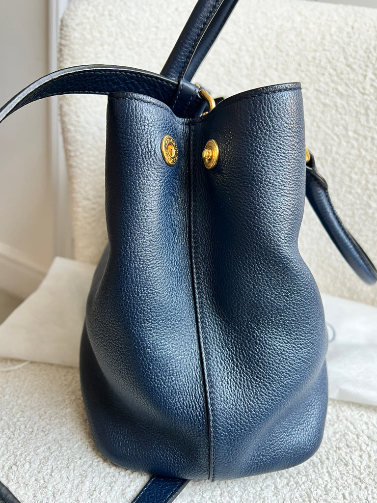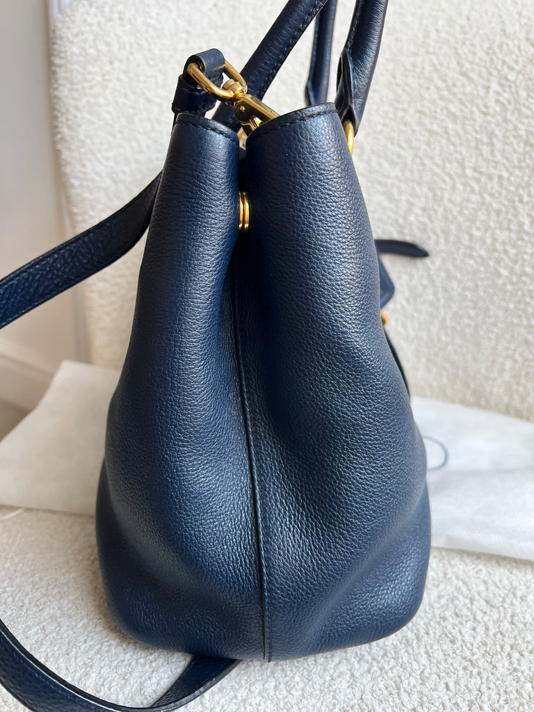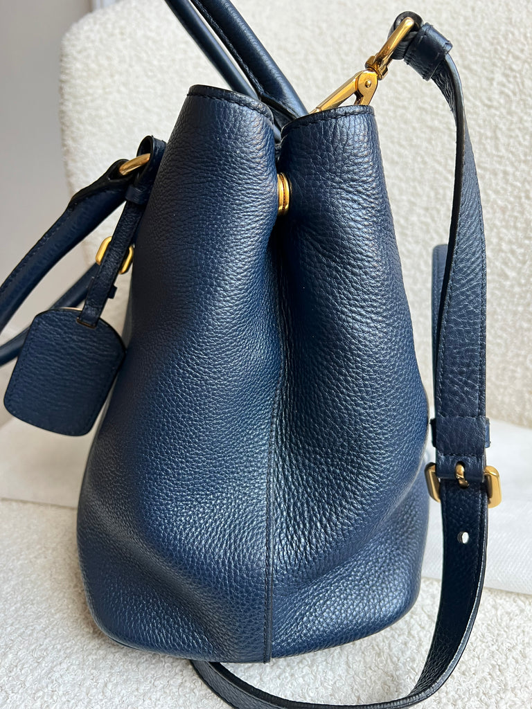 Prada Vitello Daino Two Way Tote in Blue calfskin with gold hardware. This medium sized top handle tote is super practical and perfect for casual or day to day wear. Slouchy in size, ideal for those who prefer larger sized bags. Can be worn over the shoulder with strap or carried in hand using the two top handles.