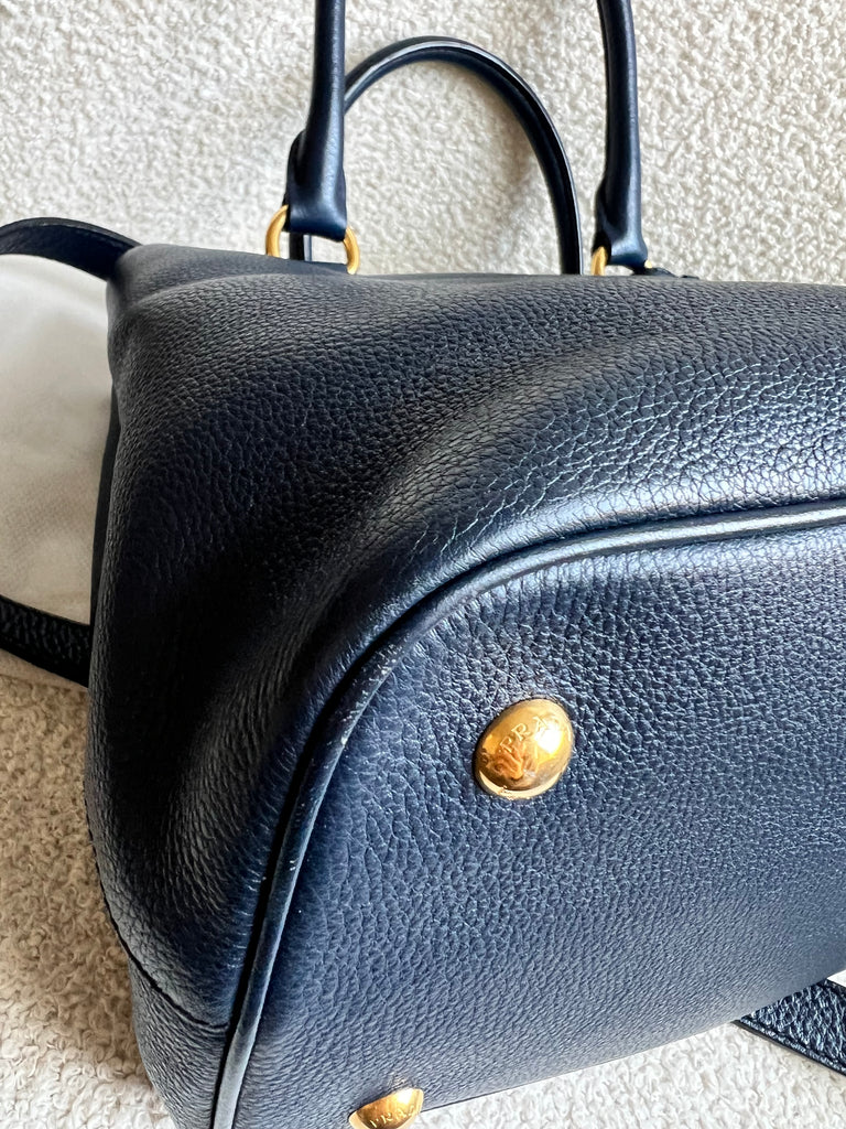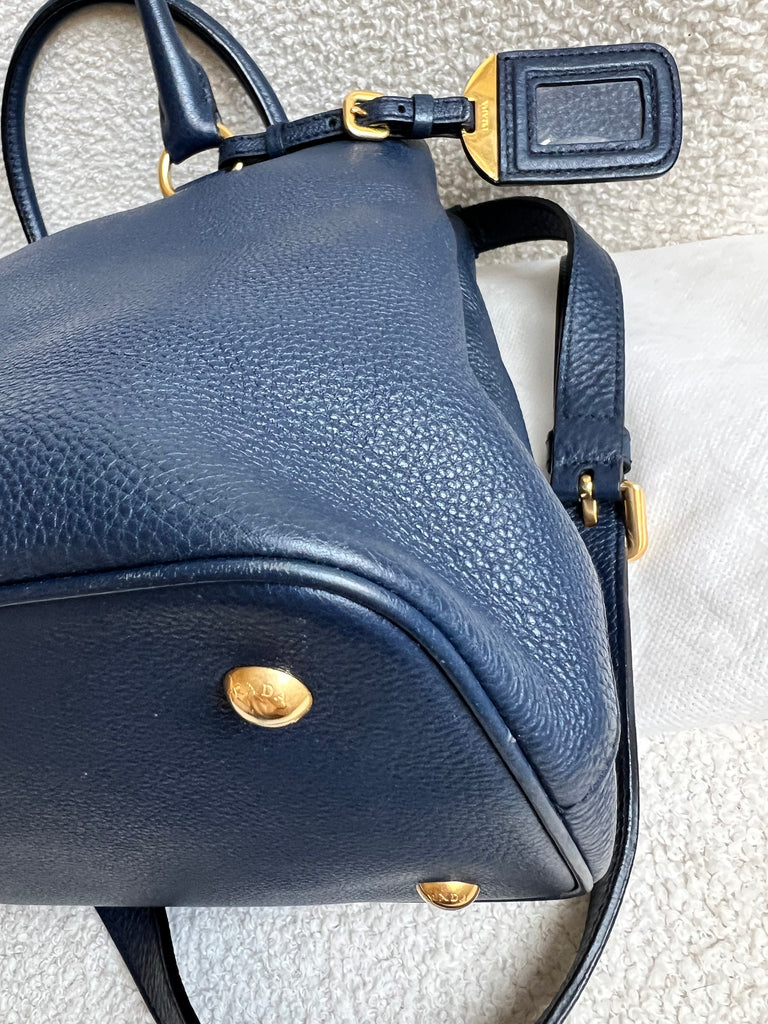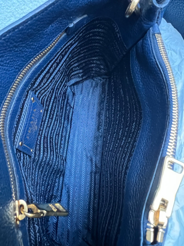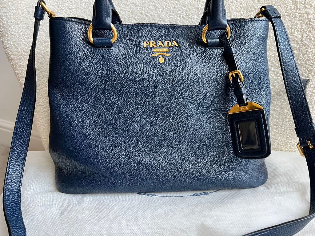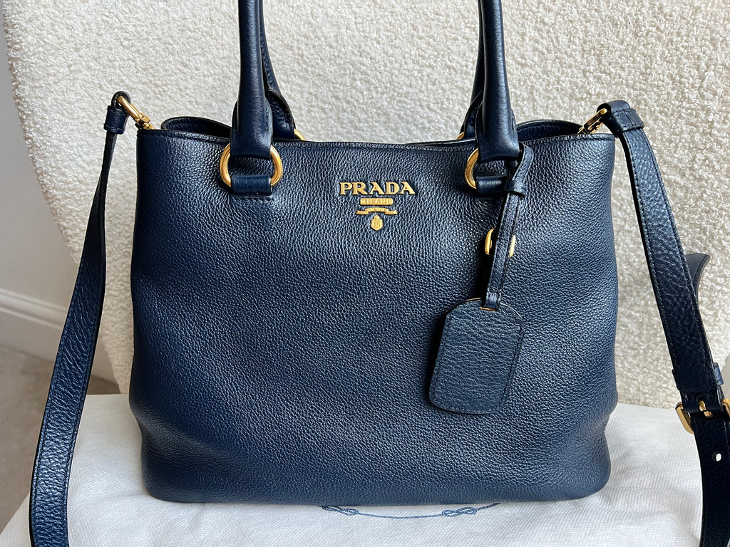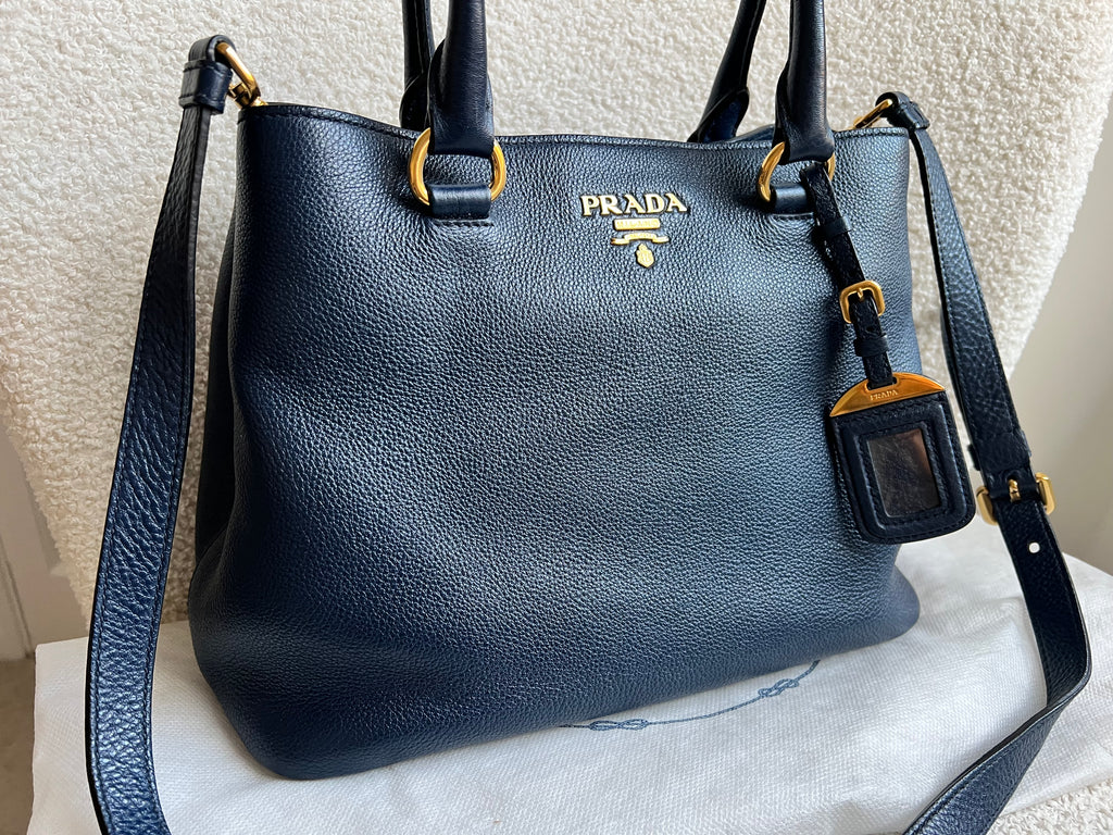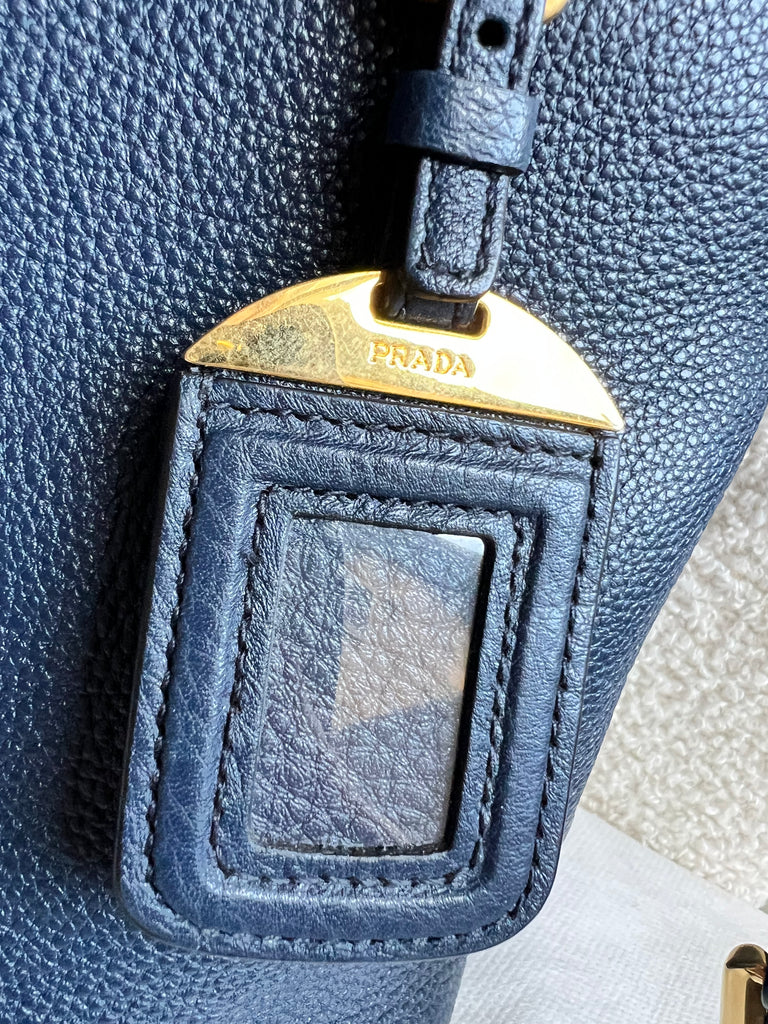Prada Vitello Daino Two Way Tote in Blue calfskin with gold hardware. This medium sized top handle tote is super practical and perfect for casual or day to day wear. Slouchy in size, ideal for those who prefer larger sized bags. Can be worn over the shoulder with strap or carried in hand using the two top handles.