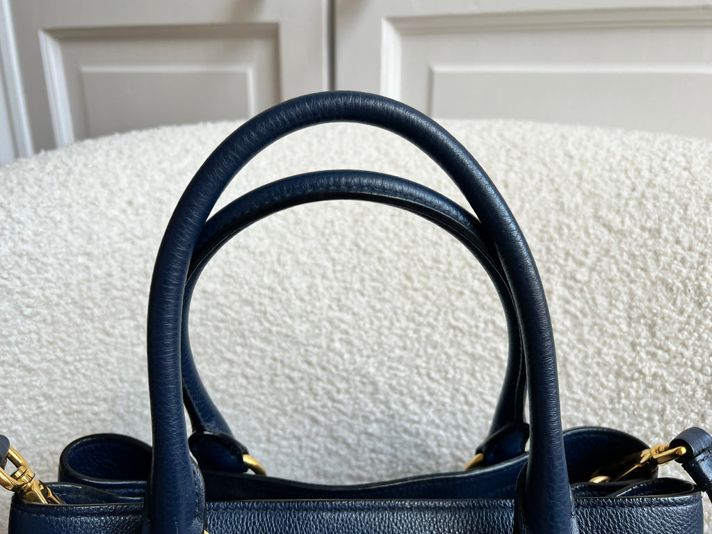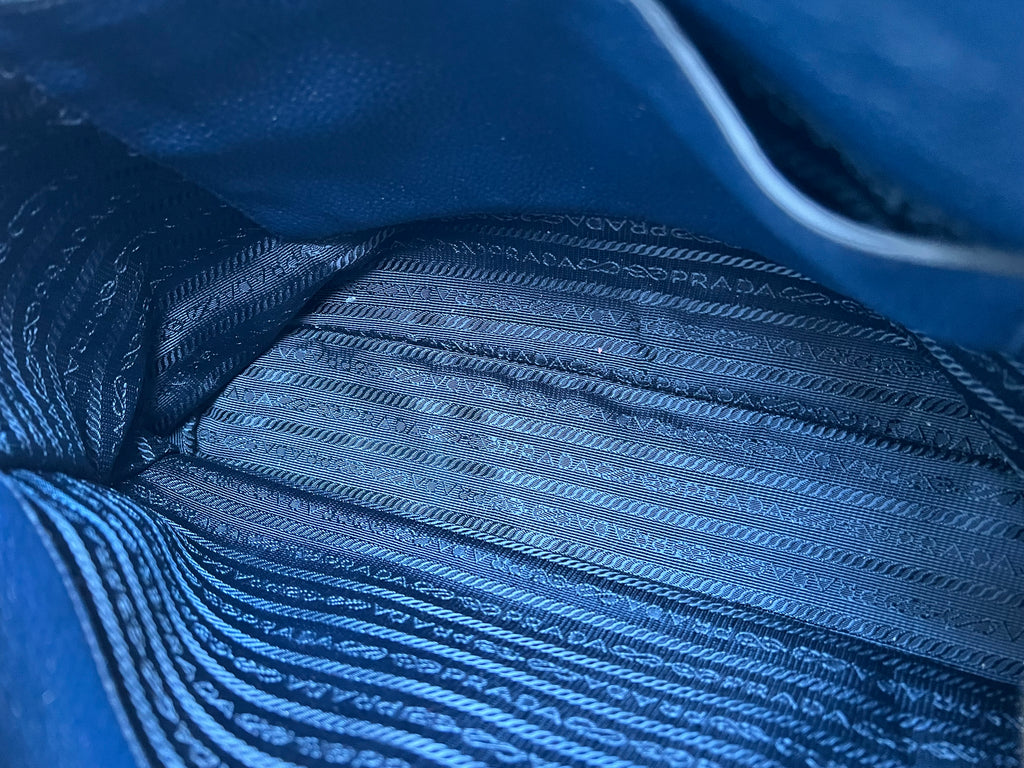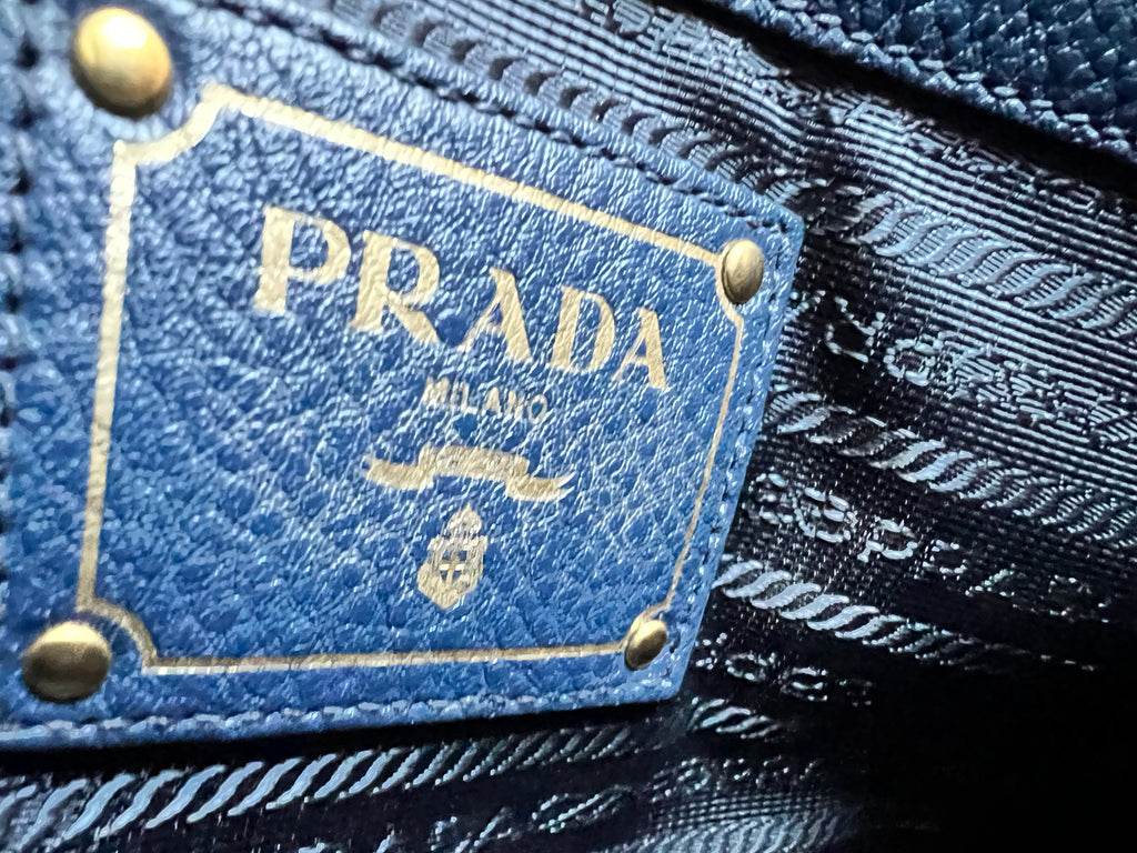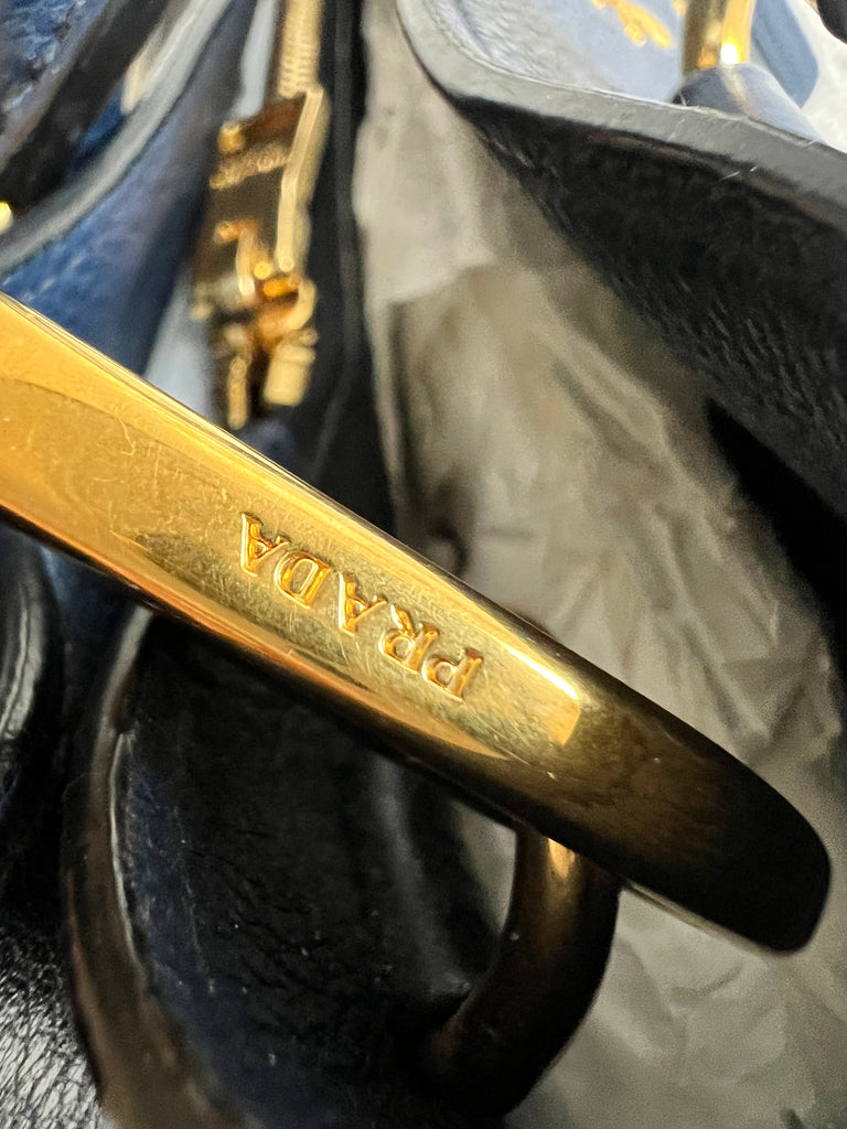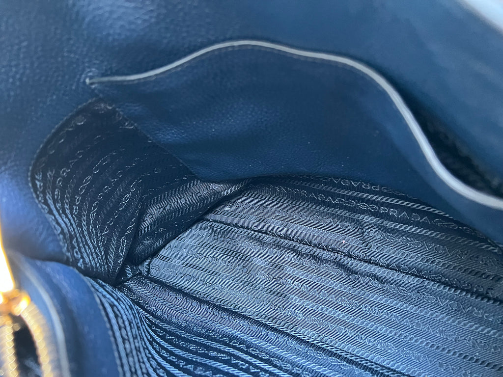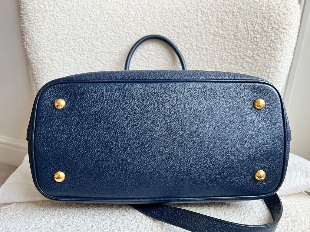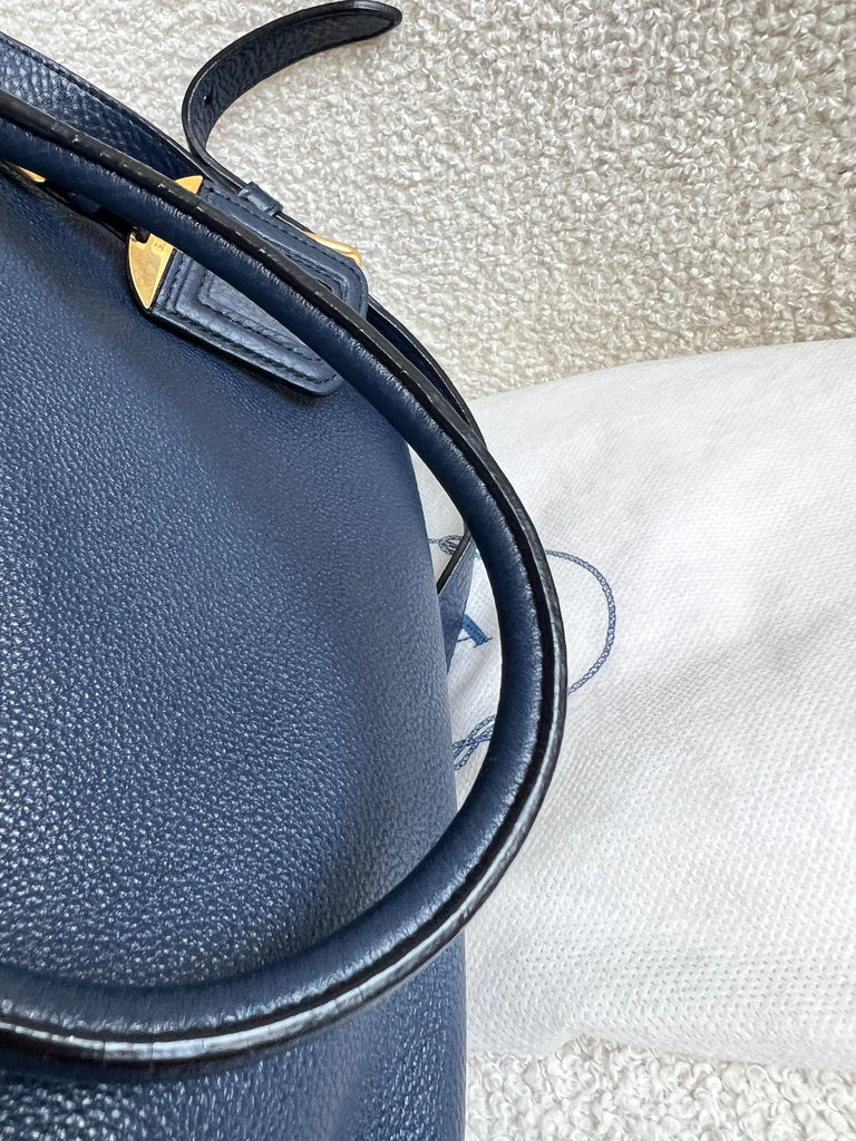 Prada Vitello Daino Two Way Tote in Blue calfskin with gold hardware. This medium sized top handle tote is super practical and perfect for casual or day to day wear. Slouchy in size, ideal for those who prefer larger sized bags. Can be worn over the shoulder with strap or carried in hand using the two top handles.