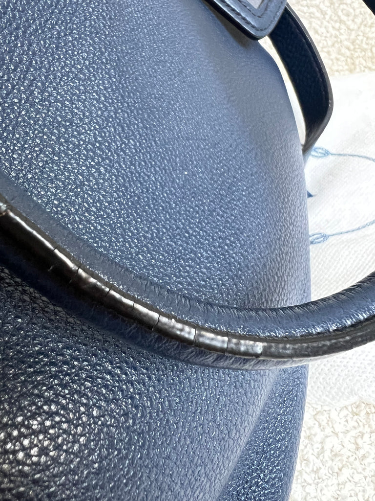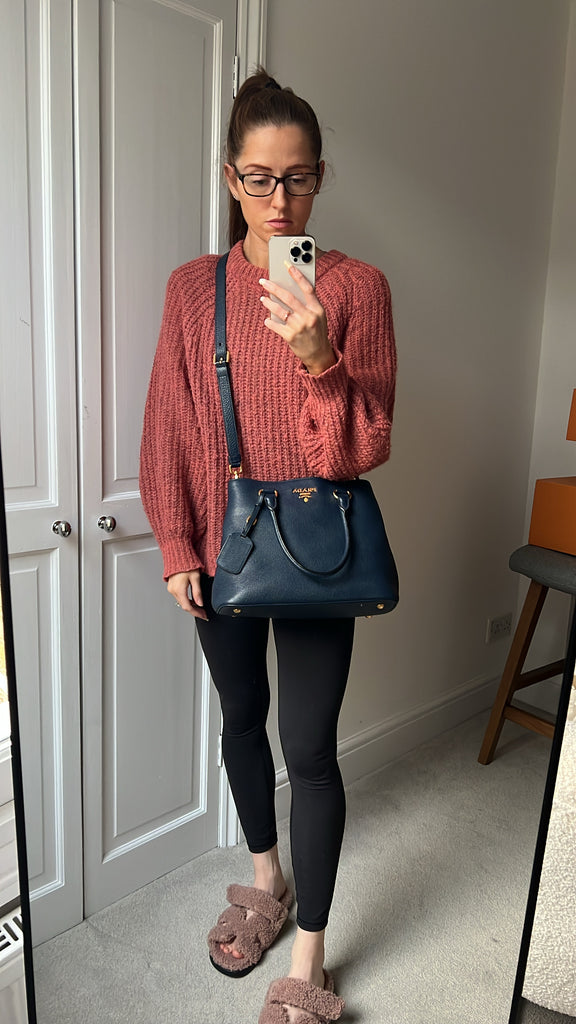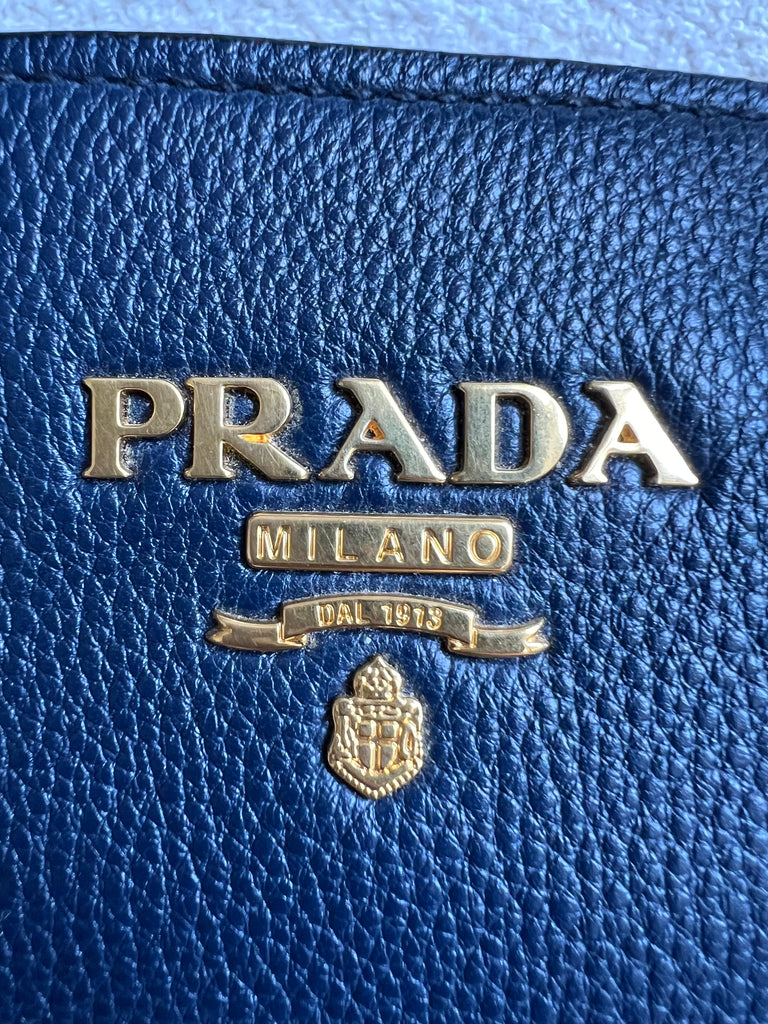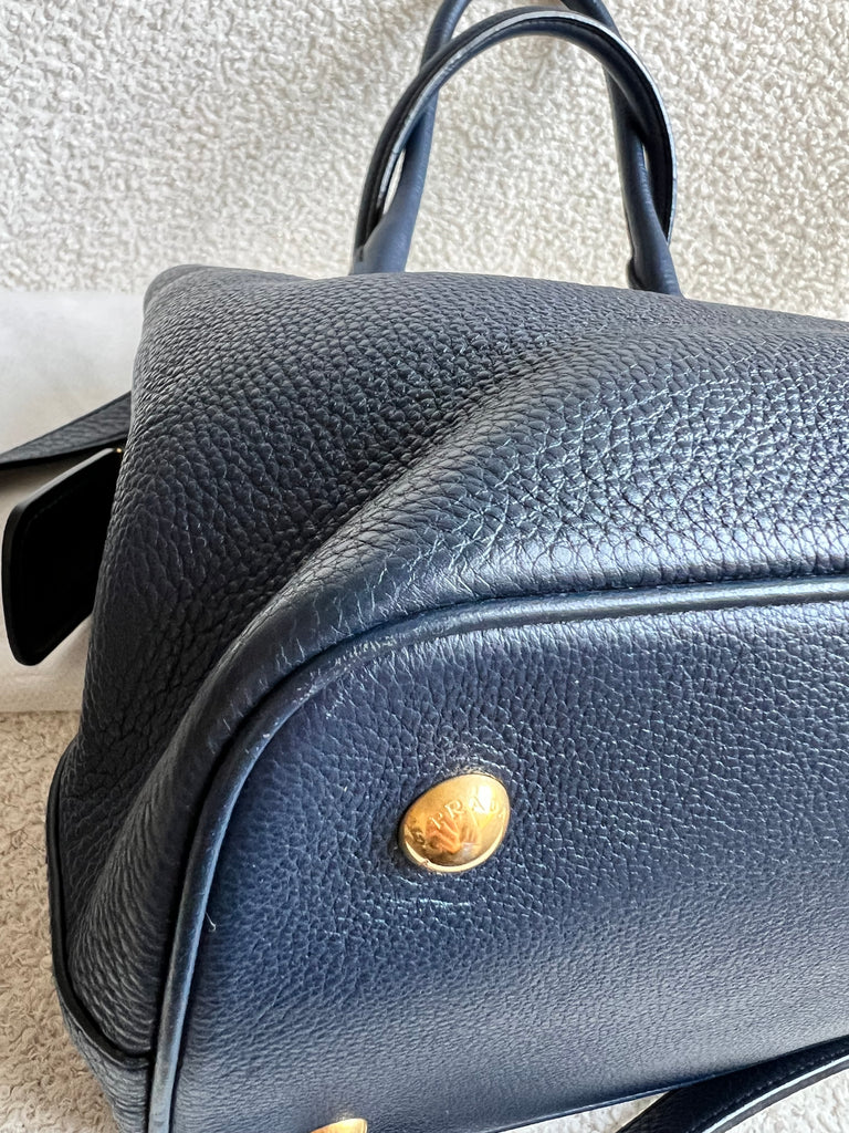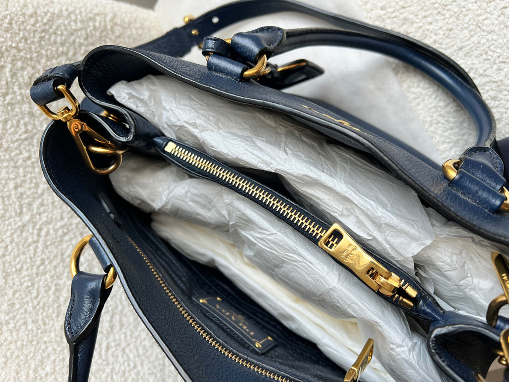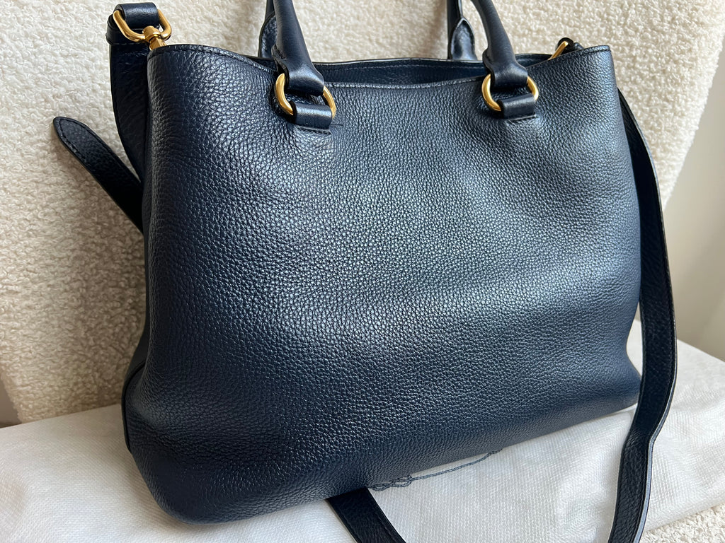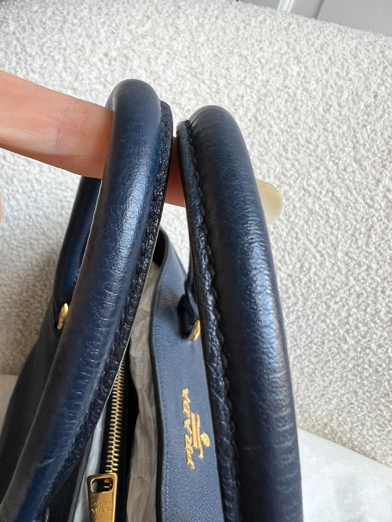 Prada Vitello Daino Two Way Tote in Blue calfskin with gold hardware. This medium sized top handle tote is super practical and perfect for casual or day to day wear. Slouchy in size, ideal for those who prefer larger sized bags. Can be worn over the shoulder with strap or carried in hand using the two top handles.