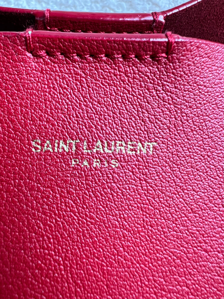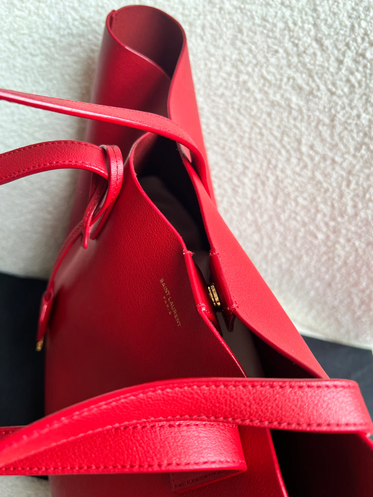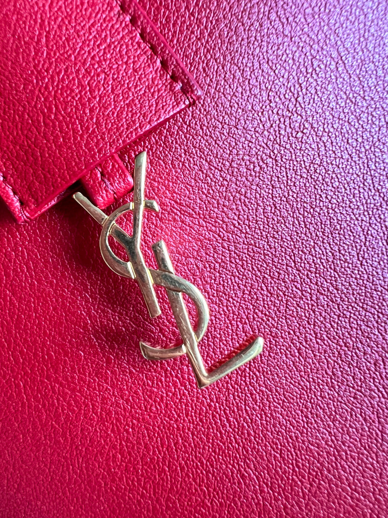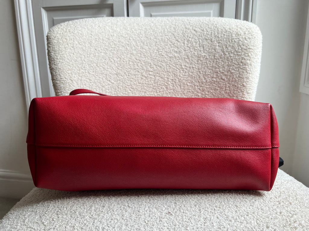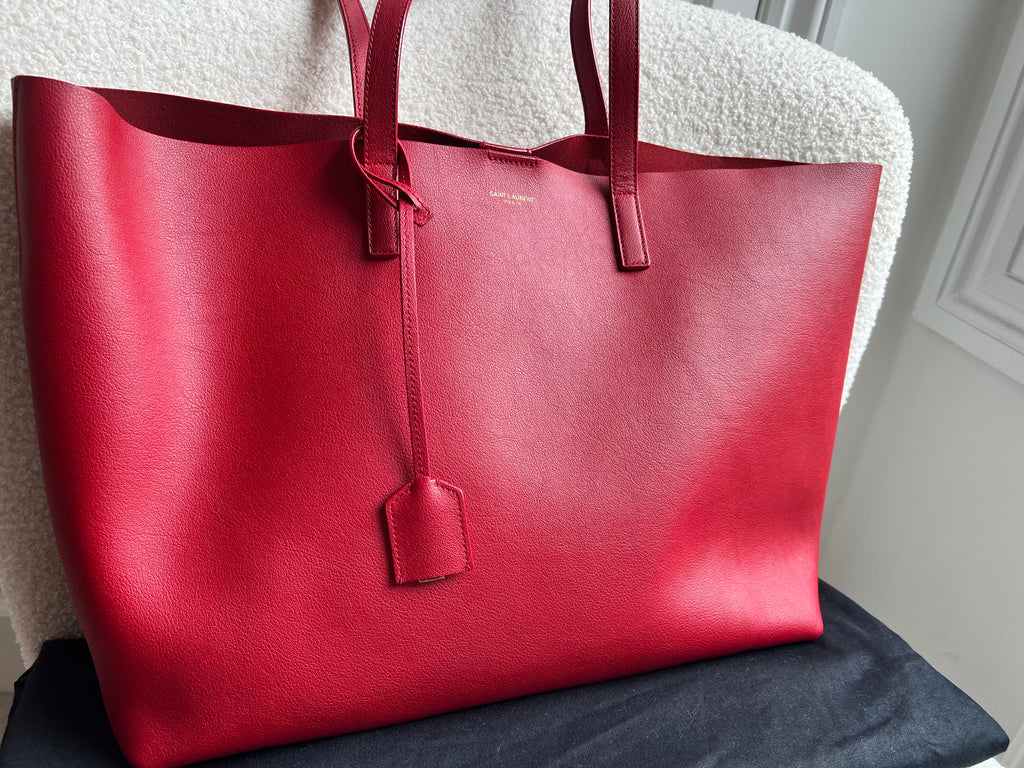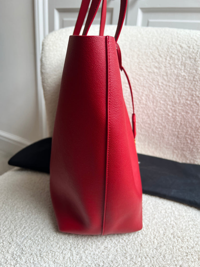 YSL Shopper Tote (E/W) in REd Supple Calfskin leather with gold toned hardware. This fairly large size tote is both practical and stylish. Ideal for a work or day to day bag, it can be worn in the crook of the arm or fits comfortably over shoulder. Single popper closure at the opening.