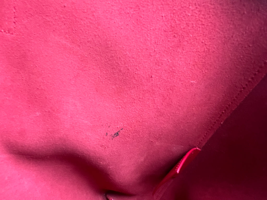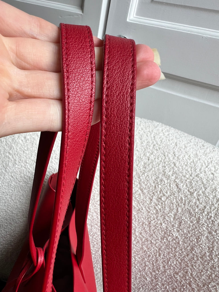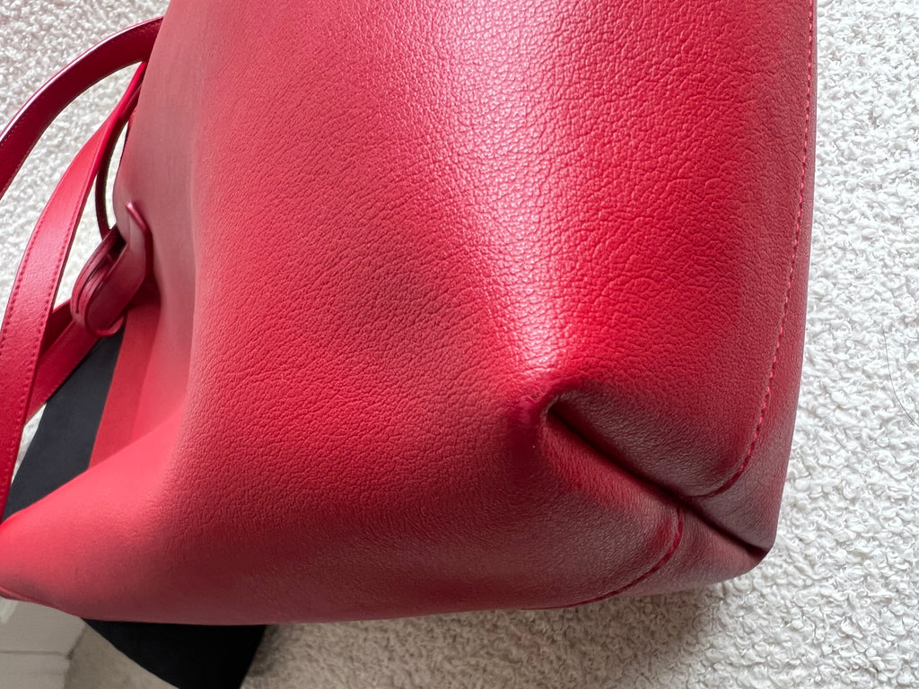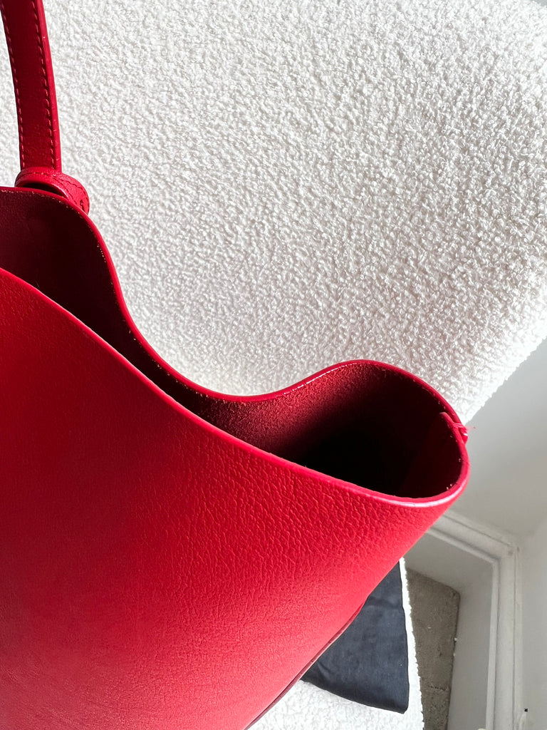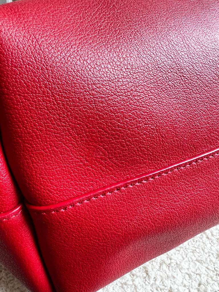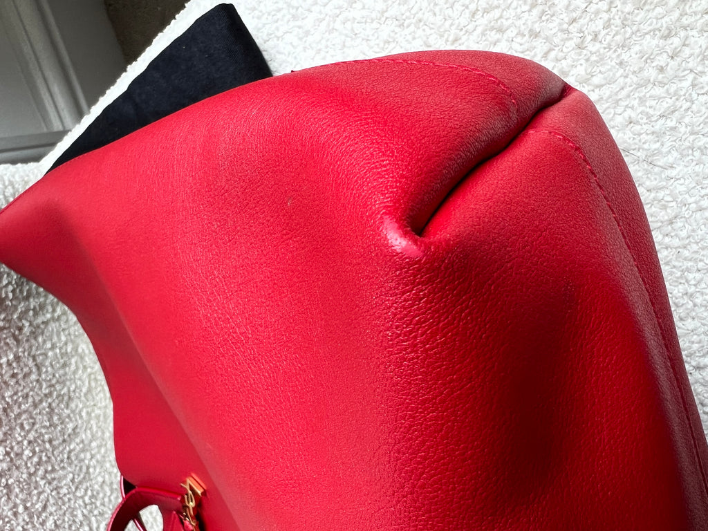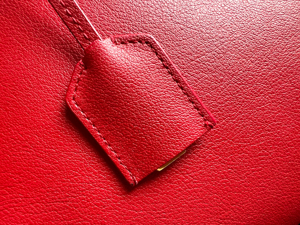 YSL Shopper Tote (E/W) in REd Supple Calfskin leather with gold toned hardware. This fairly large size tote is both practical and stylish. Ideal for a work or day to day bag, it can be worn in the crook of the arm or fits comfortably over shoulder. Single popper closure at the opening.
