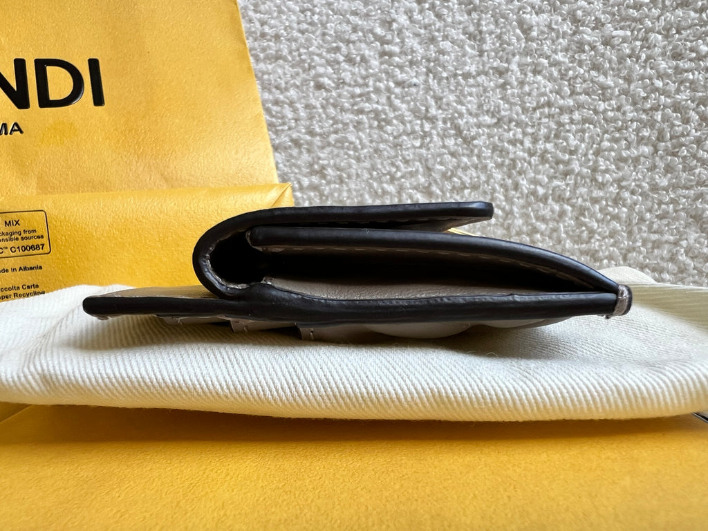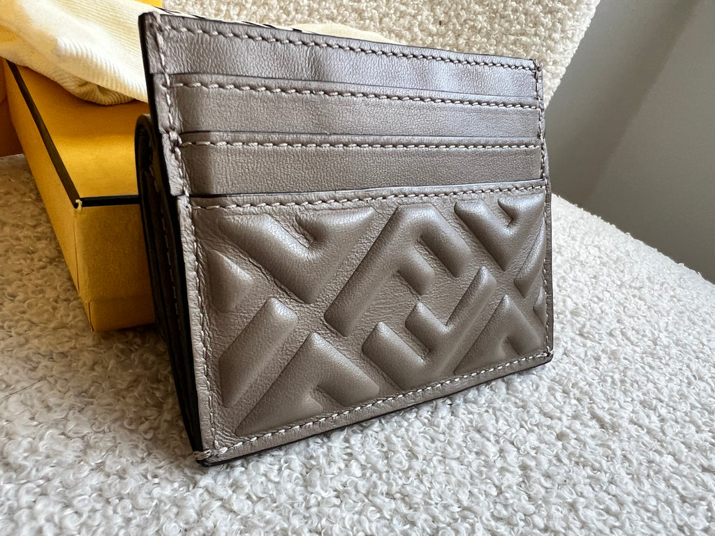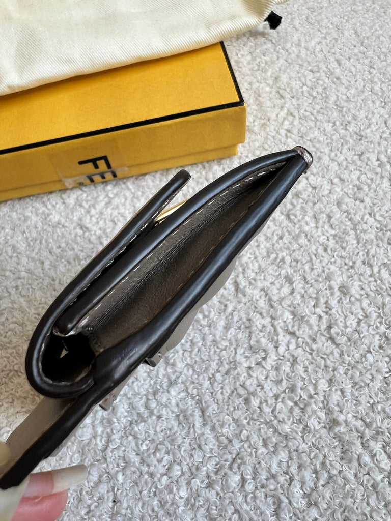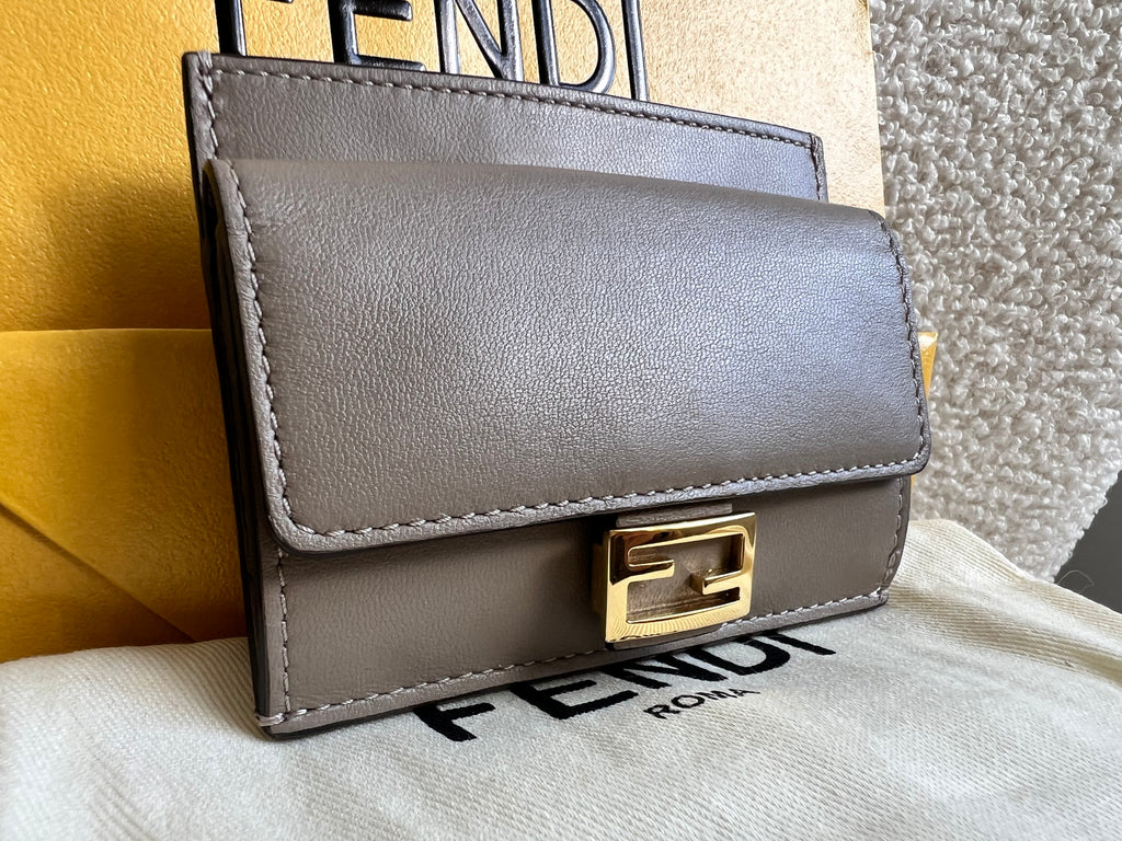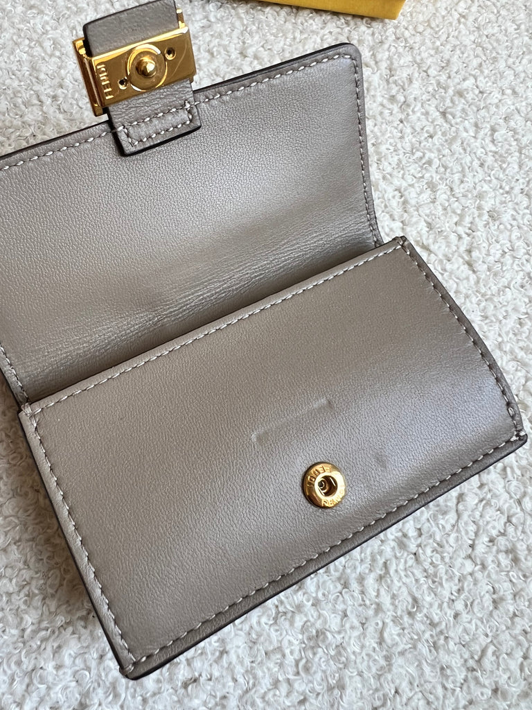 Fendi Baguette Card Holder in Grey Calfskin with gold hardware. This card holder features three card holder slots and coin pocket with press-stud fastening. Made of dove grey nappa leather. Embossed FF motif detail. Colour is a taupe grey shade.