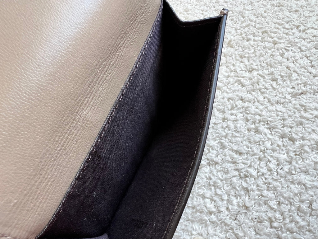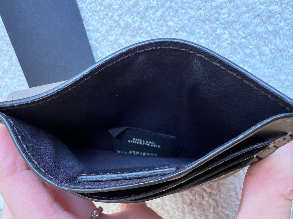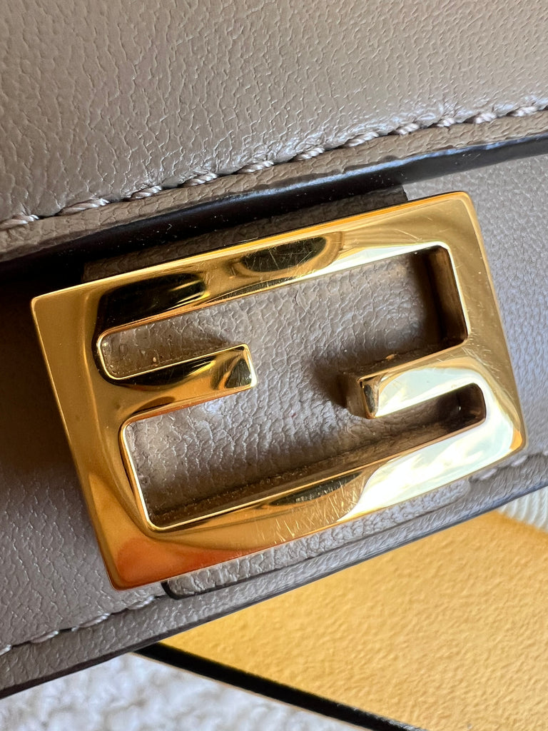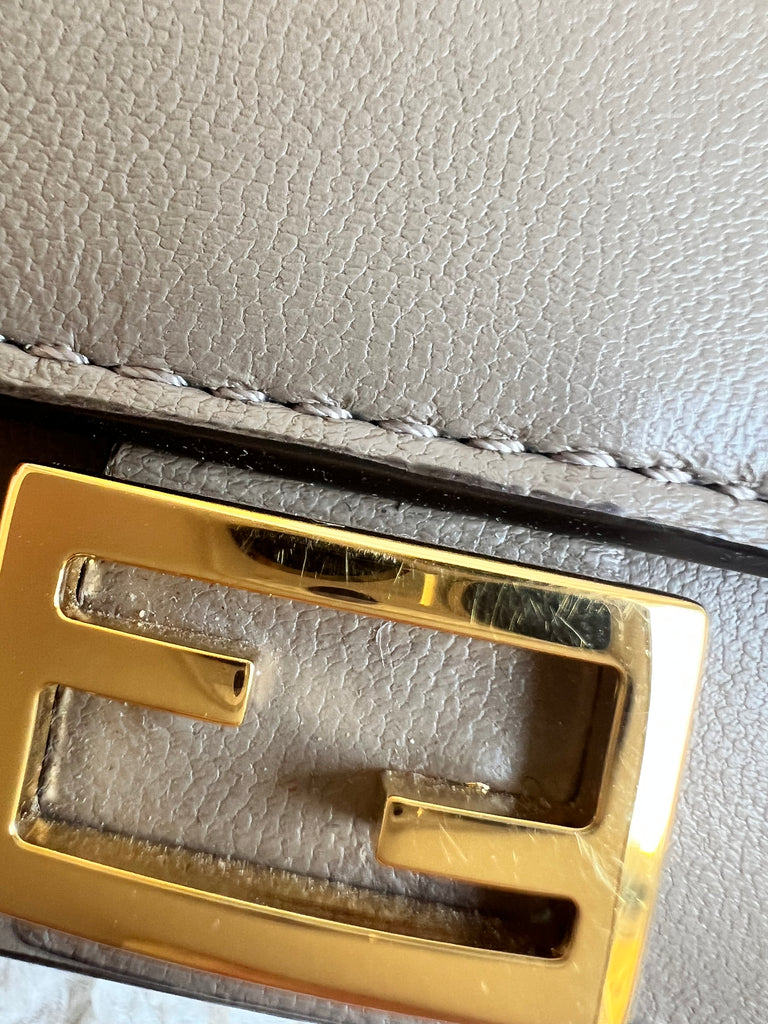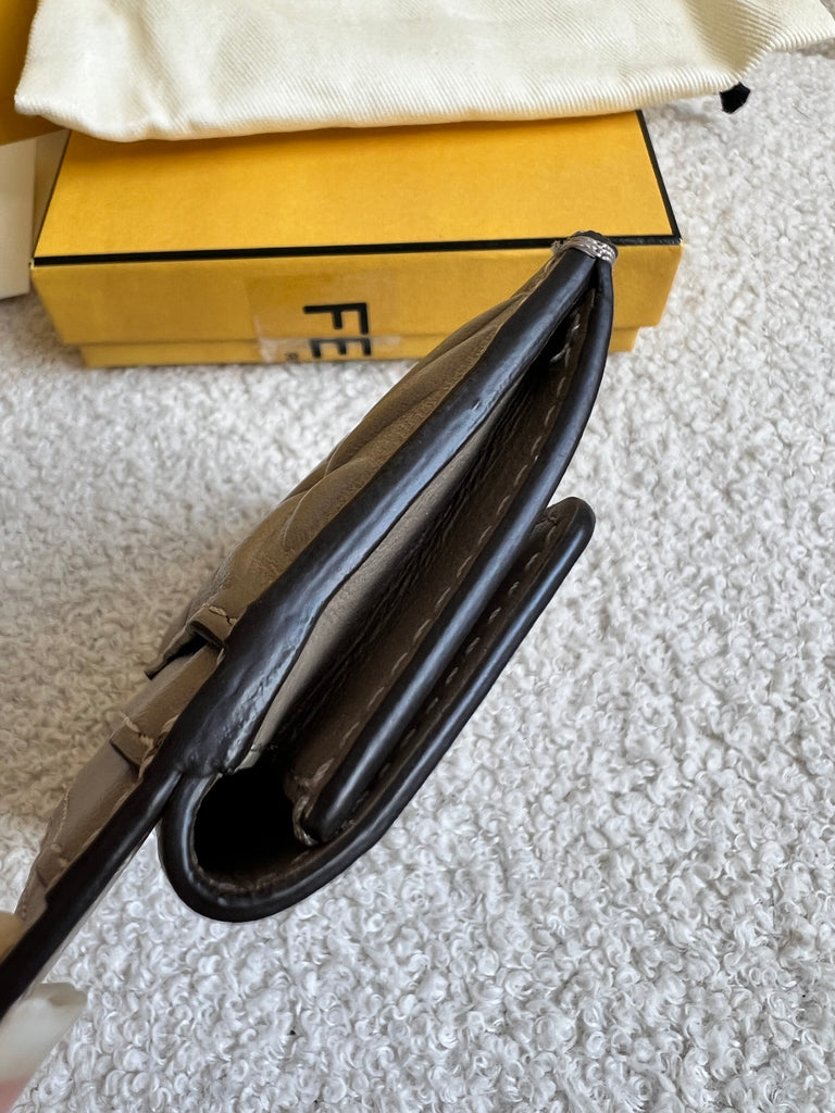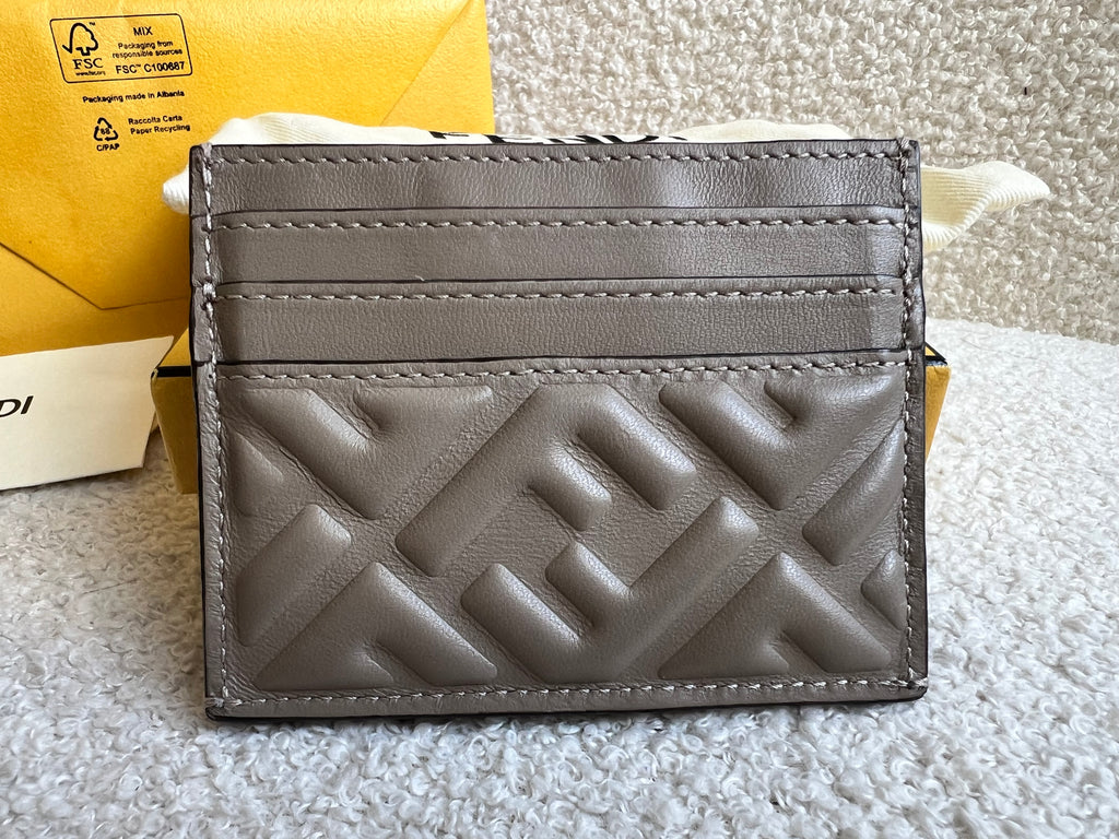 Fendi Baguette Card Holder in Grey Calfskin with gold hardware. This card holder features three card holder slots and coin pocket with press-stud fastening. Made of dove grey nappa leather. Embossed FF motif detail. Colour is a taupe grey shade.
