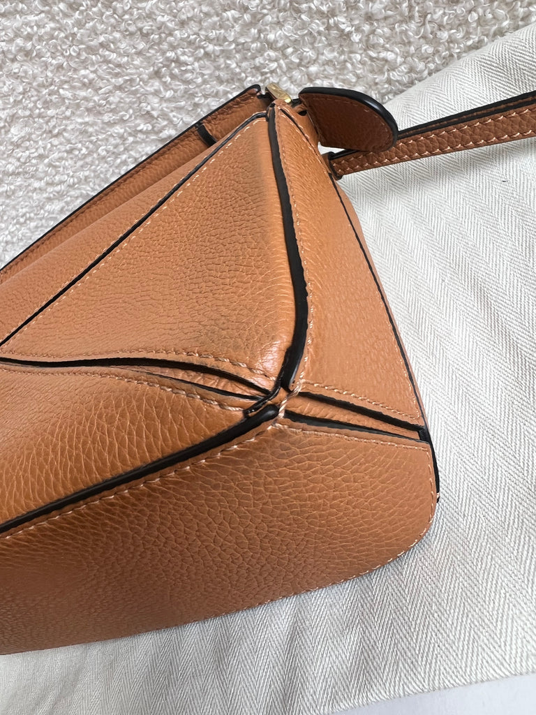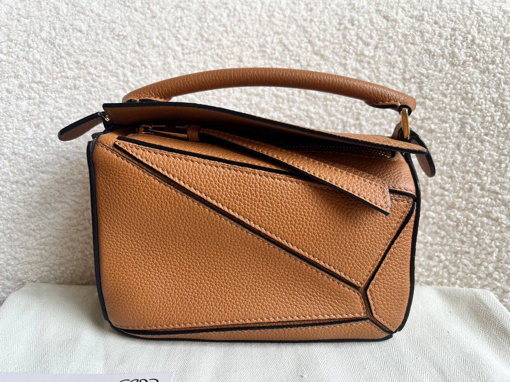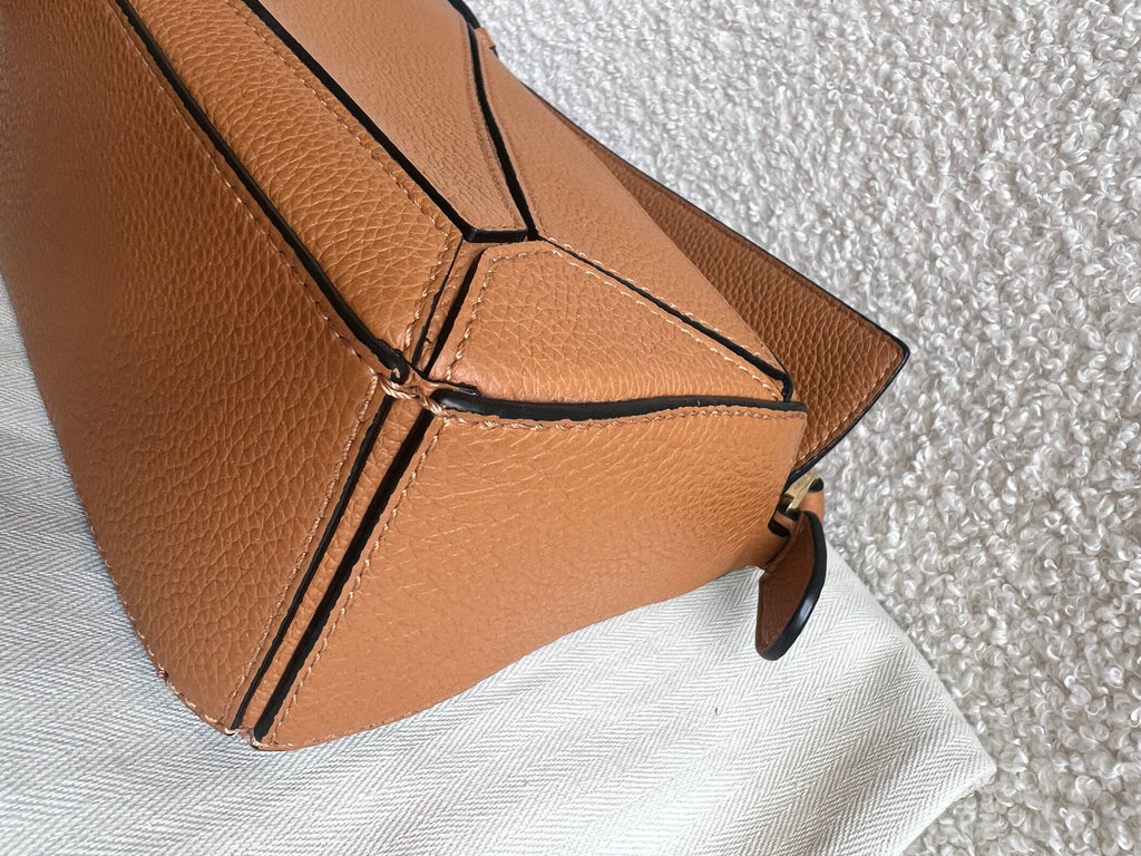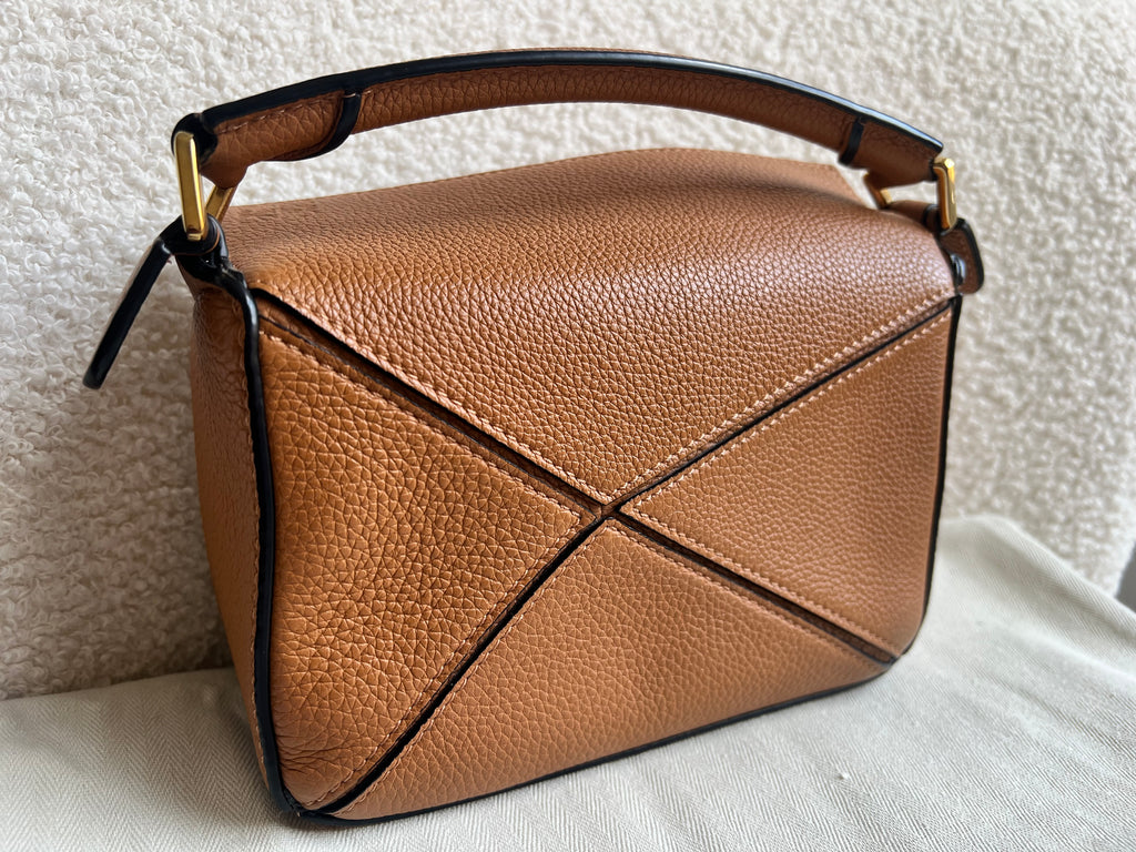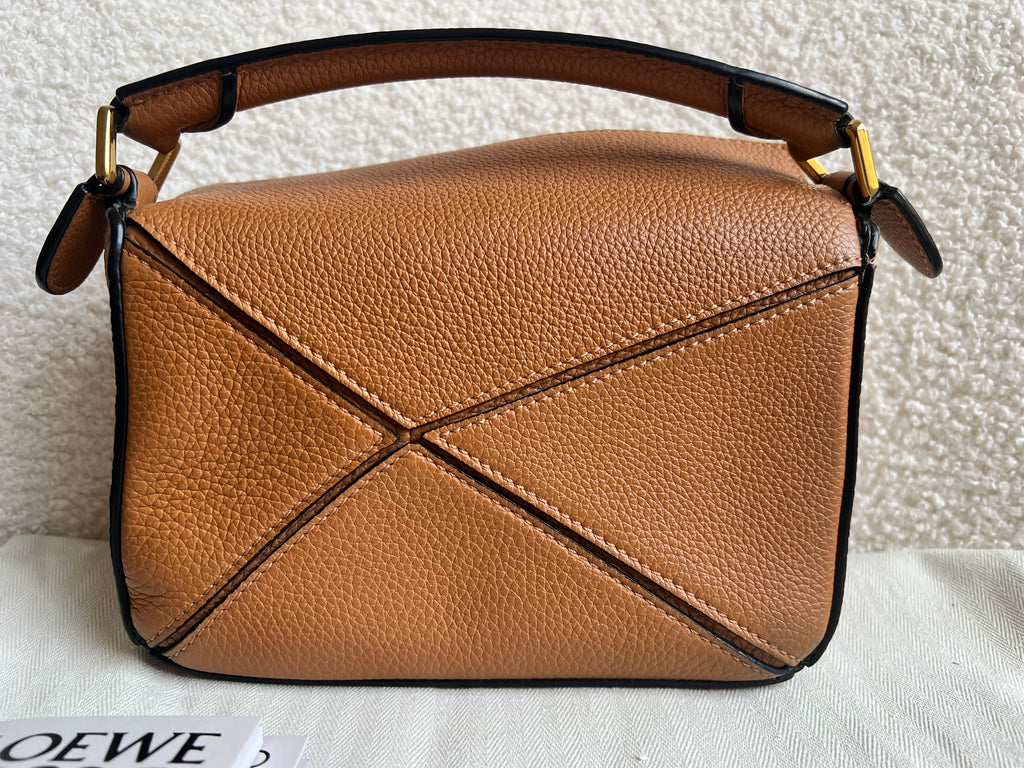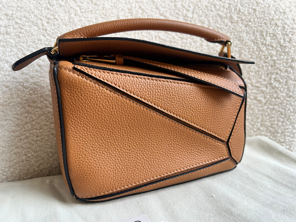 Loewe Mini Puzzle Bag in Tan Calfskin with gold hardware. This classic Loewe style has a cuboid shape and is an ideal day to day bag for those who prefer smaller sized bags. One of Loewes most popular styles. Can be carried in hand using the top handle or cross body using the long detachable strap.