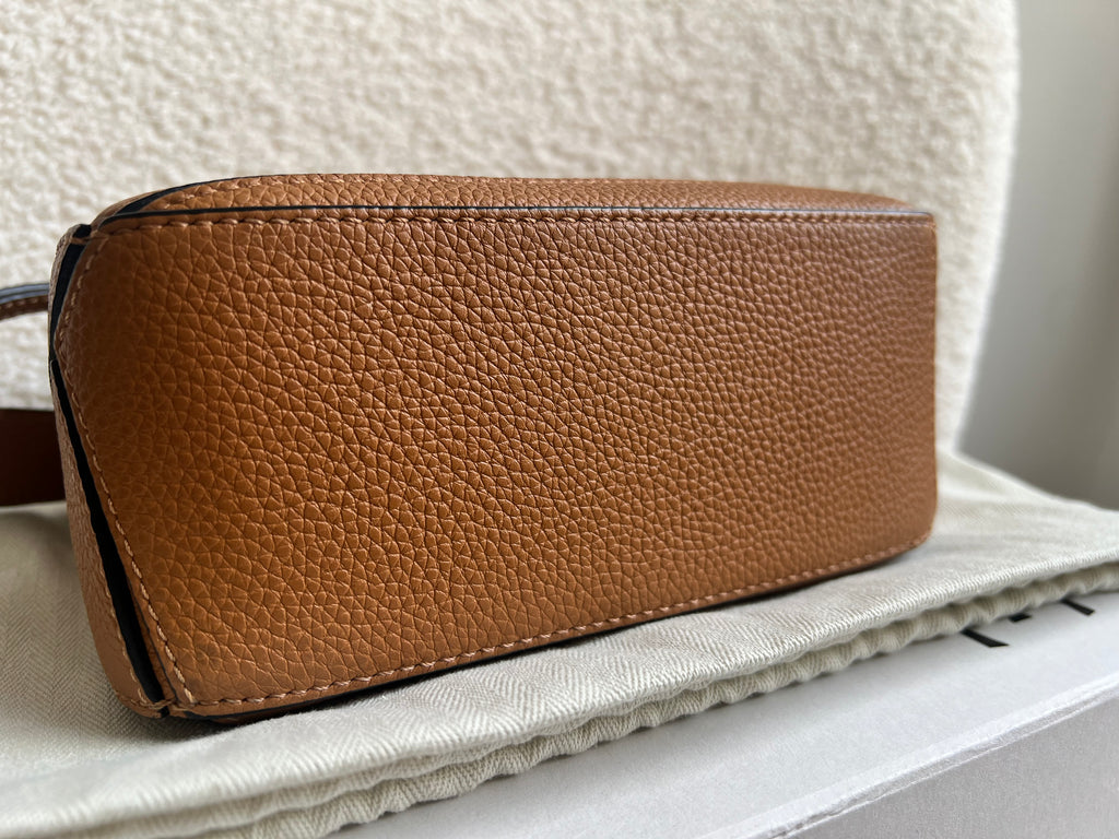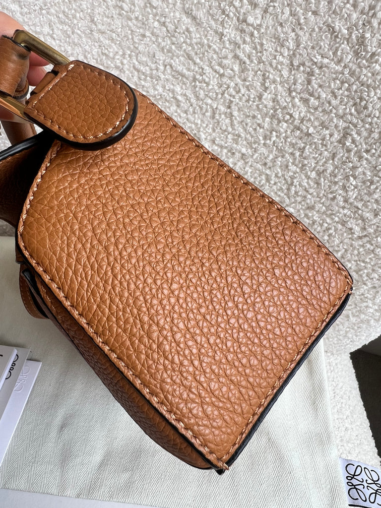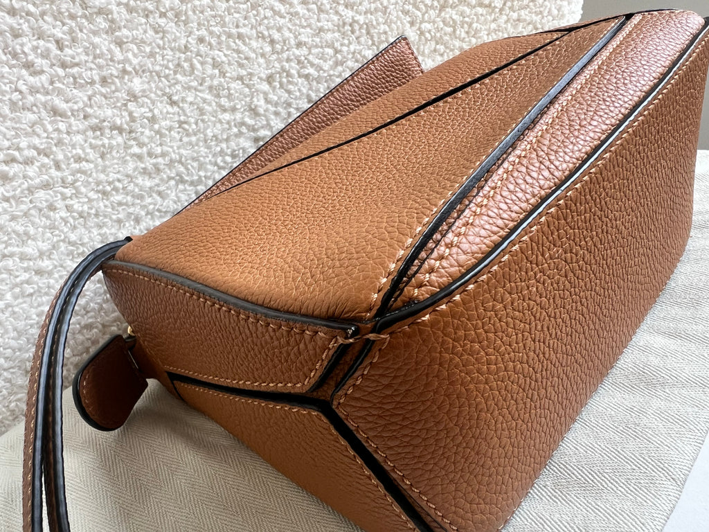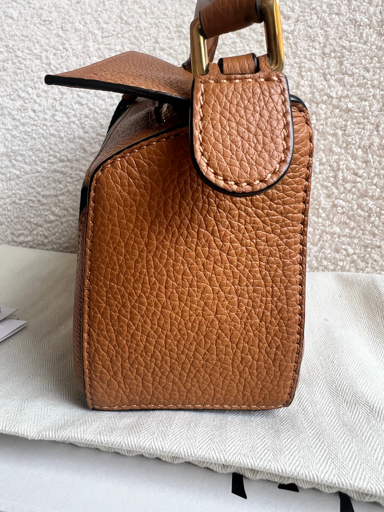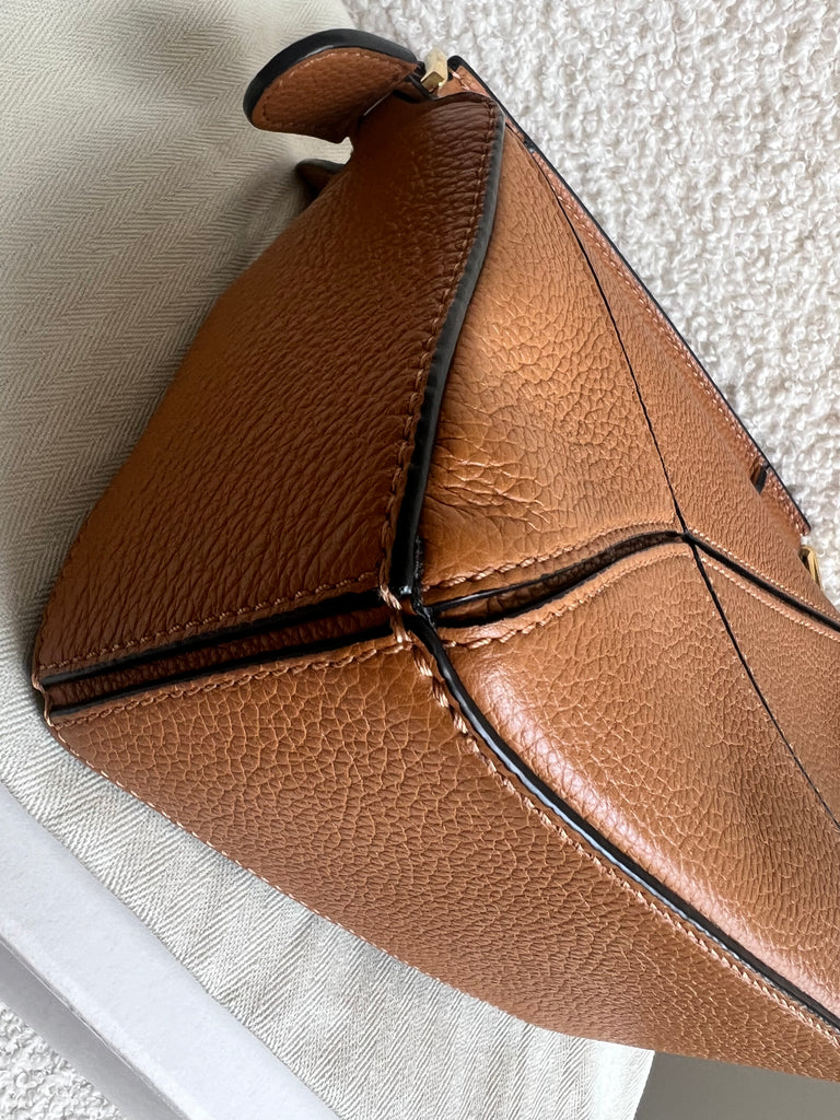 Loewe Mini Puzzle Bag in Tan Calfskin with gold hardware. This classic Loewe style has a cuboid shape and is an ideal day to day bag for those who prefer smaller sized bags. One of Loewes most popular styles. Can be carried in hand using the top handle or cross body using the long detachable strap.