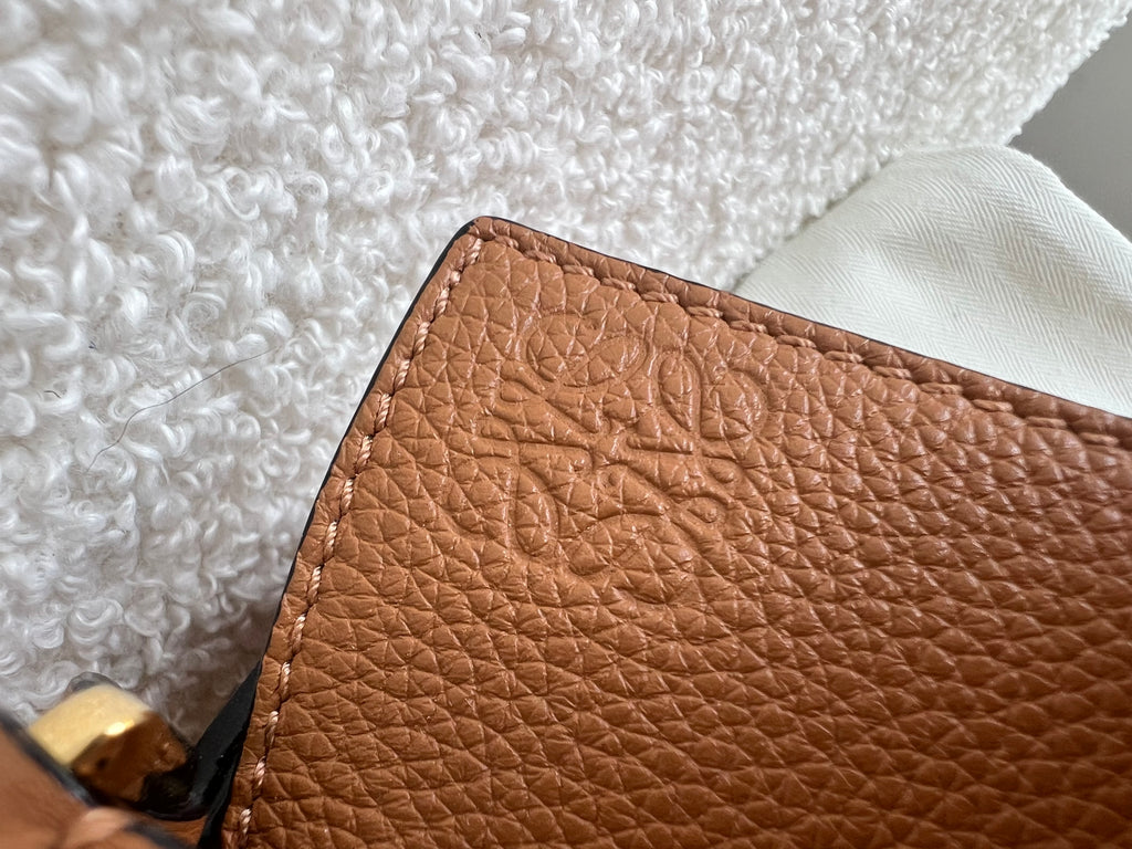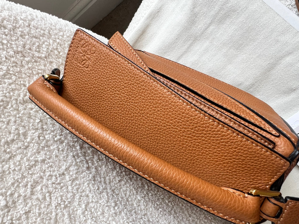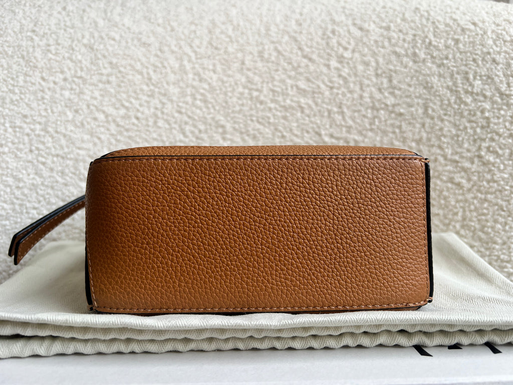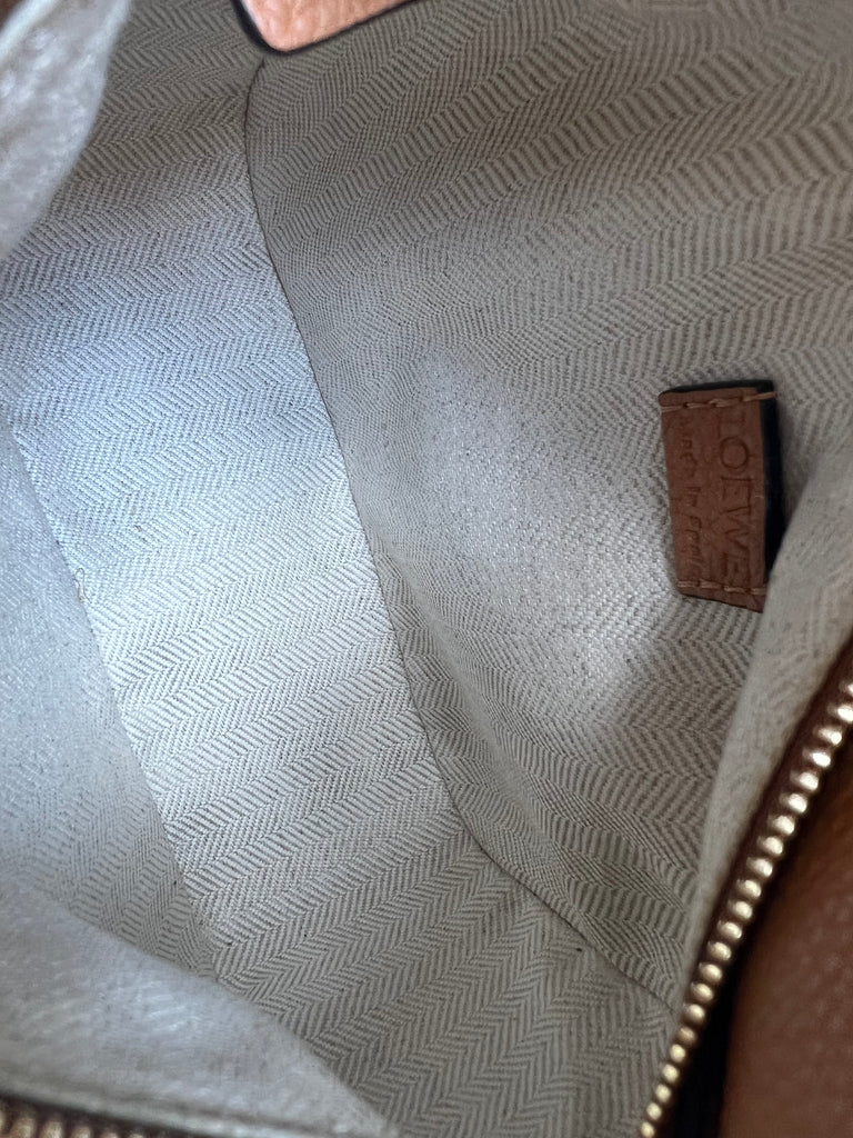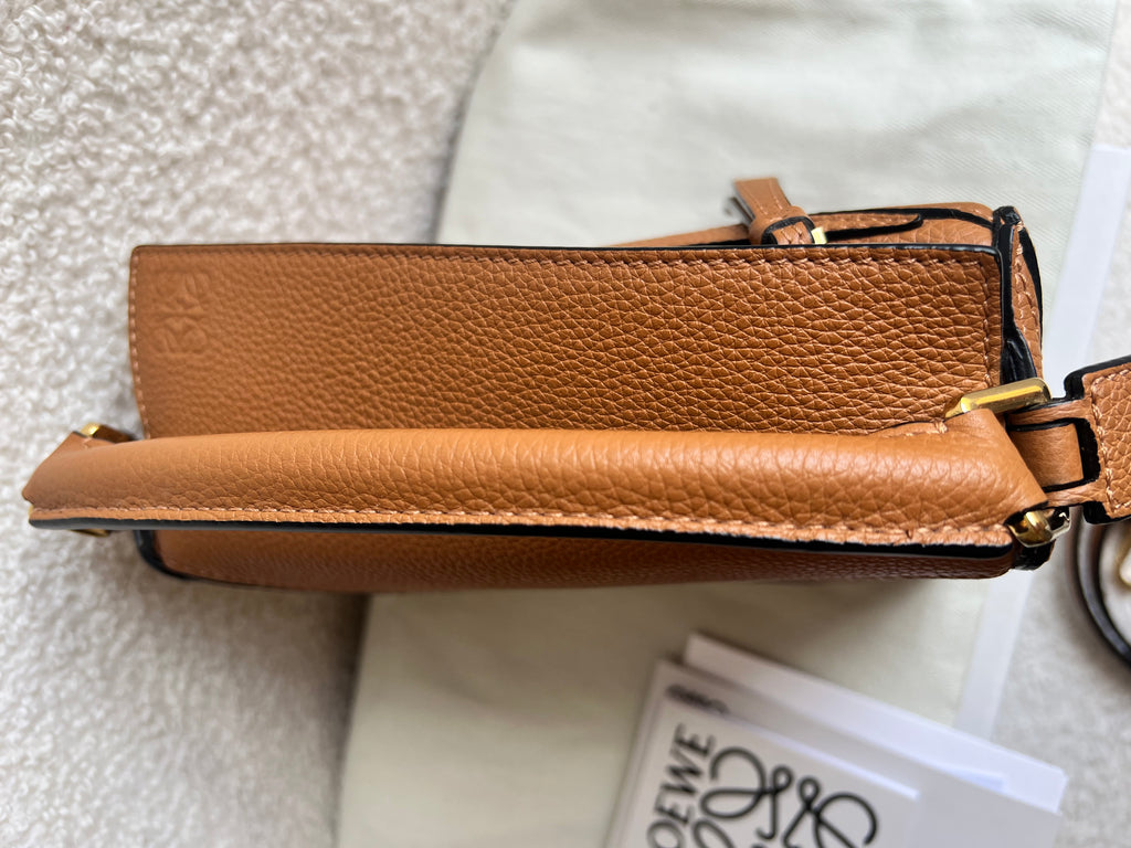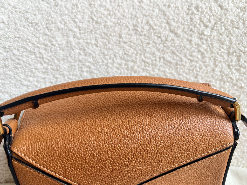 Loewe Mini Puzzle Bag in Tan Calfskin with gold hardware. This classic Loewe style has a cuboid shape and is an ideal day to day bag for those who prefer smaller sized bags. One of Loewes most popular styles. Can be carried in hand using the top handle or cross body using the long detachable strap.