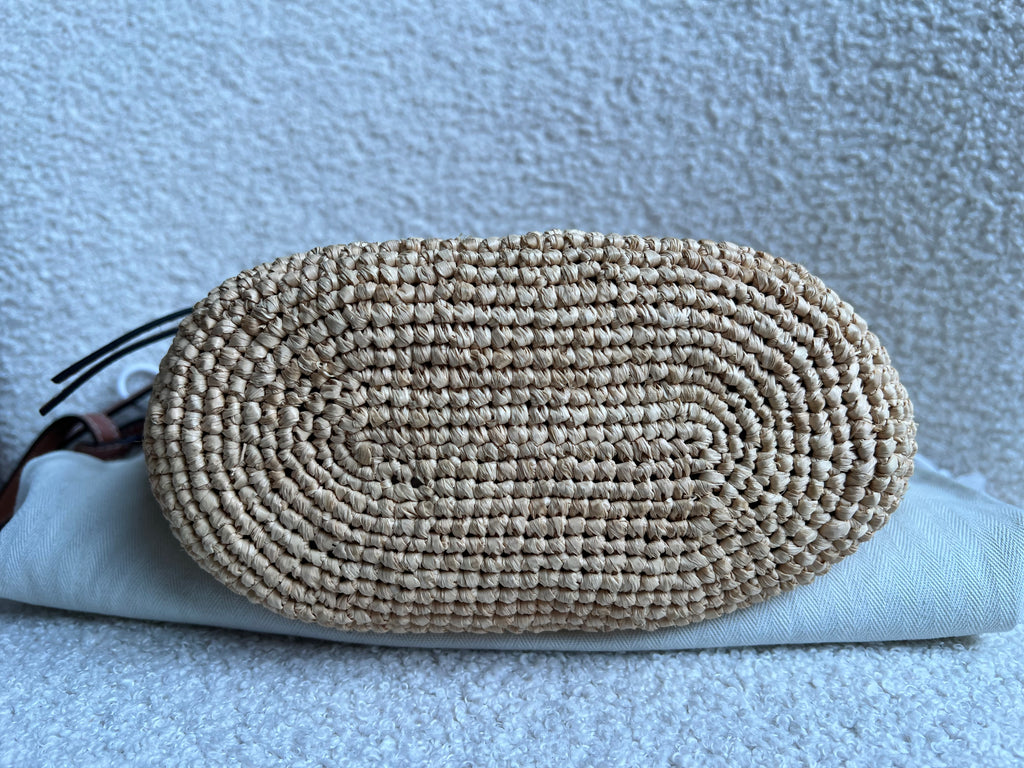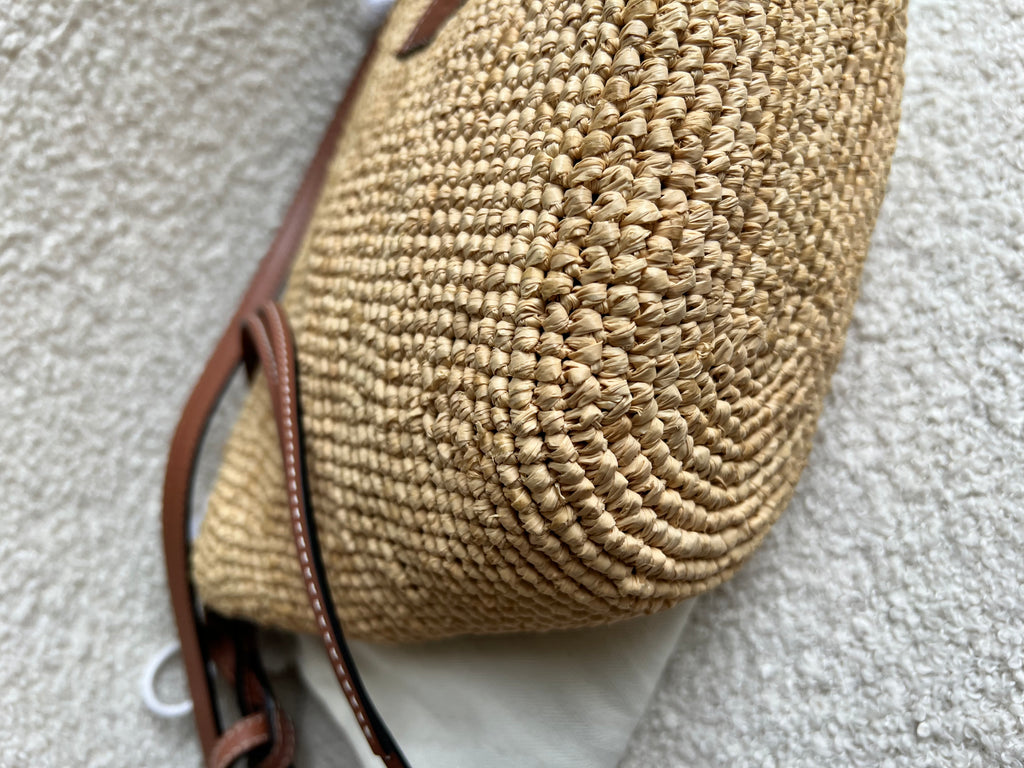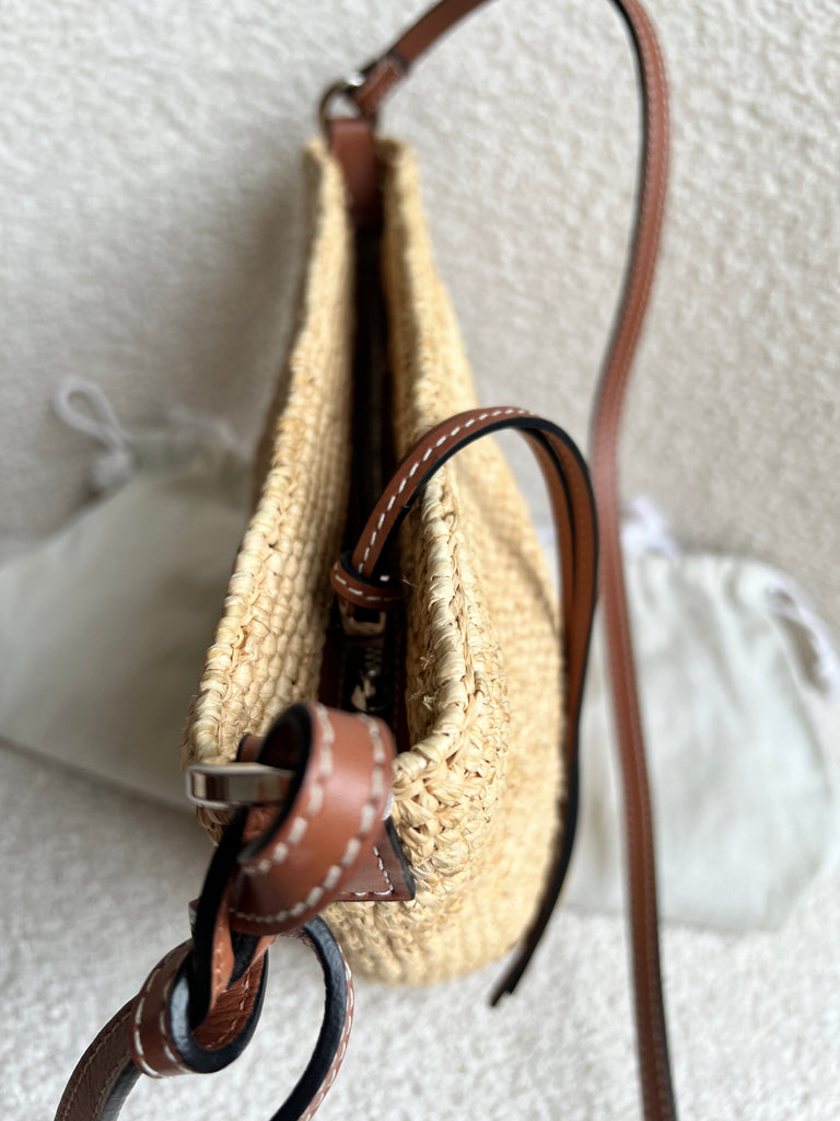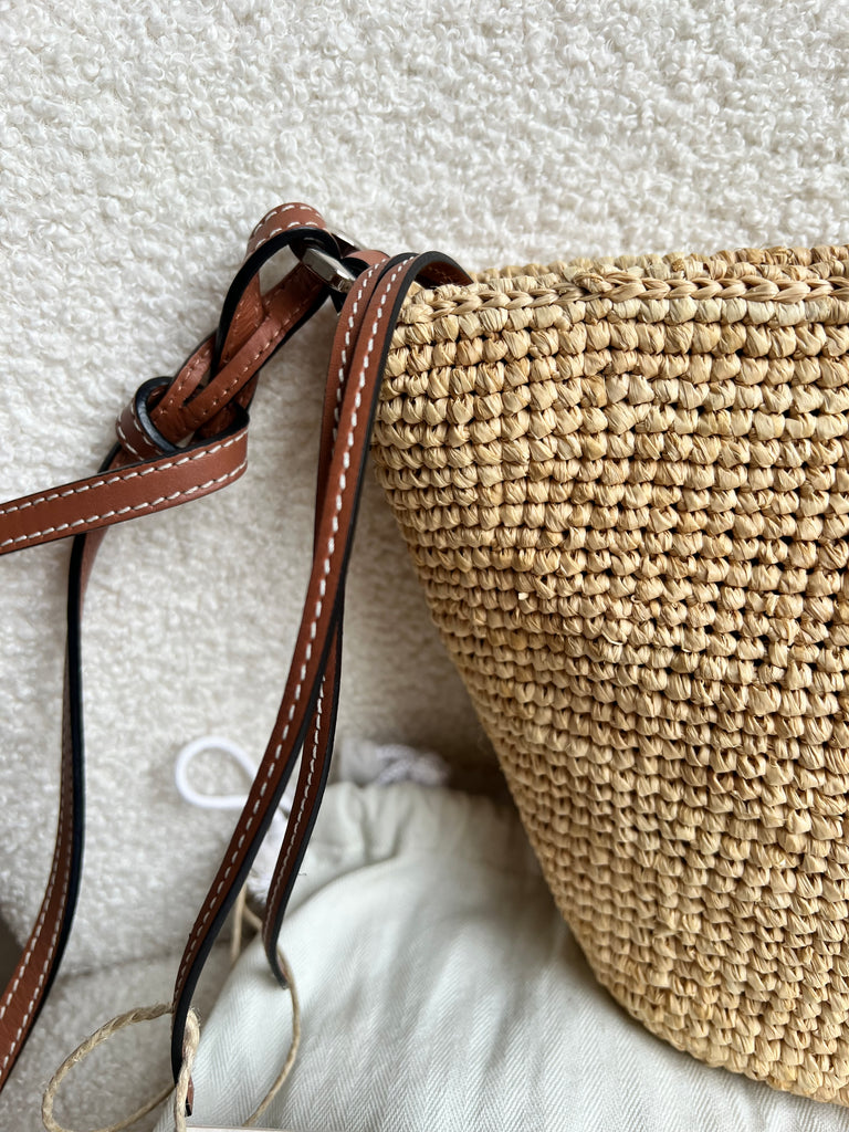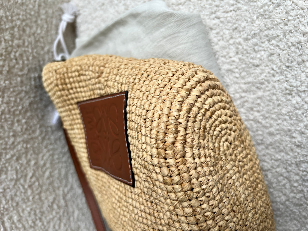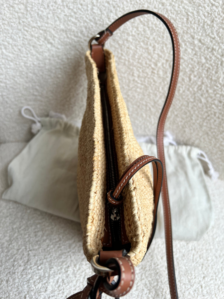 Loewe x Paula’s Ibiza Cross Bag in Raffia and tan calfskin. This cross body pochette is crafted from woven raffia, and makes the perfect casual beach or holiday accessory. Zip closure with leather shoulder strap. Can be worn cross body.