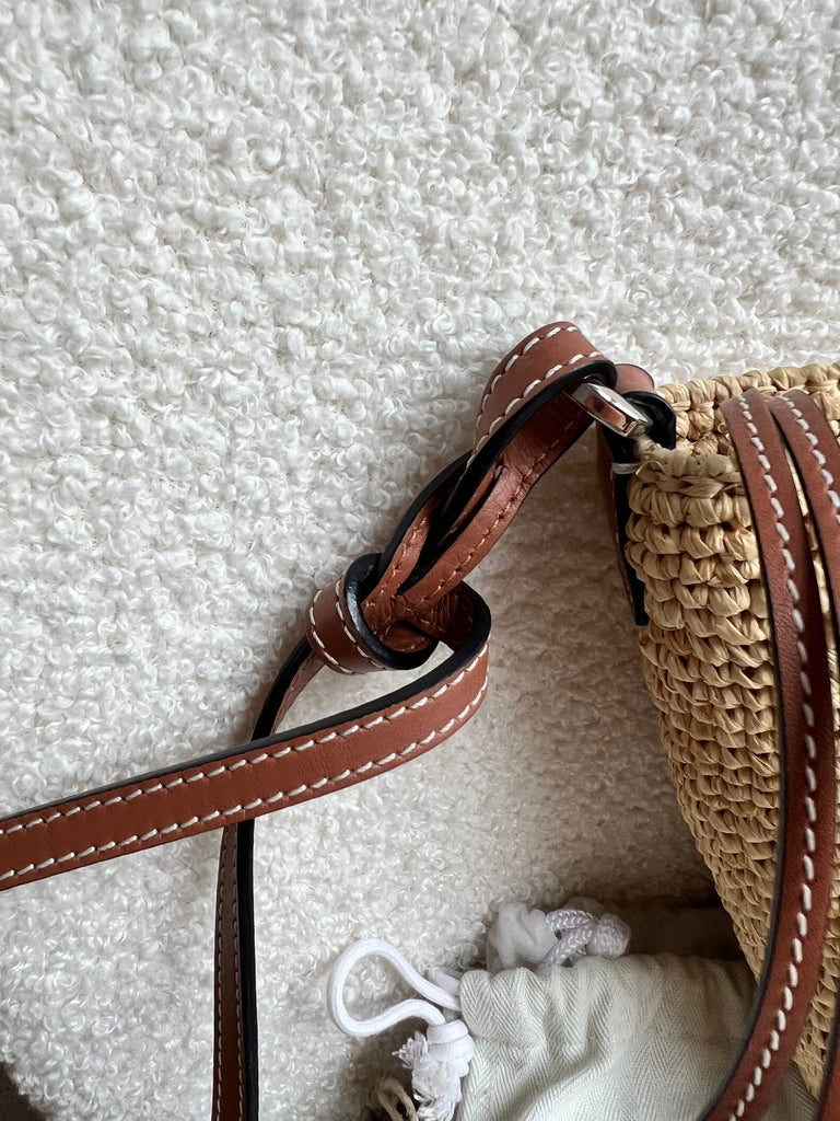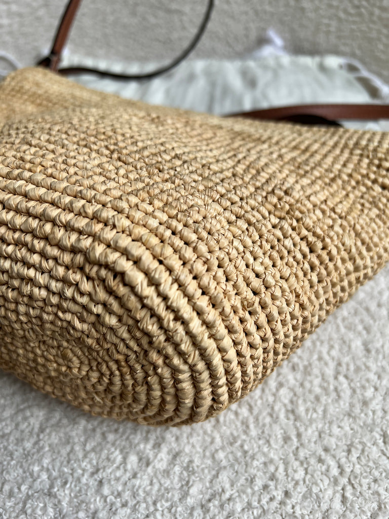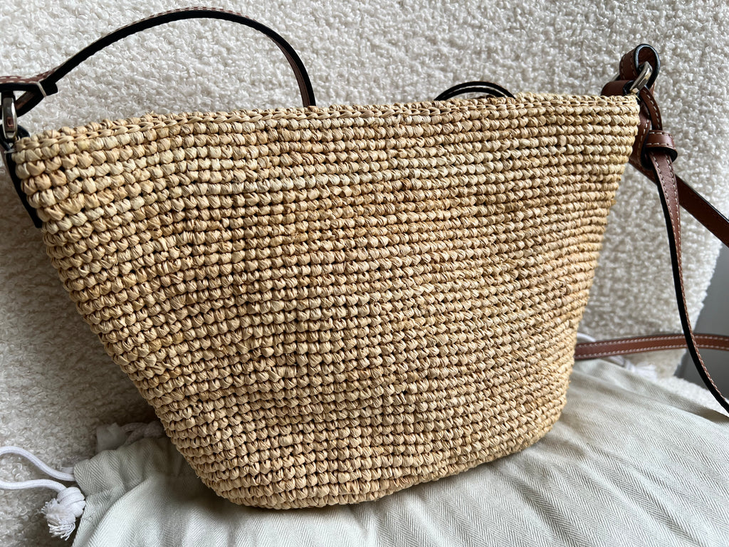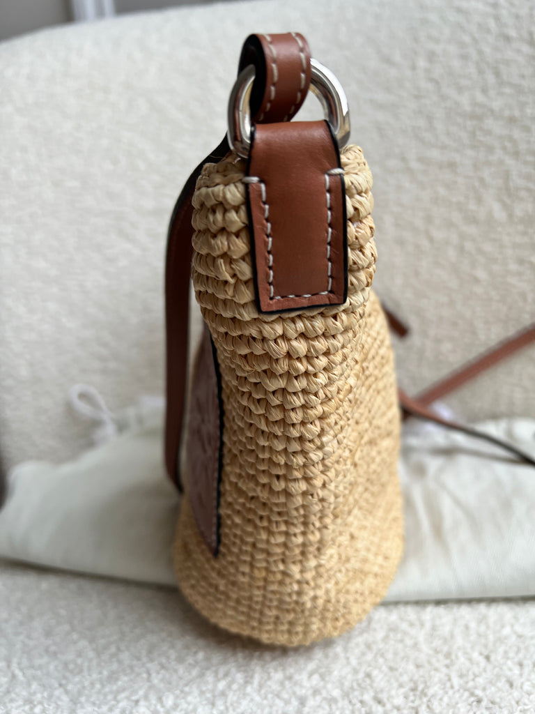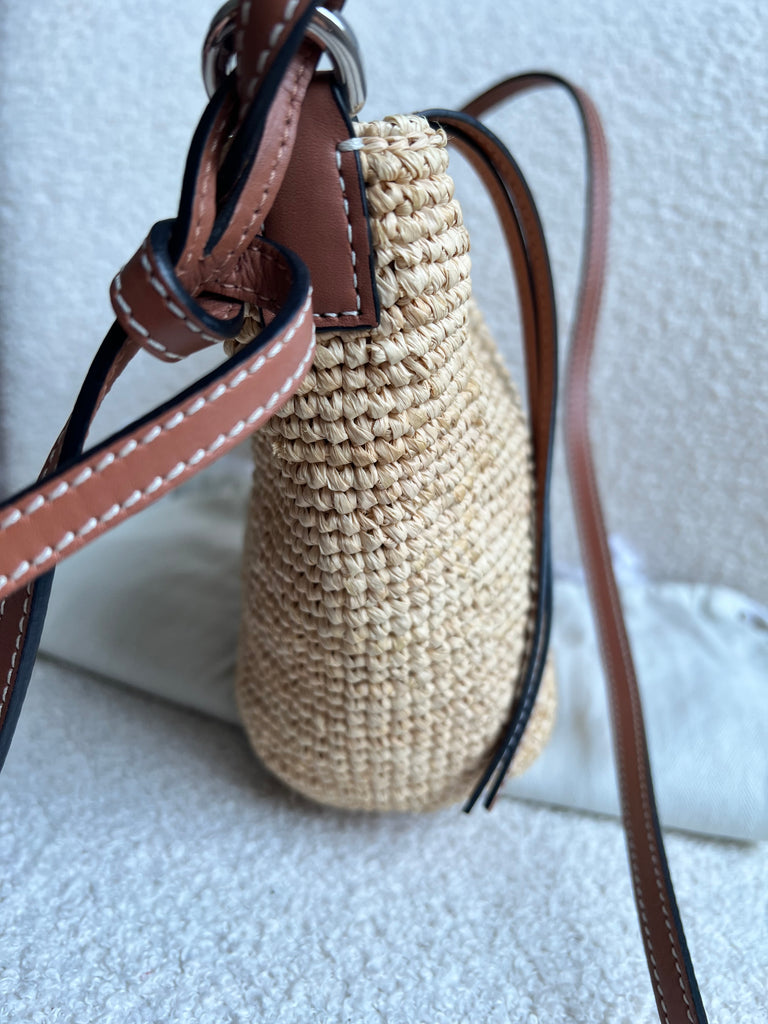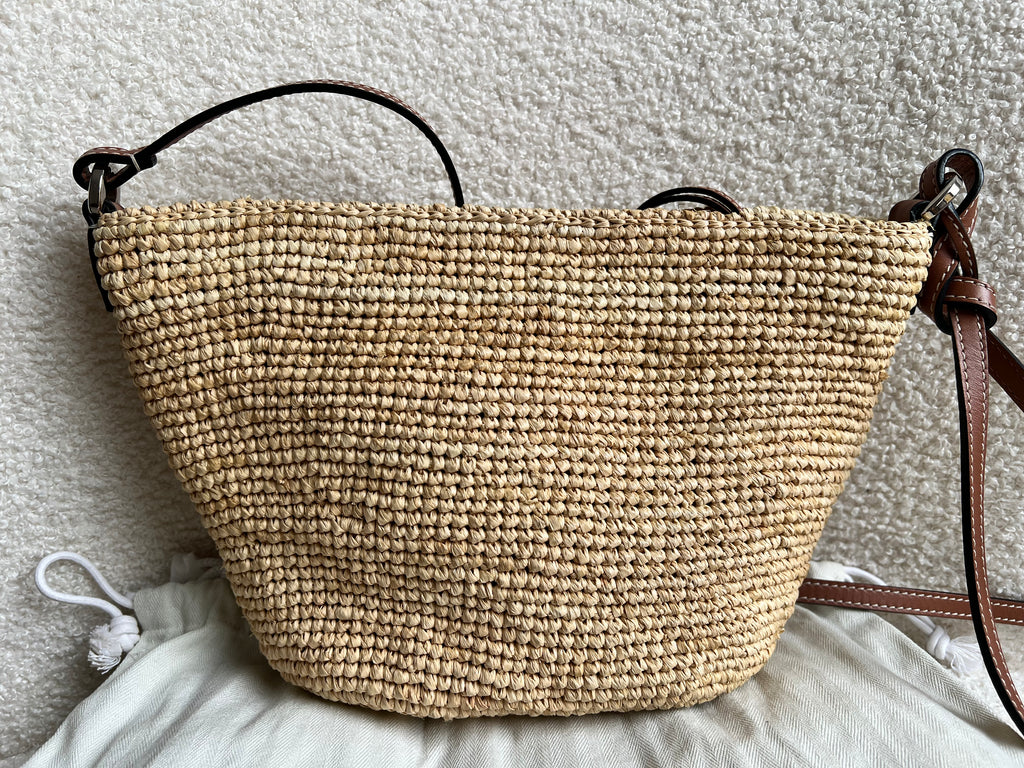 Loewe x Paula’s Ibiza Cross Bag in Raffia and tan calfskin. This cross body pochette is crafted from woven raffia, and makes the perfect casual beach or holiday accessory. Zip closure with leather shoulder strap. Can be worn cross body.