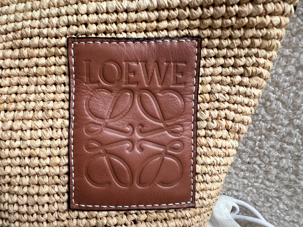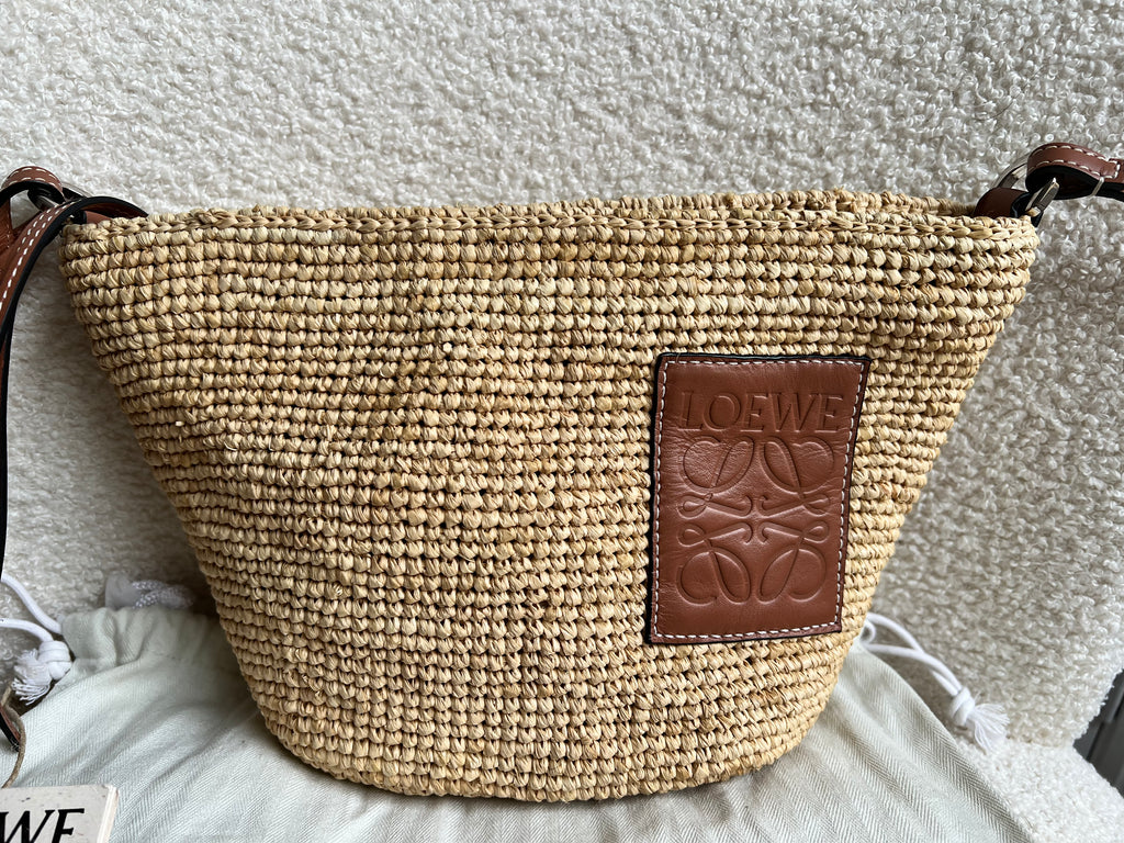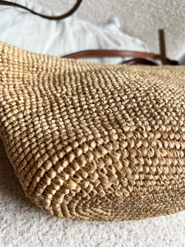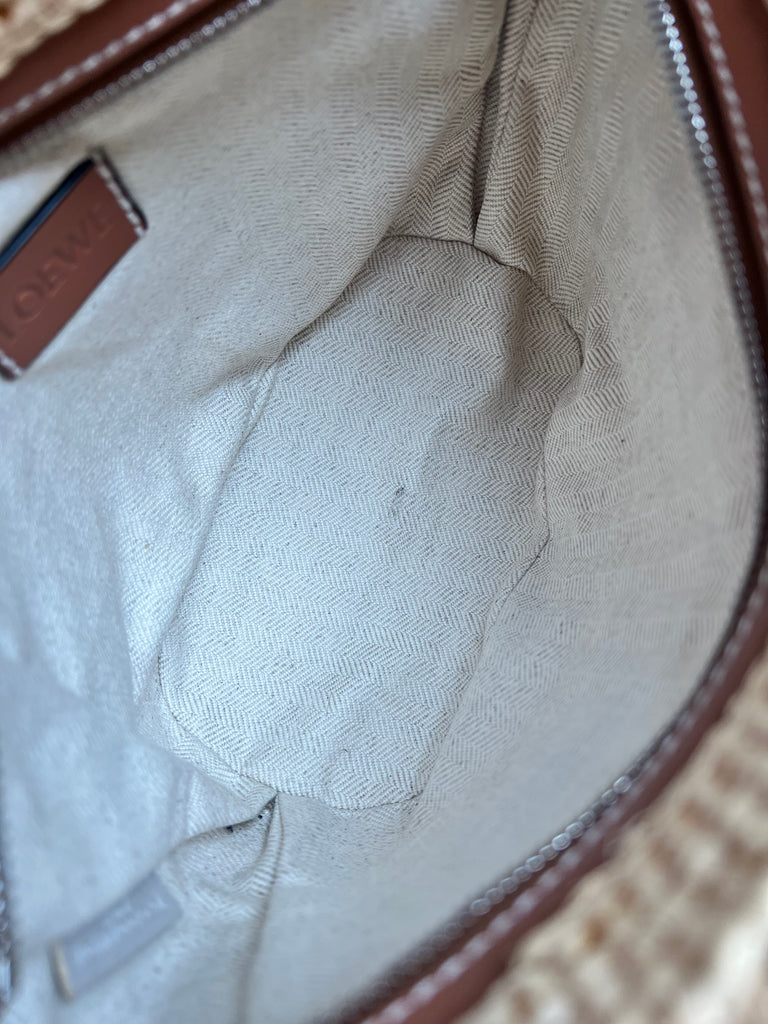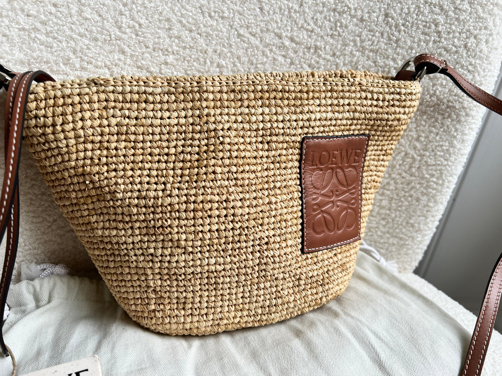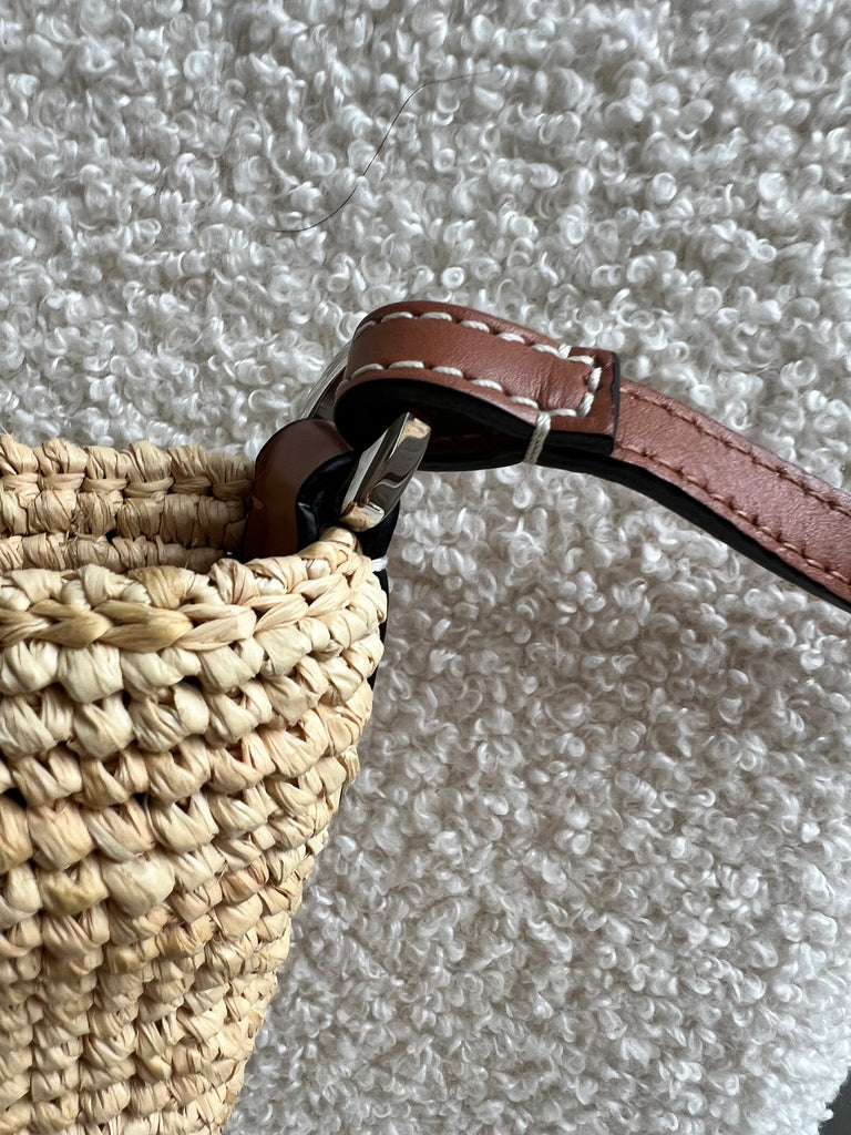 Loewe x Paula’s Ibiza Cross Bag in Raffia and tan calfskin. This cross body pochette is crafted from woven raffia, and makes the perfect casual beach or holiday accessory. Zip closure with leather shoulder strap. Can be worn cross body.
