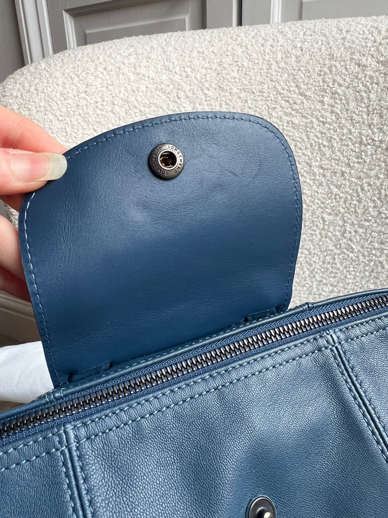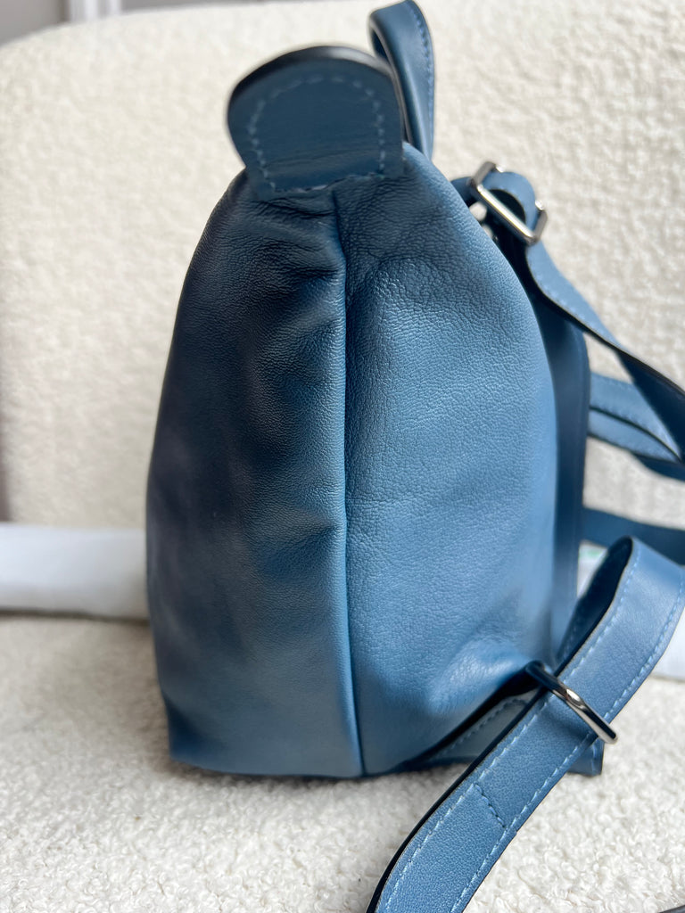 Longchamp Mini Le Pliage Backpack in Navy Blue Metis Leather with silver hardware. Metis leather is a combination of goat and calfskin and has a smooth texture. This handy , slightly slouchy backpack is perfect for on the go. With carry options or handle or over shoulder / as a backpack, it is perfect for day to day use and is secured by a popper closure flap and zipper.