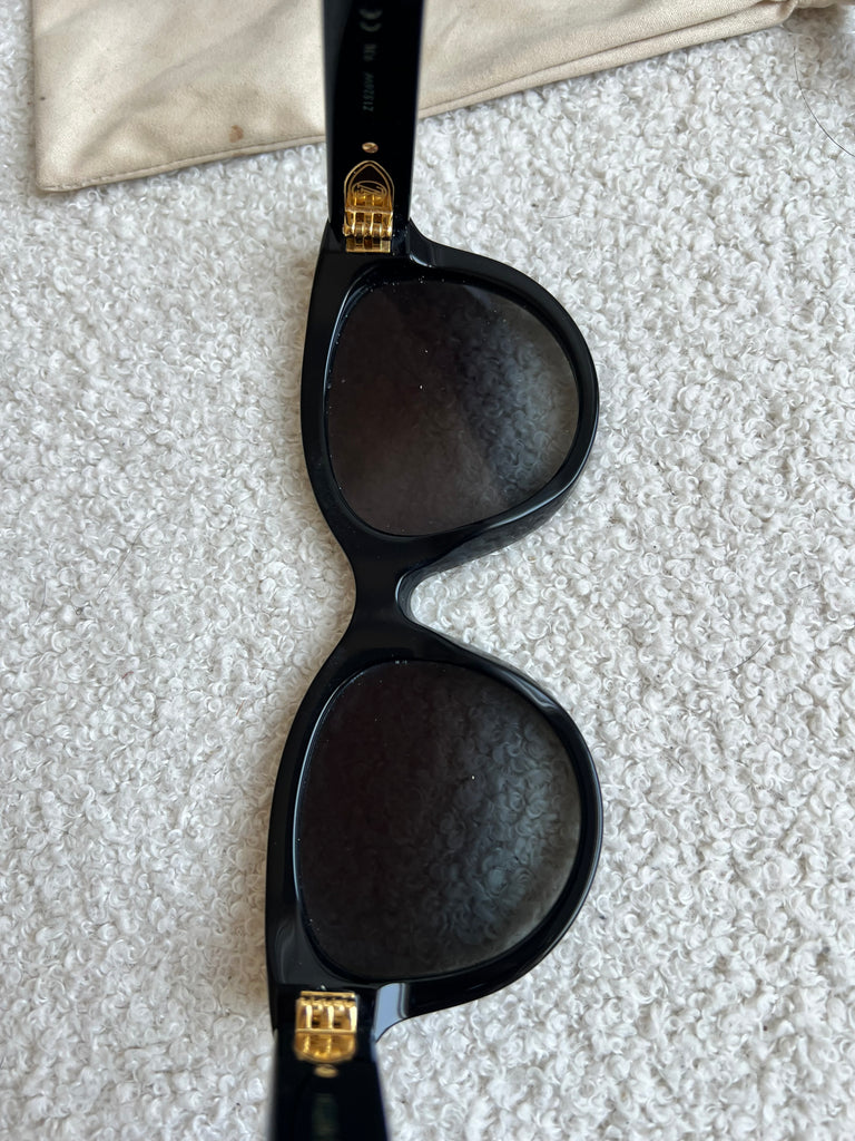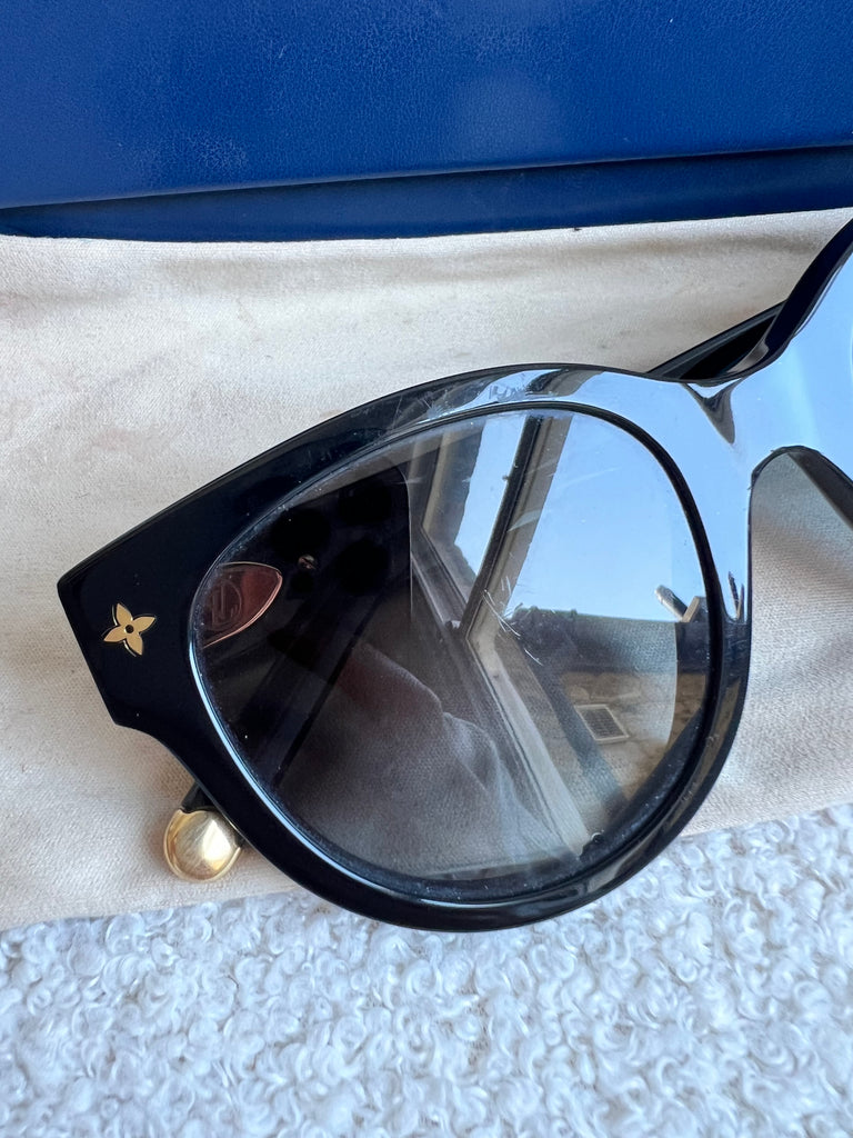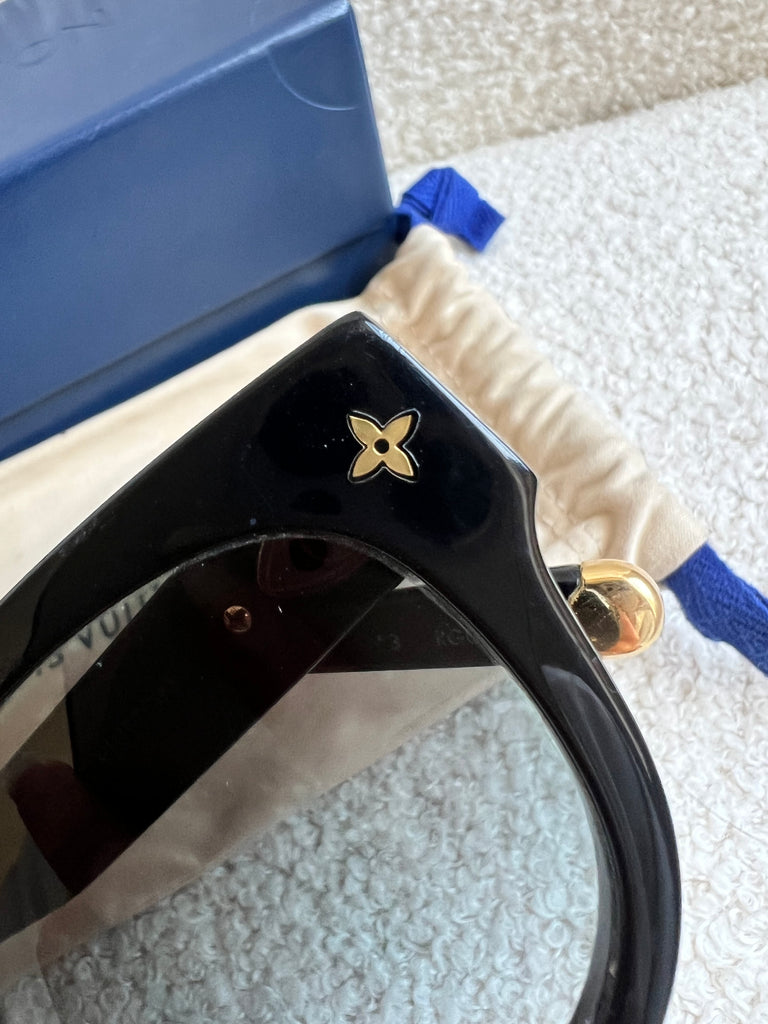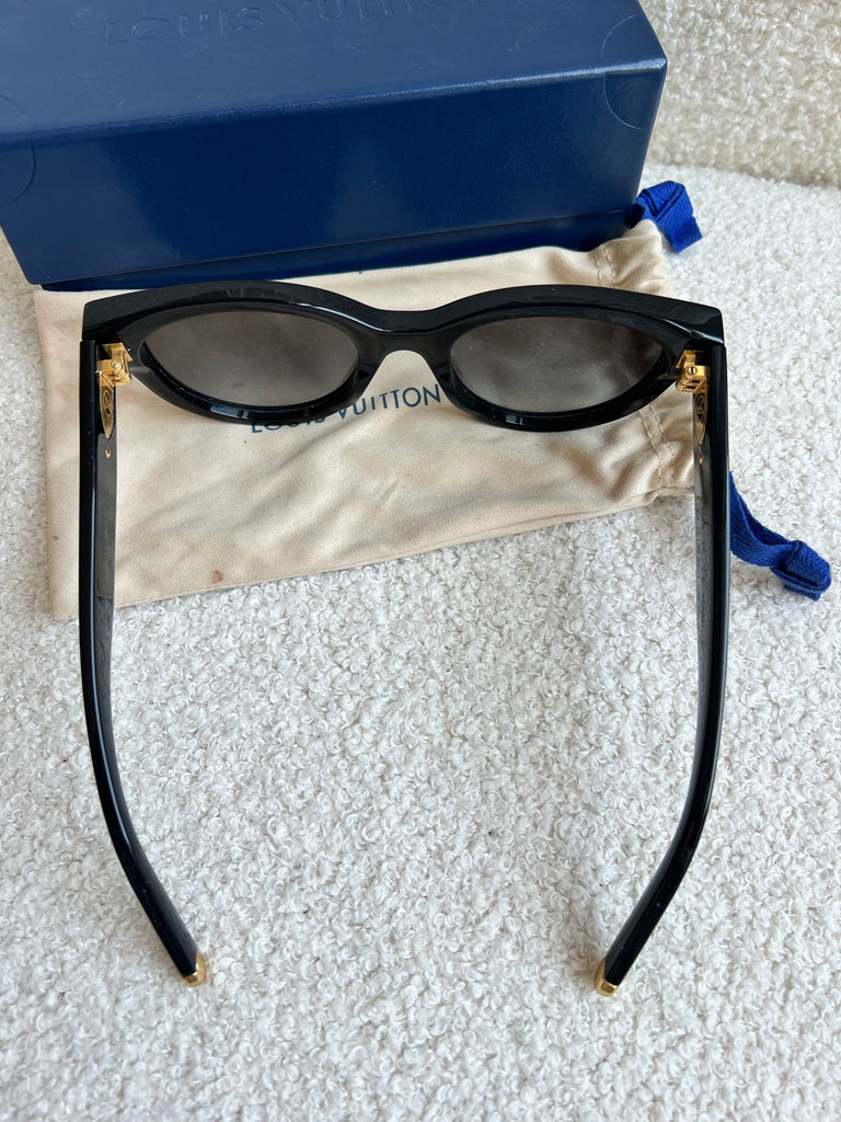 Louis Vuitton My Monogram Sunglasses in black with gold. These timeless My Monogram Square Sunglasses combine the traditional square shape with modern feminine flair. The bold chunky frames are offset by delicate gleaming Monogram Flowers on the bevels. Other iconic LV symbols include intricate Monogram motifs along the temples and LV Circles on the inner hinges for a signature finish.