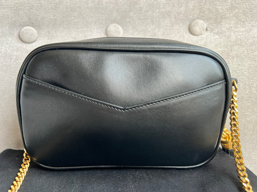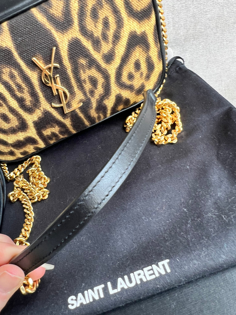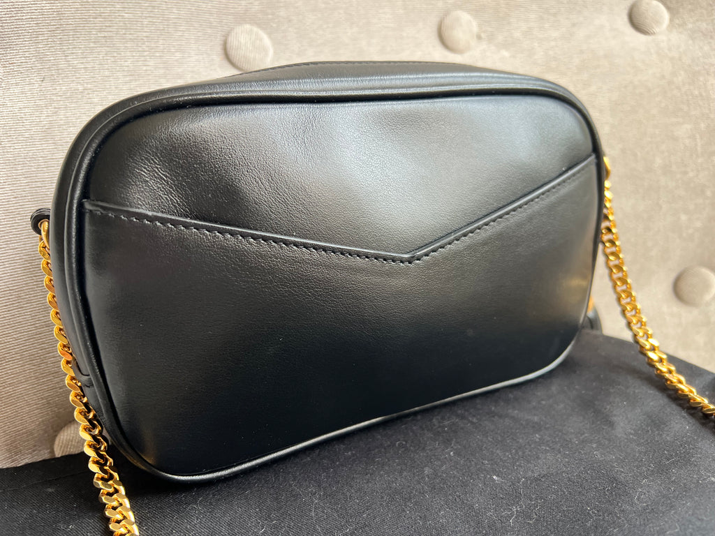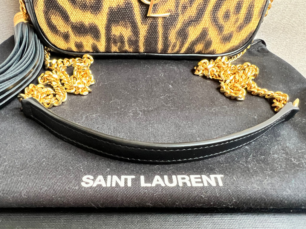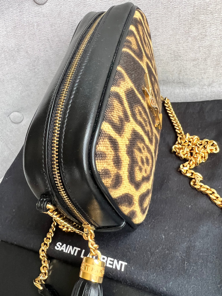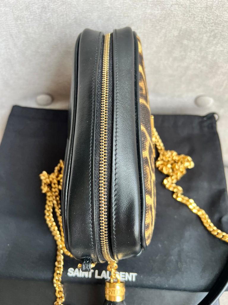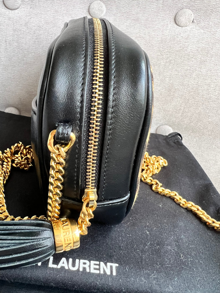YSL Mini Lou Camera Bag in Black quilted calfskin leather and leopard canvas with gold hardware. This mini camera bag style is structured in this robust calfskin and canvas. Zip around closure and long adjustable strap means it can be worn over shoulder or cross body. Ideal for day to night wear.