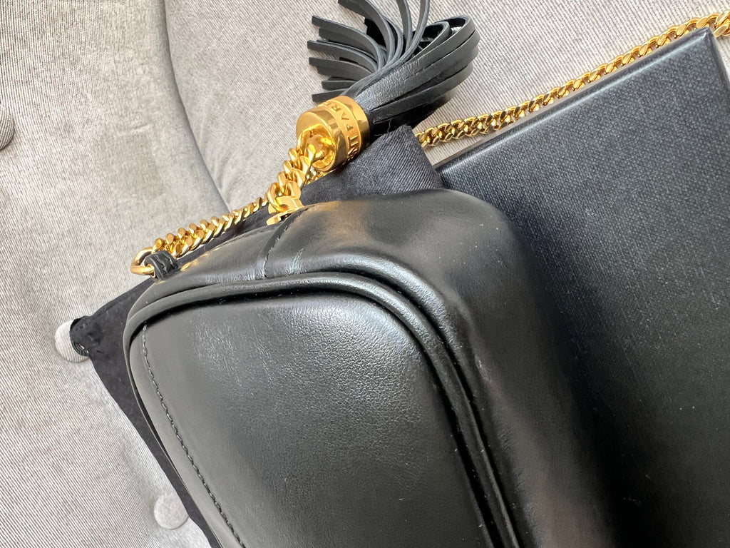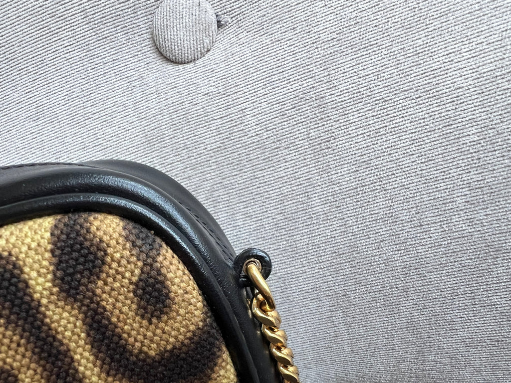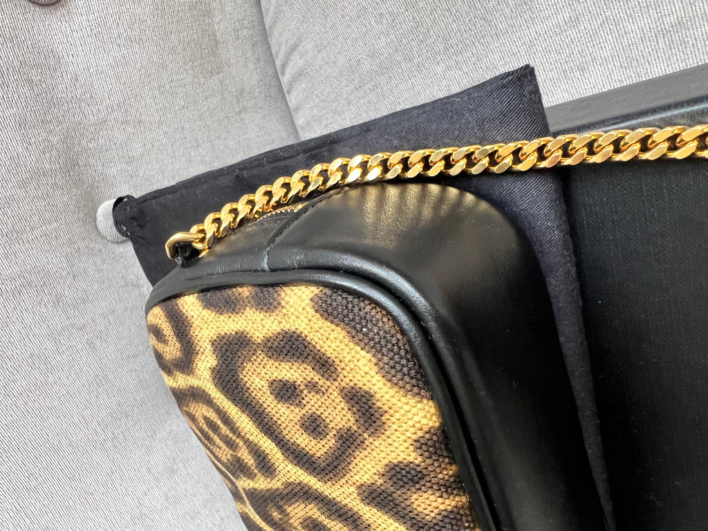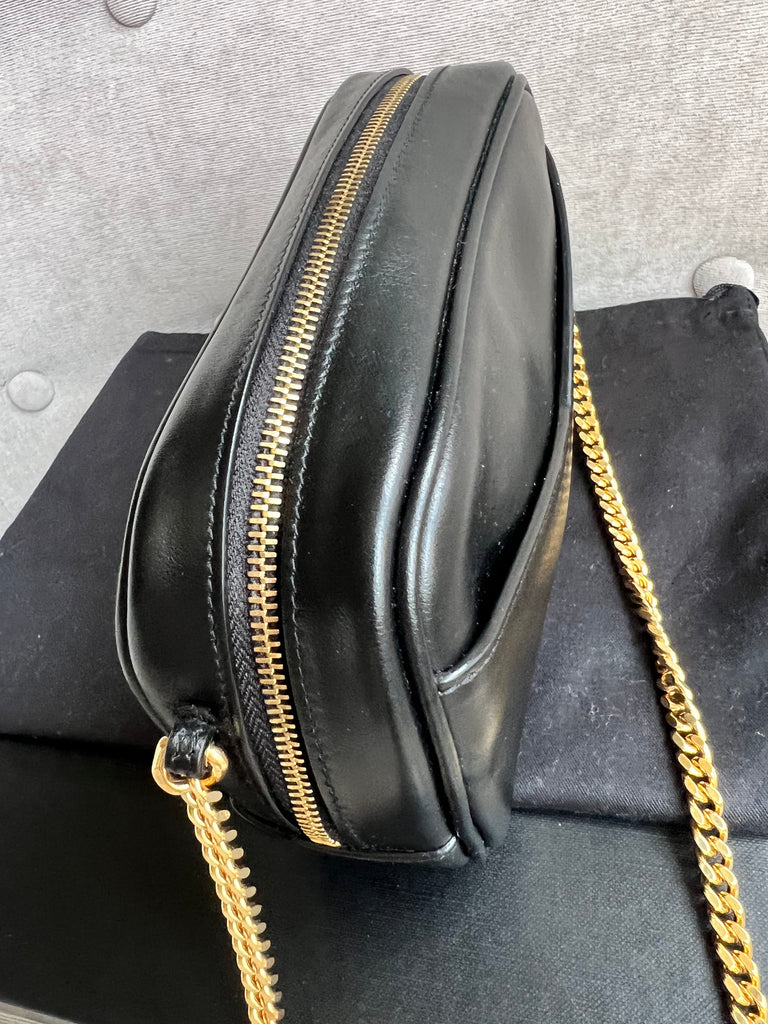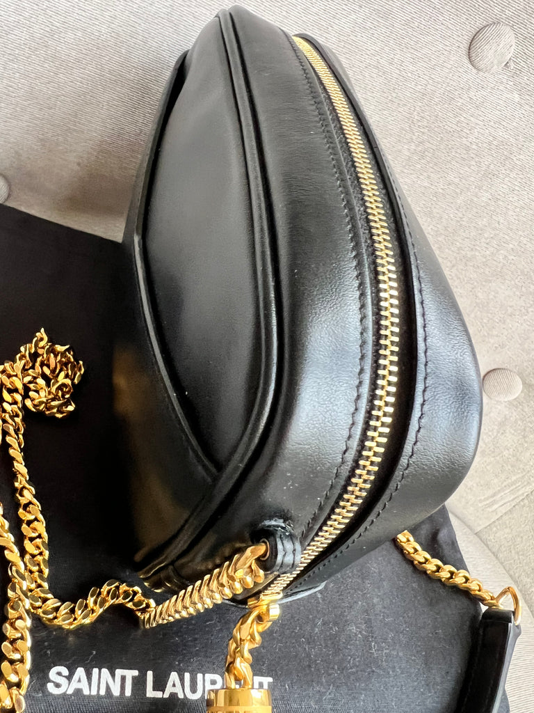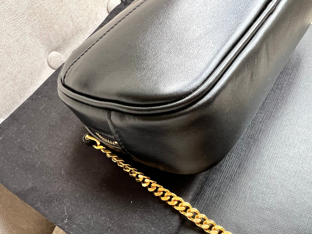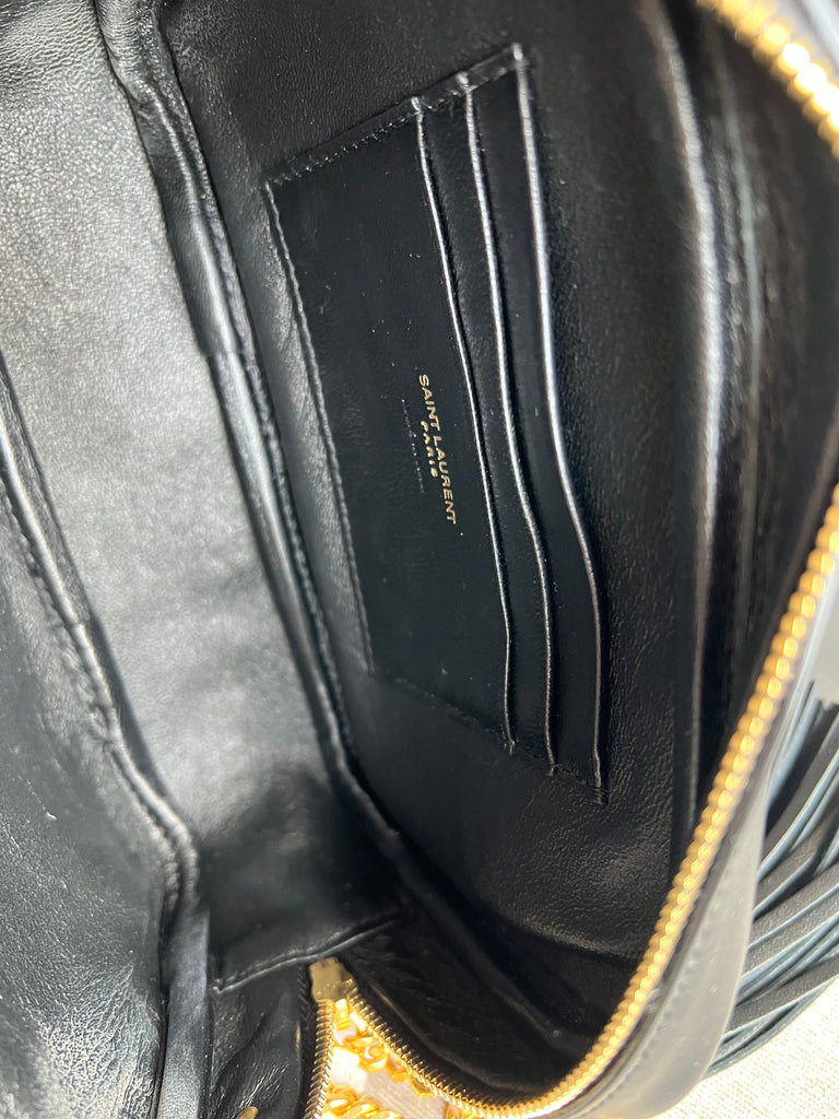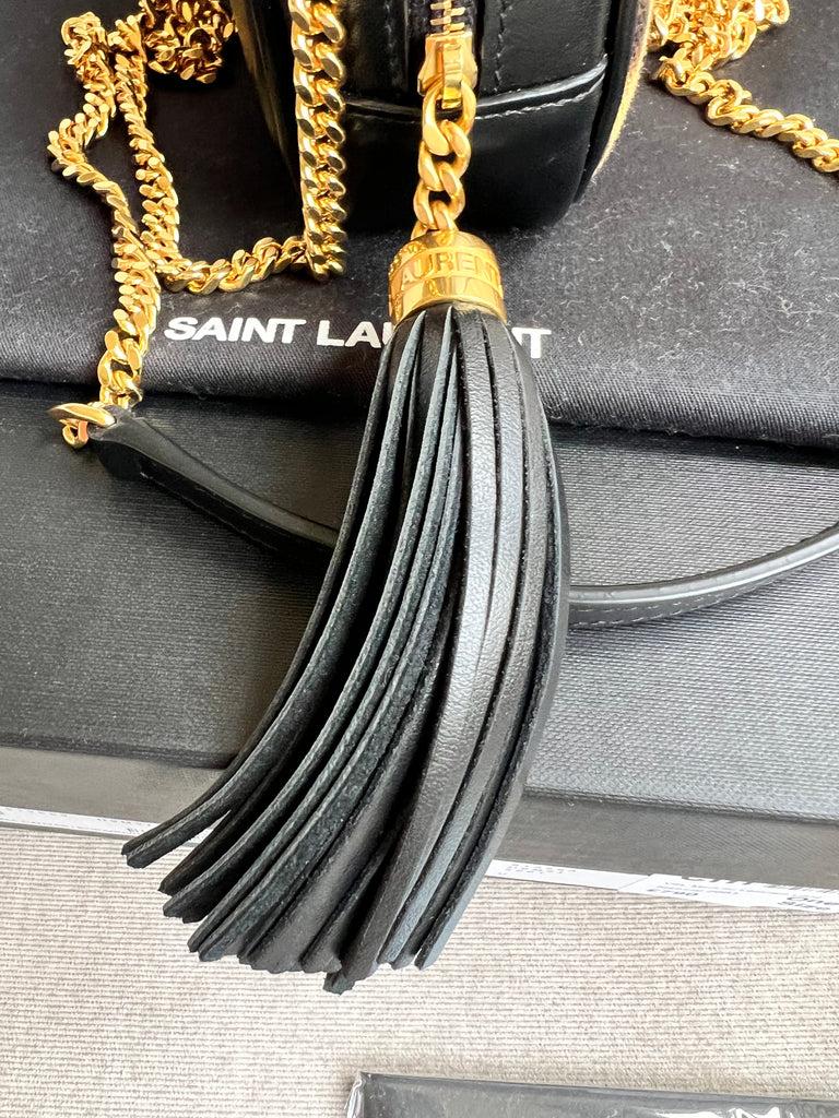 YSL Mini Lou Camera Bag in Black quilted calfskin leather and leopard canvas with gold hardware. This mini camera bag style is structured in this robust calfskin and canvas. Zip around closure and long adjustable strap means it can be worn over shoulder or cross body. Ideal for day to night wear.