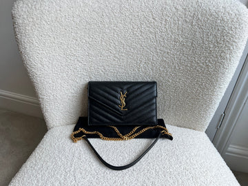 YSL Monogram Envelope Chain Wallet in Black Grain de Poudre embossed leather with gold hardware. This chain wallet style is perfect or an evening or night out to carry the essentials. Can be worn cross body or over shoulder, or as a handheld clutch with chain tucked inside. Plenty of card slots inside and a zipped section for coins. Classic, timeless style.