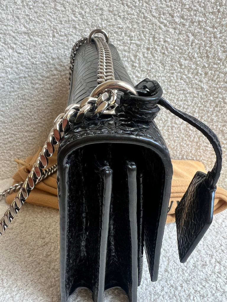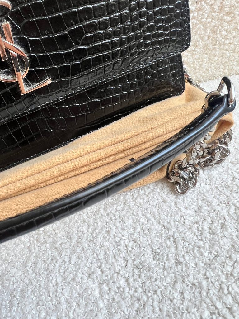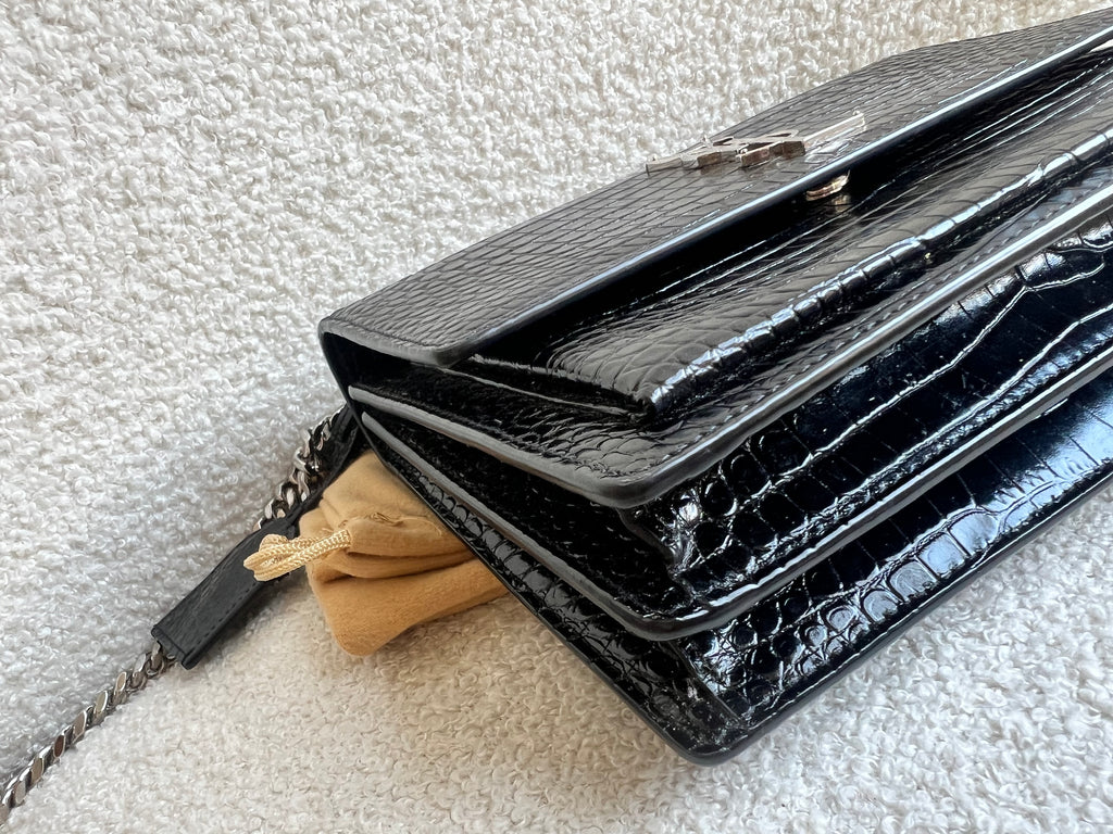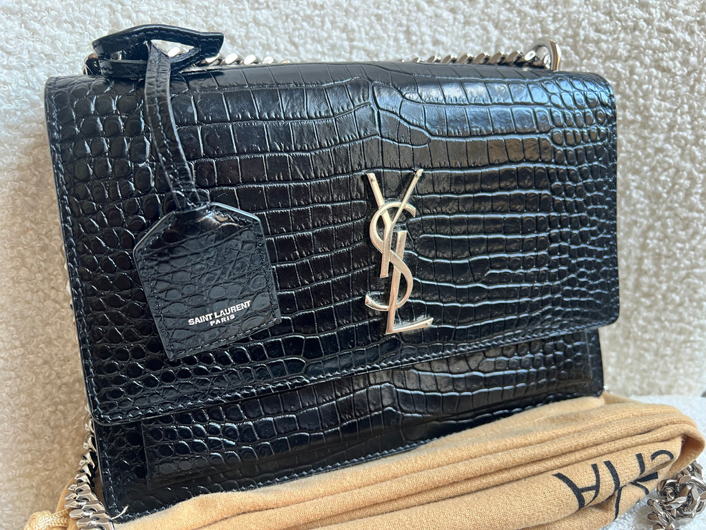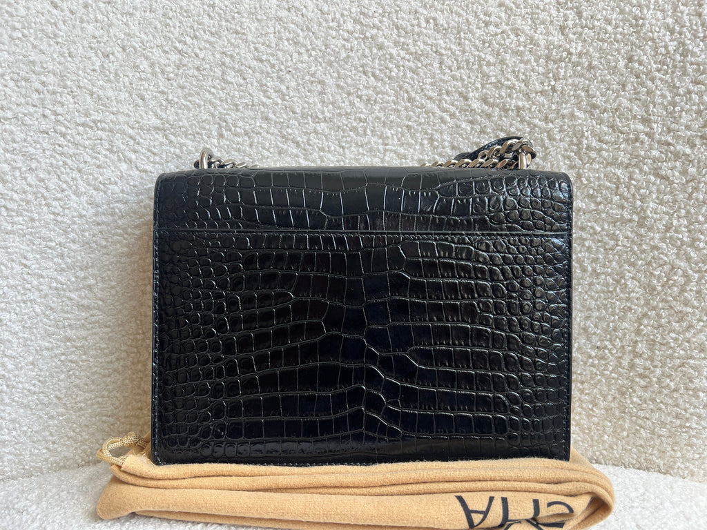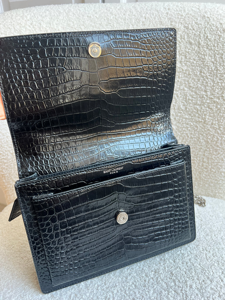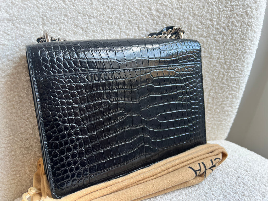 YSL Medium Sunset in Black Crocodile Embossed Shiny Leather with silver hardware. Decorated with the iconic metal YSL initials, featuring a flap with magnetic fastening and sliding chain strap with leather shoulder section. This classic, sophisticated style is structured in shape and is stunning in classic black. Small - medium in size, fits the essentials and could be used as either a day or night bag. The croc leather is durable and resistant to marks and scratches. Can be worn with the sliding chain doubled up or lengthened, over shoulder or cross body.