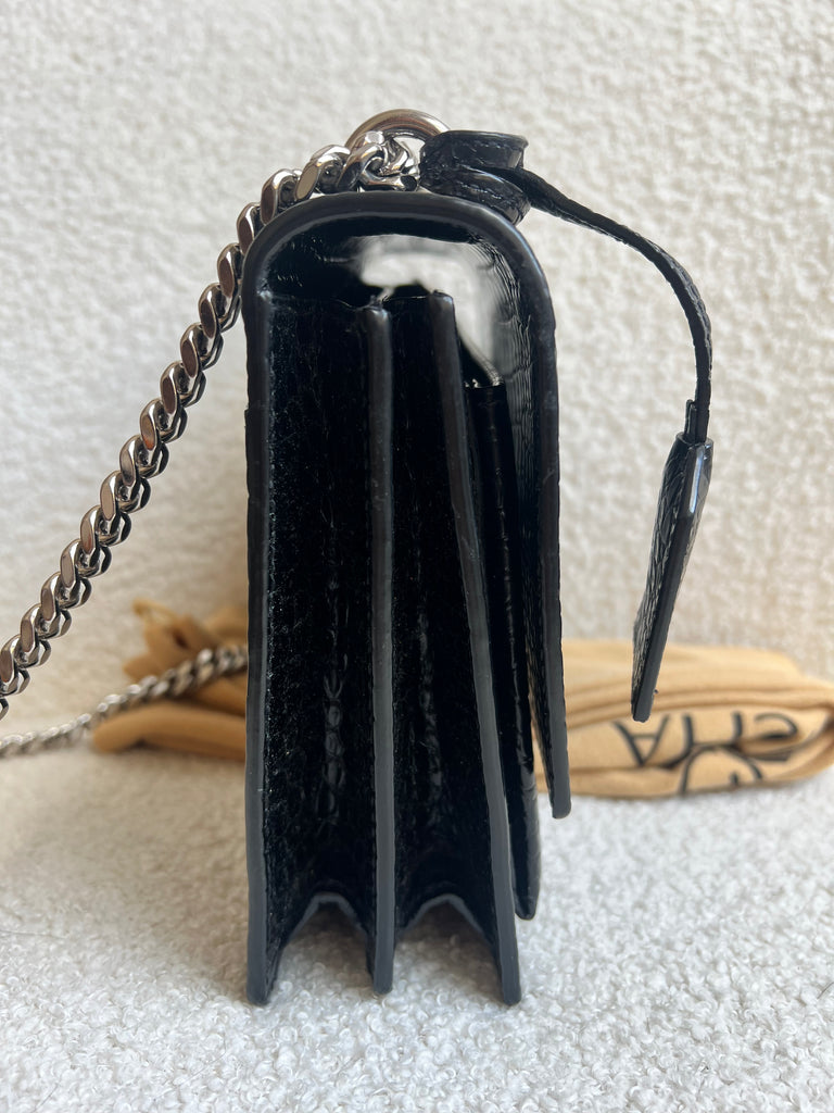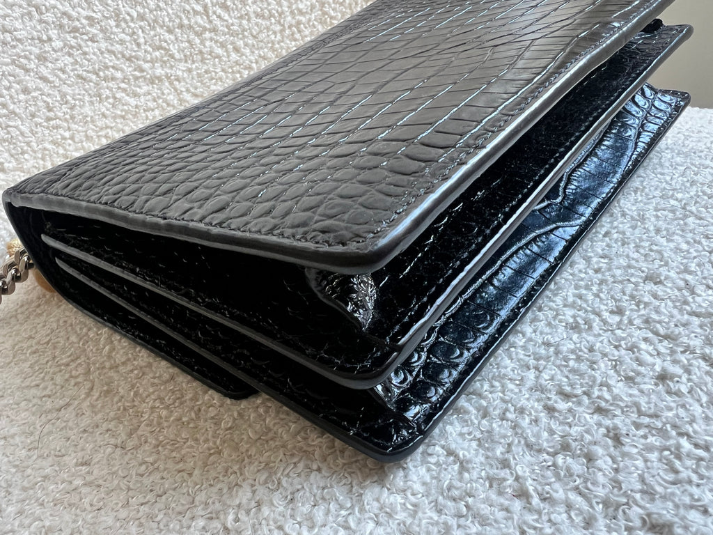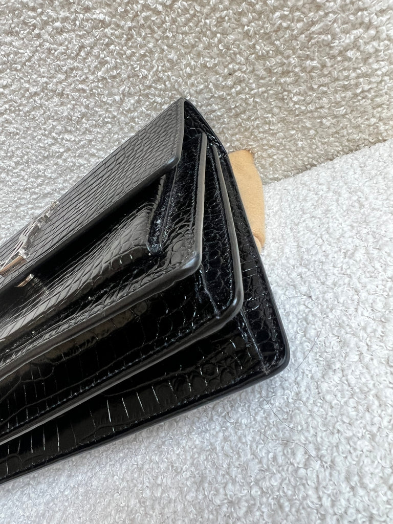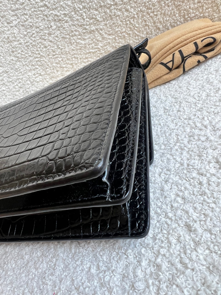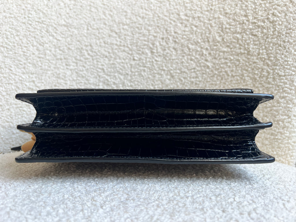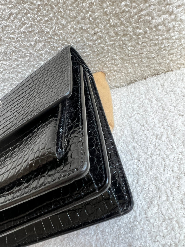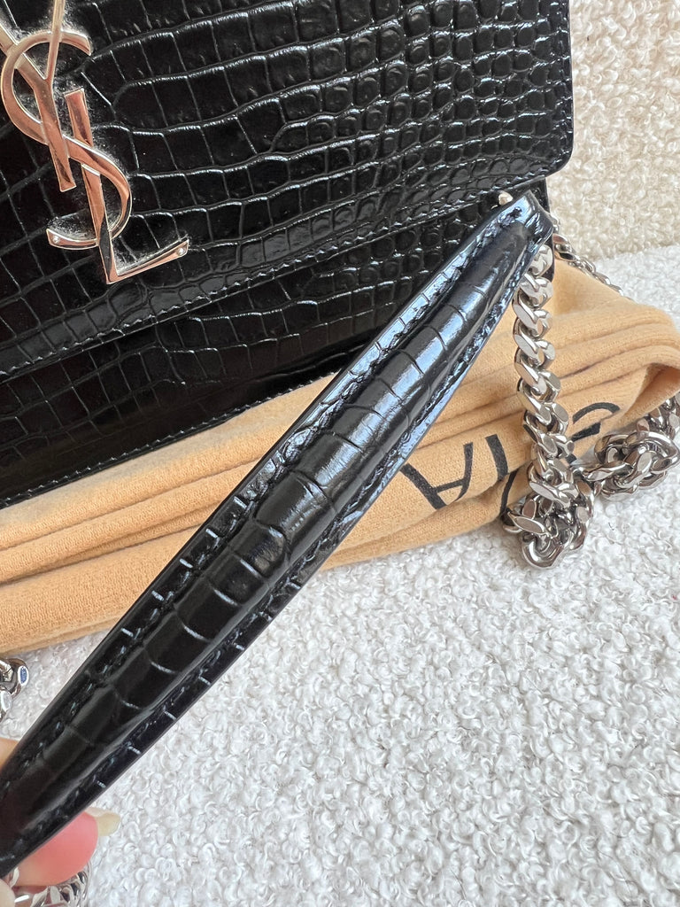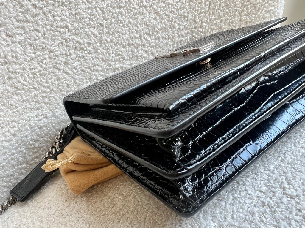 YSL Medium Sunset in Black Crocodile Embossed Shiny Leather with silver hardware. Decorated with the iconic metal YSL initials, featuring a flap with magnetic fastening and sliding chain strap with leather shoulder section. This classic, sophisticated style is structured in shape and is stunning in classic black. Small - medium in size, fits the essentials and could be used as either a day or night bag. The croc leather is durable and resistant to marks and scratches. Can be worn with the sliding chain doubled up or lengthened, over shoulder or cross body.