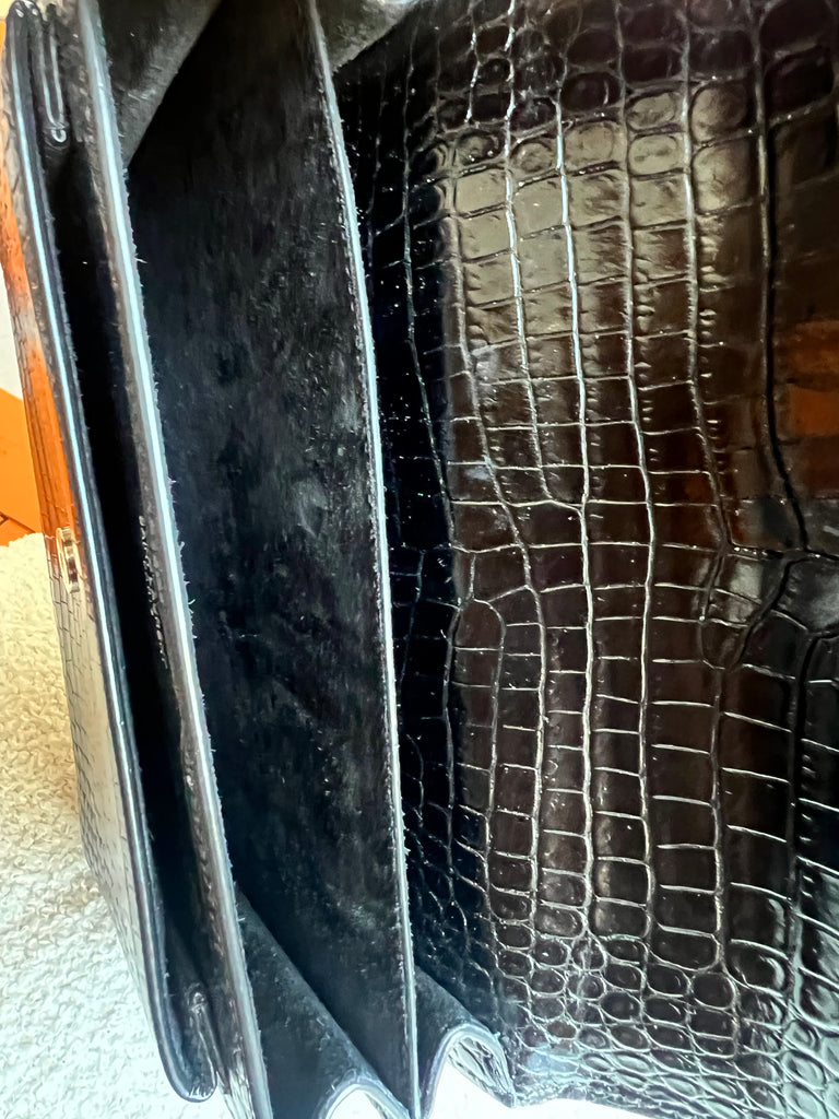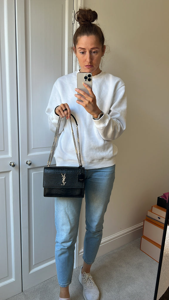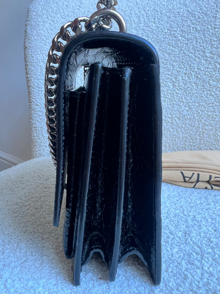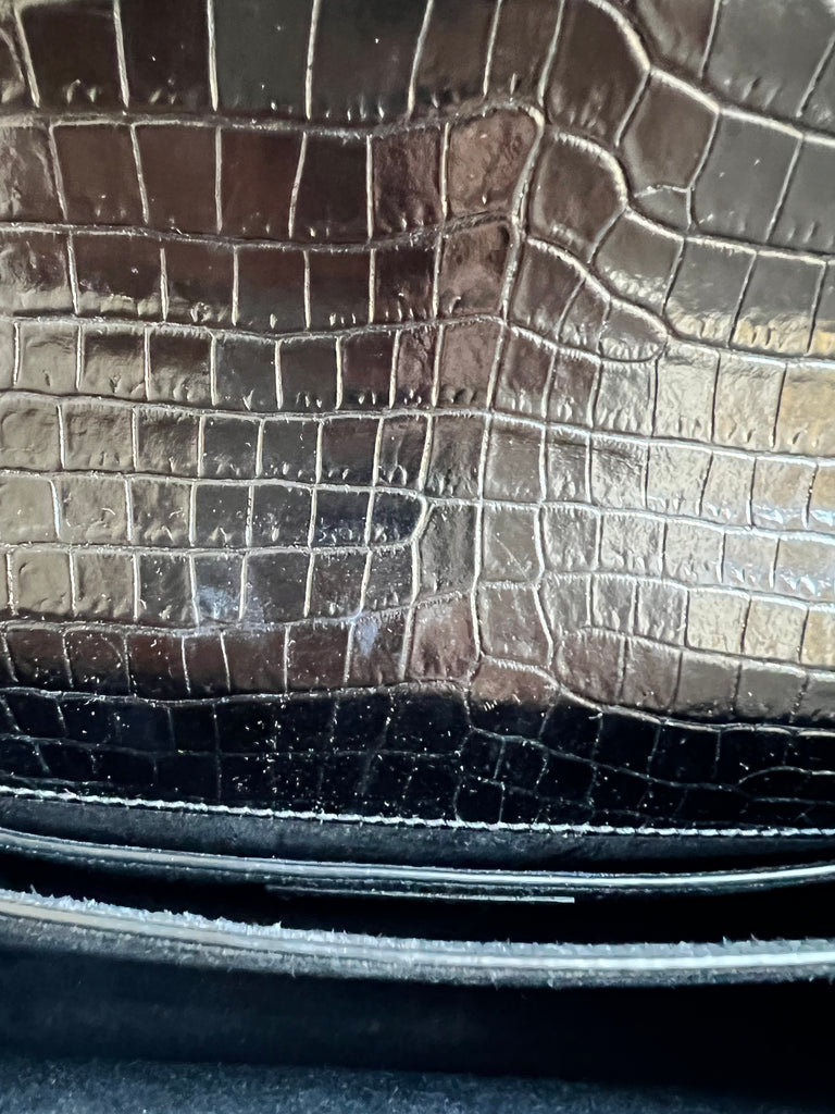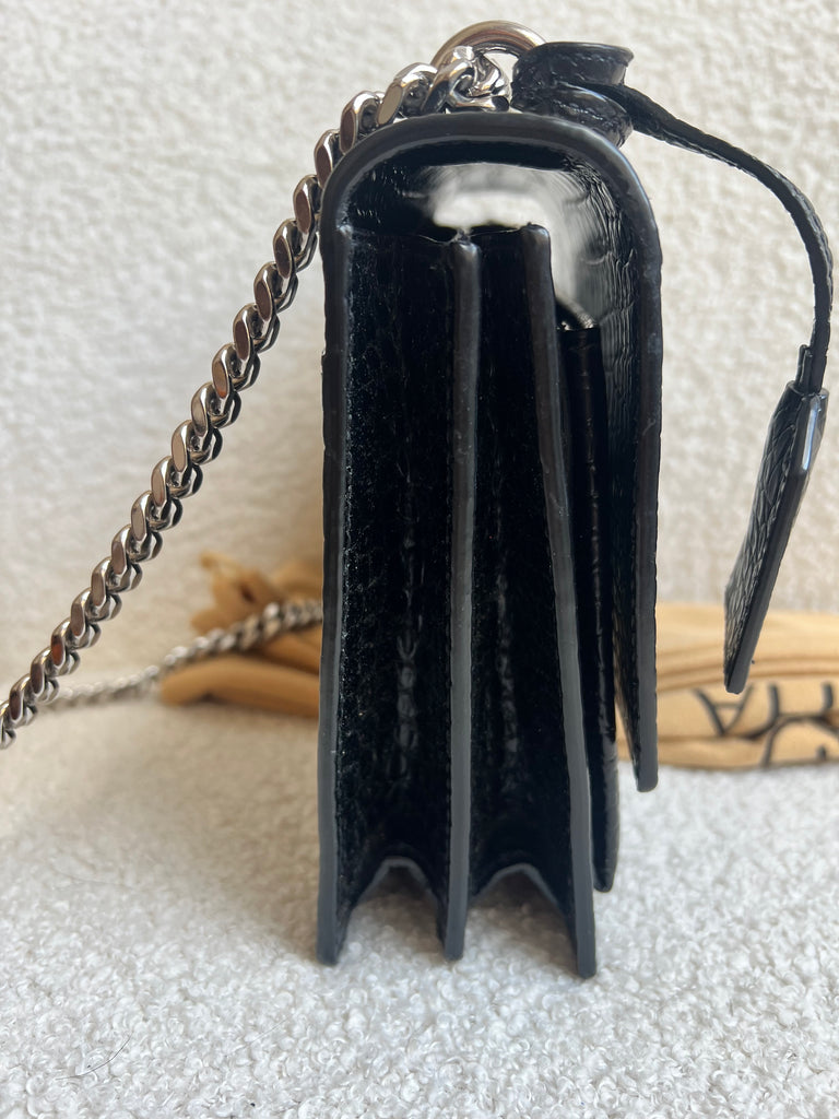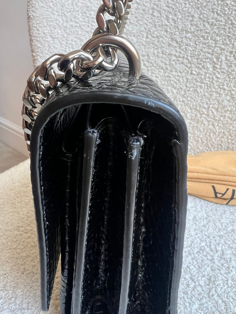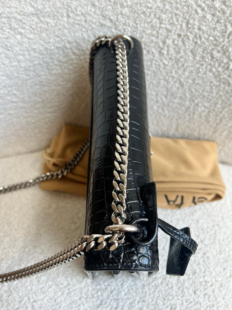 YSL Medium Sunset in Black Crocodile Embossed Shiny Leather with silver hardware. Decorated with the iconic metal YSL initials, featuring a flap with magnetic fastening and sliding chain strap with leather shoulder section. This classic, sophisticated style is structured in shape and is stunning in classic black. Small - medium in size, fits the essentials and could be used as either a day or night bag. The croc leather is durable and resistant to marks and scratches. Can be worn with the sliding chain doubled up or lengthened, over shoulder or cross body.