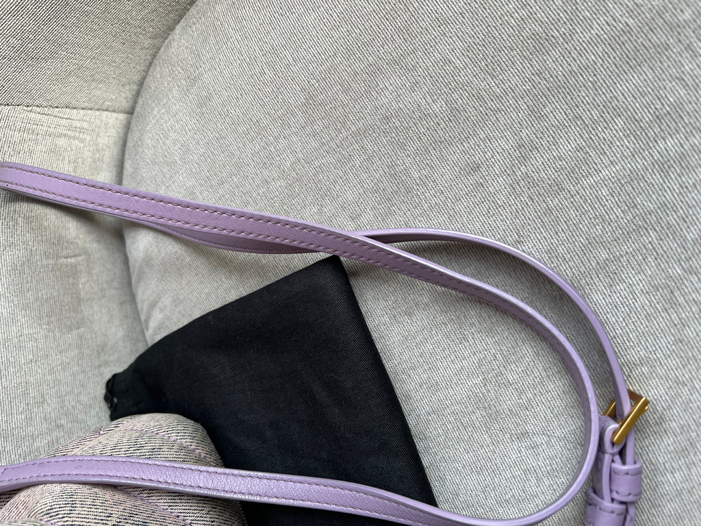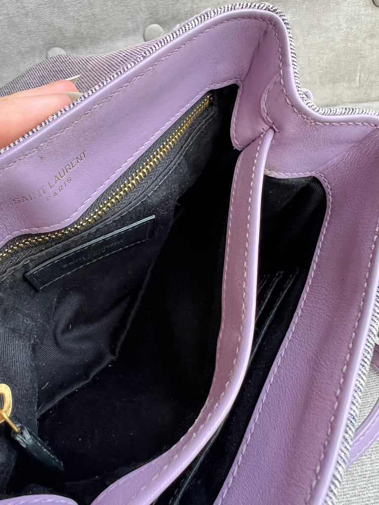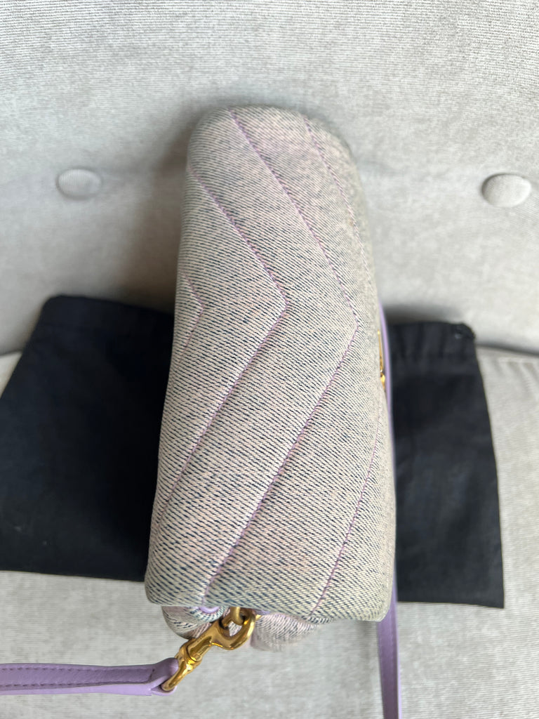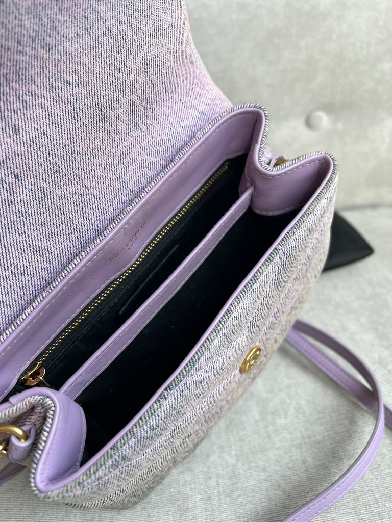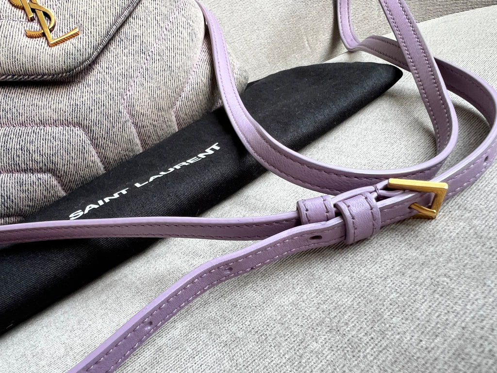 YSL Toy Lou Lou in Lilac Denim Matelasse "Y" Leather with Brass hardware. Front flap features the iconic metal YSL initials. Effortlessly chic and sophisticated - this size is the smallest in the Lou Lou family and is perfect for every day use for those who prefer a lightweight smaller sized bag. This style can be worn over the shoulder or cross body using the detachable lilac leather shoulder strap.