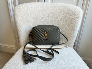 YSL Lou Camera Bag in Khaki Grey Quilted Leather with antique gold hardware. This cross body camera style bag is ideal for day to day use for those who prefer smaller sized day to day bag. Zip round closure and softly structured style, it is effortlessly chic and sophisticated and can be used for day or night. Can be worn over shoulder or cross body using long strap.