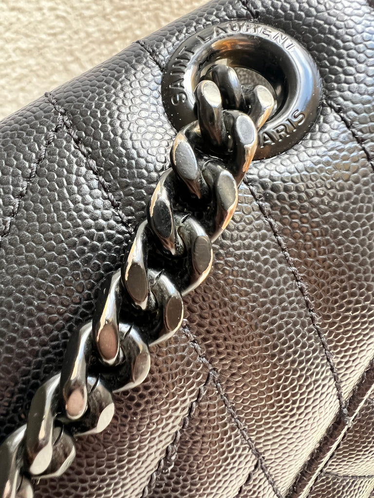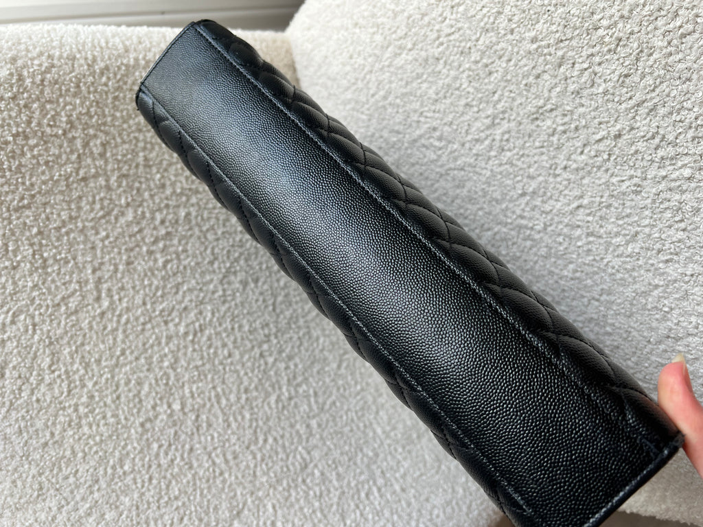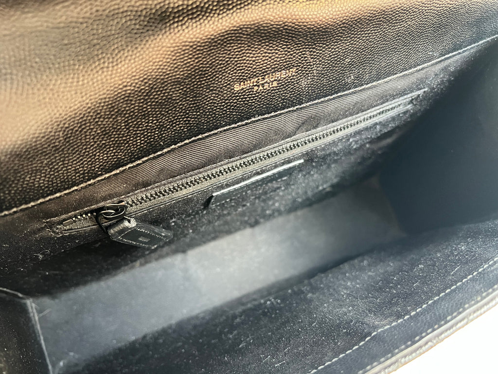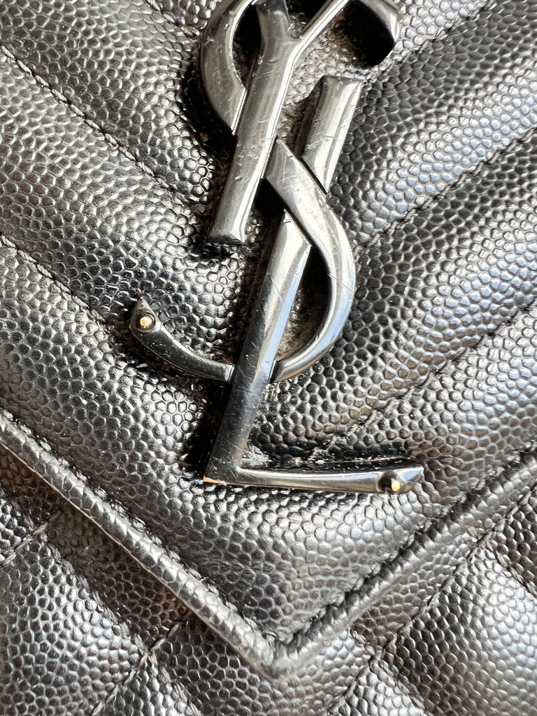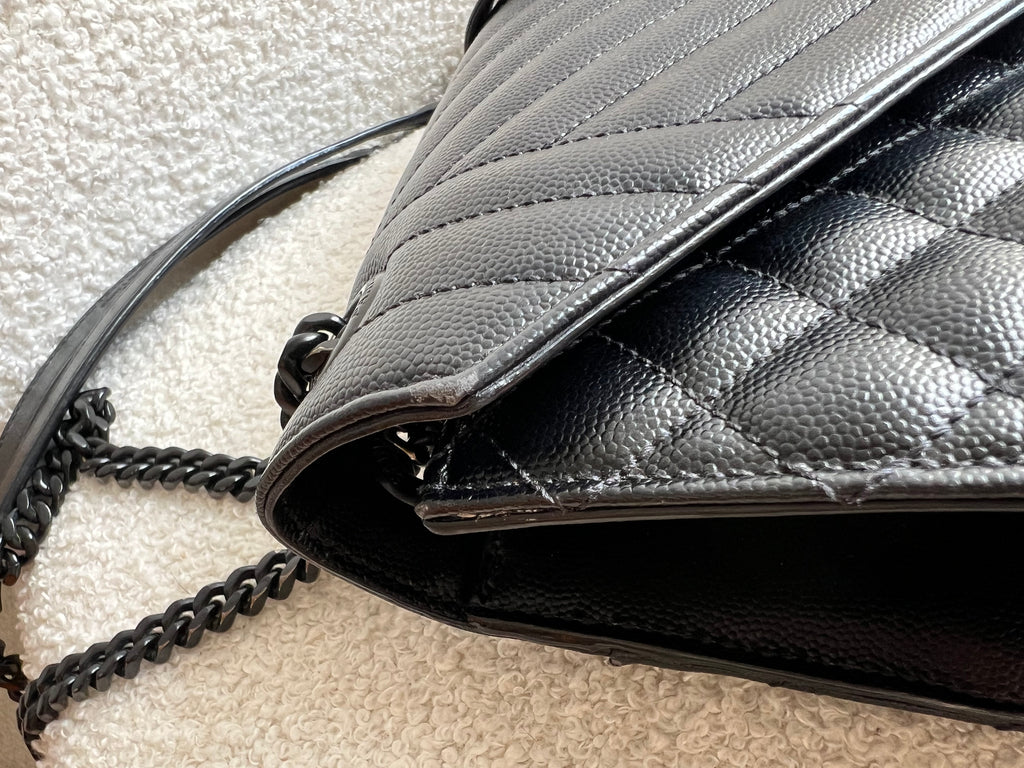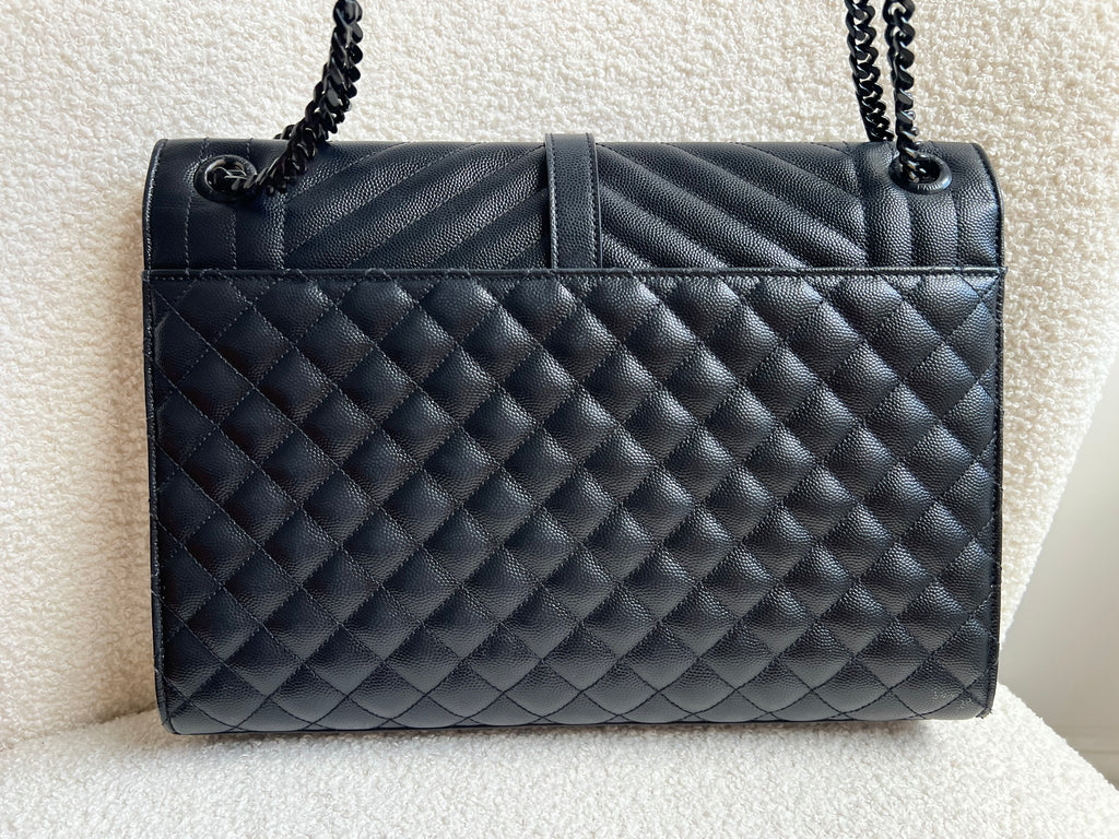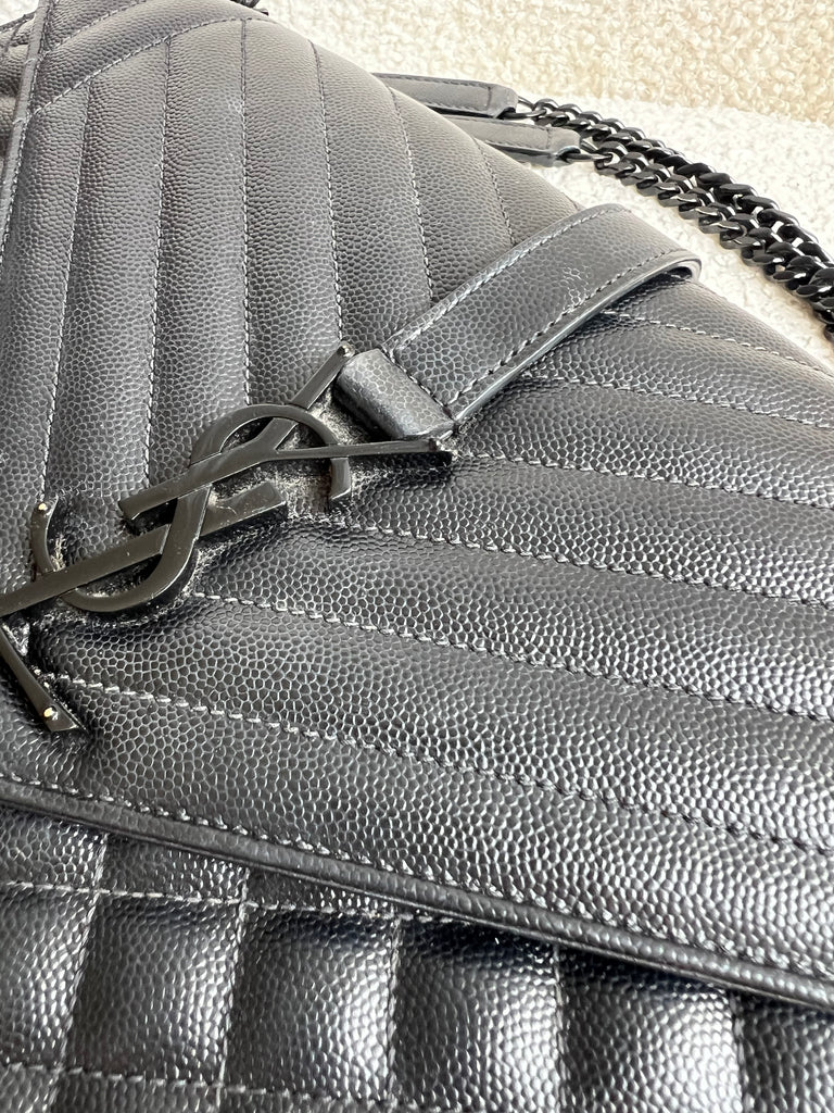 YSL Large Monogram Envelope Bag in Black mix matelasse grain de poudre embossed leather with black hardware. Front flap featuring iconic YSL lettering, vertical quilted overstitching and magnetic snap closure. Can be worn over shoulder or cross body using the sliding chain and leather strap. Perfect day to night bag that goes with almost any outfit.