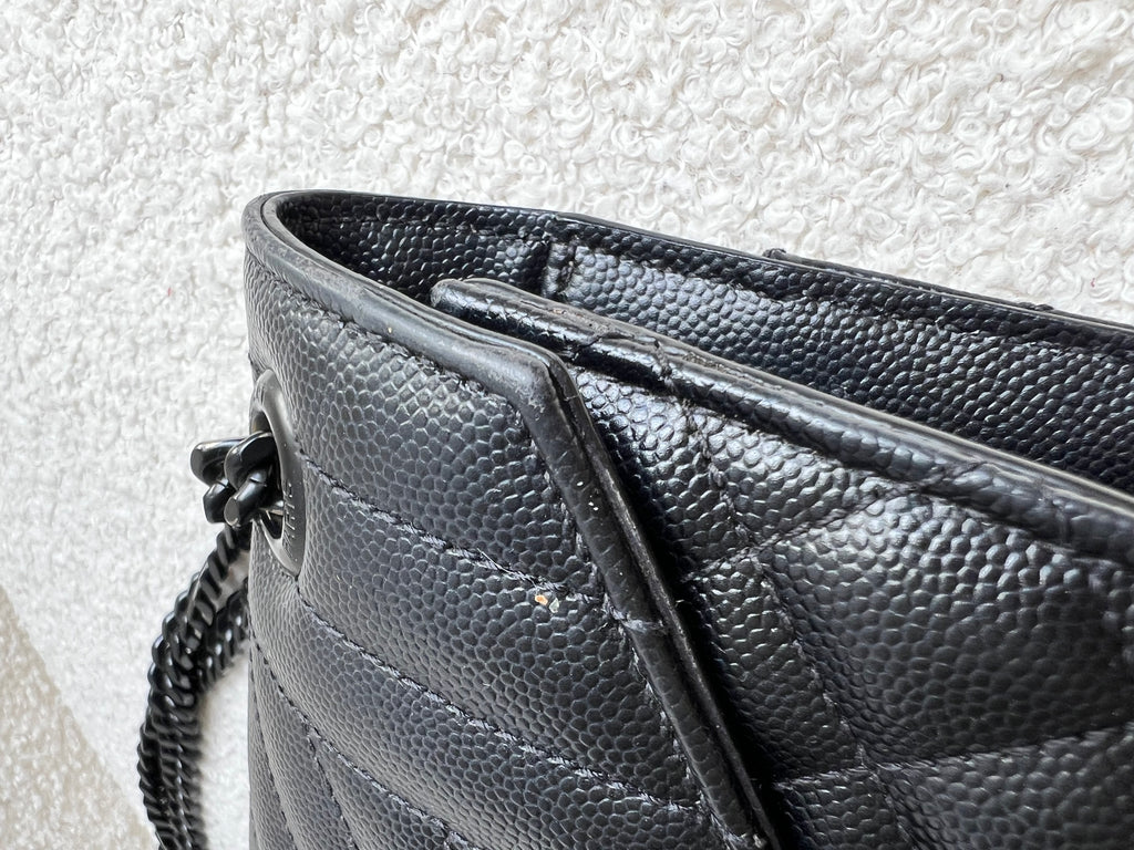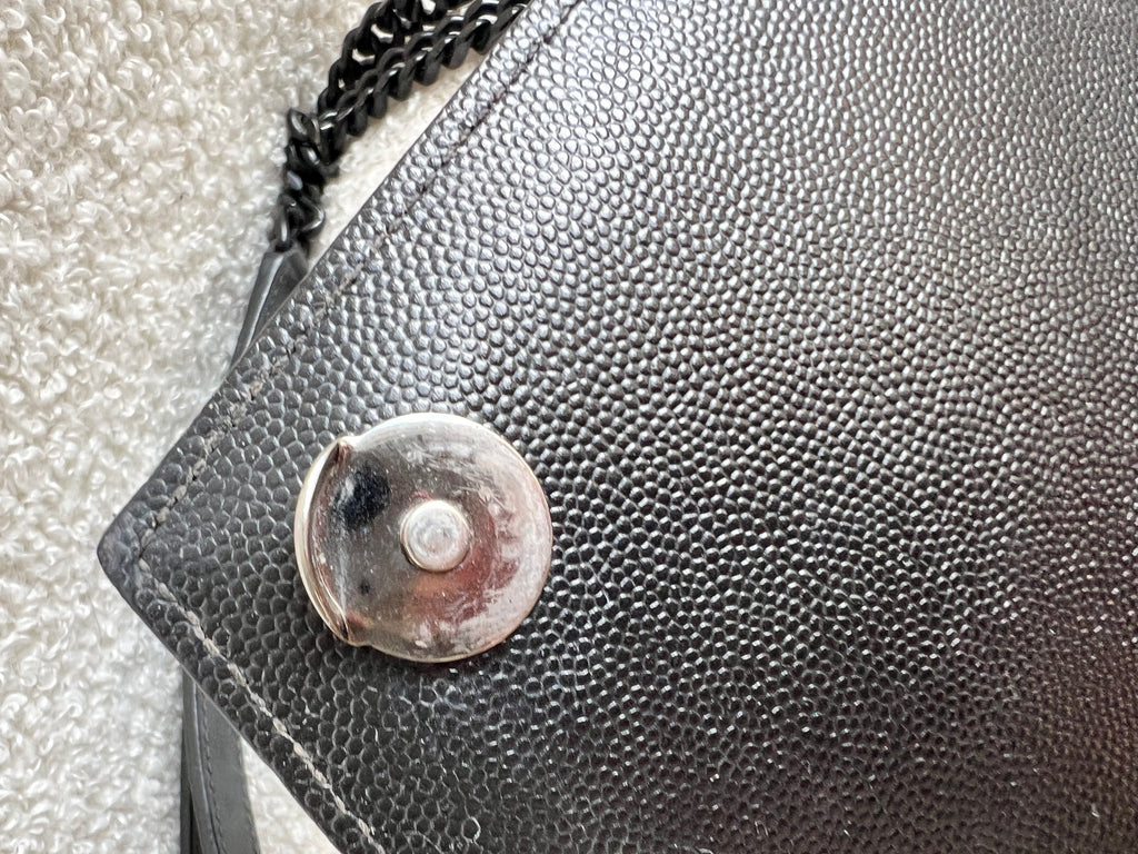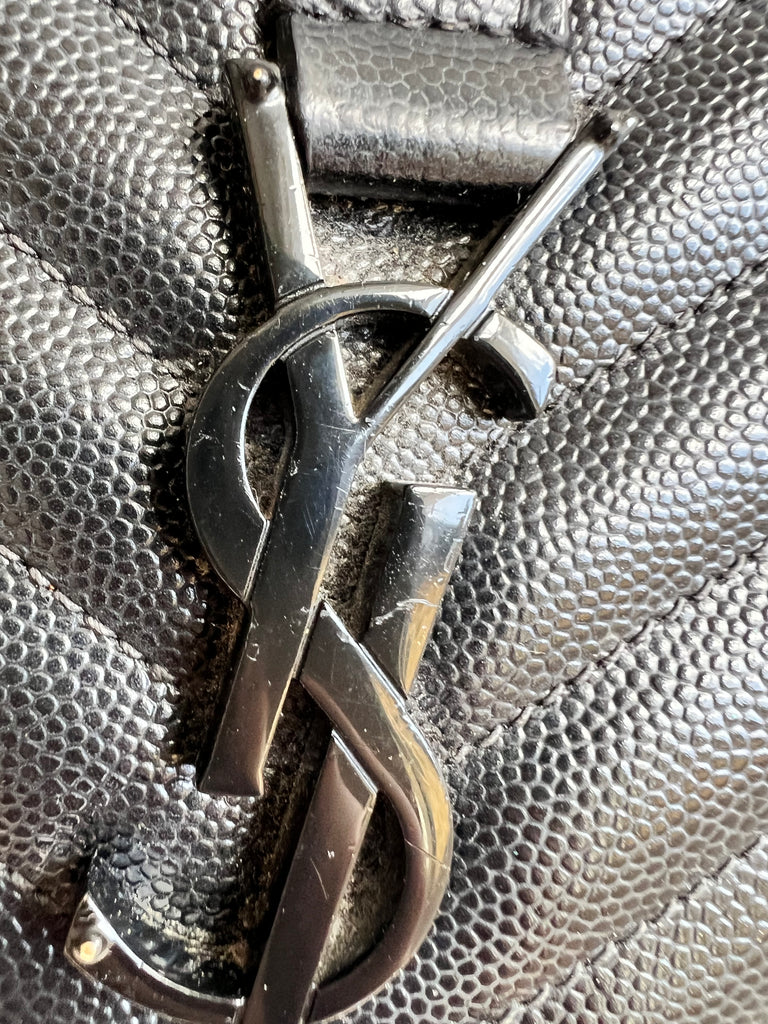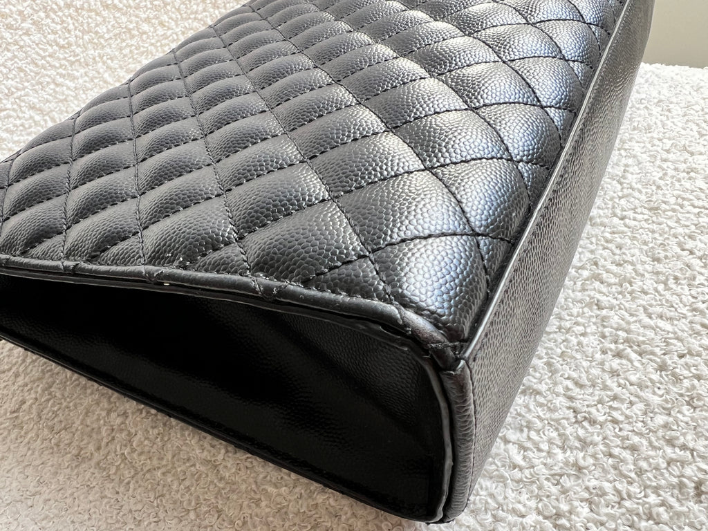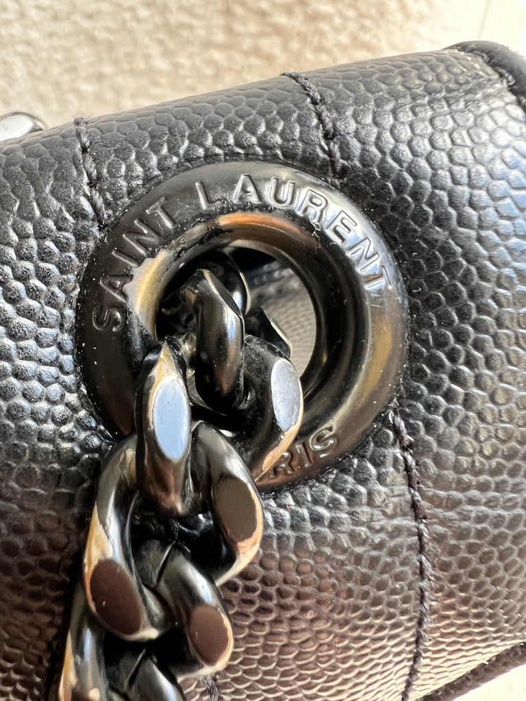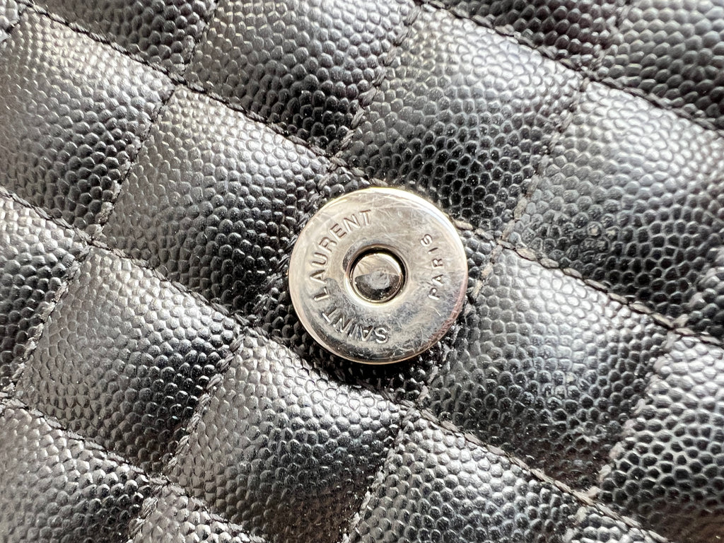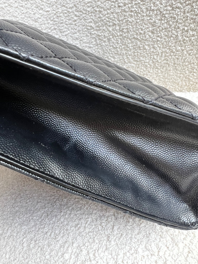 YSL Large Monogram Envelope Bag in Black mix matelasse grain de poudre embossed leather with black hardware. Front flap featuring iconic YSL lettering, vertical quilted overstitching and magnetic snap closure. Can be worn over shoulder or cross body using the sliding chain and leather strap. Perfect day to night bag that goes with almost any outfit.