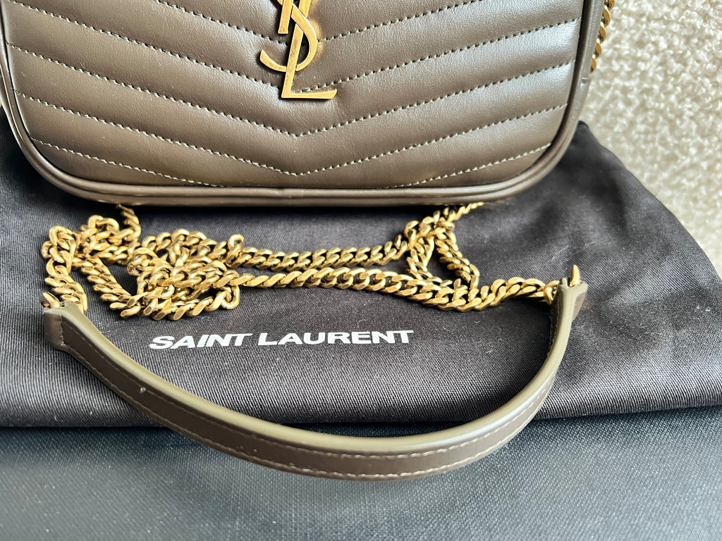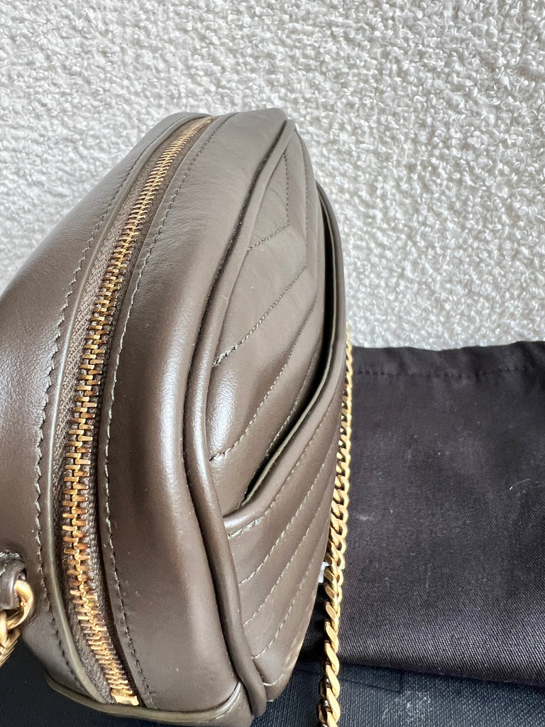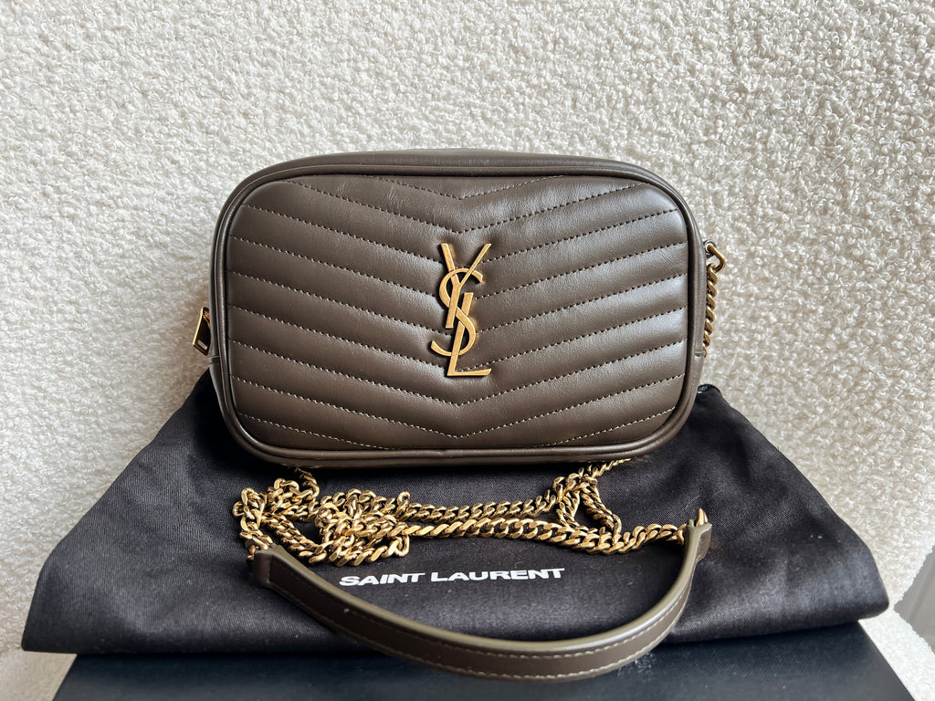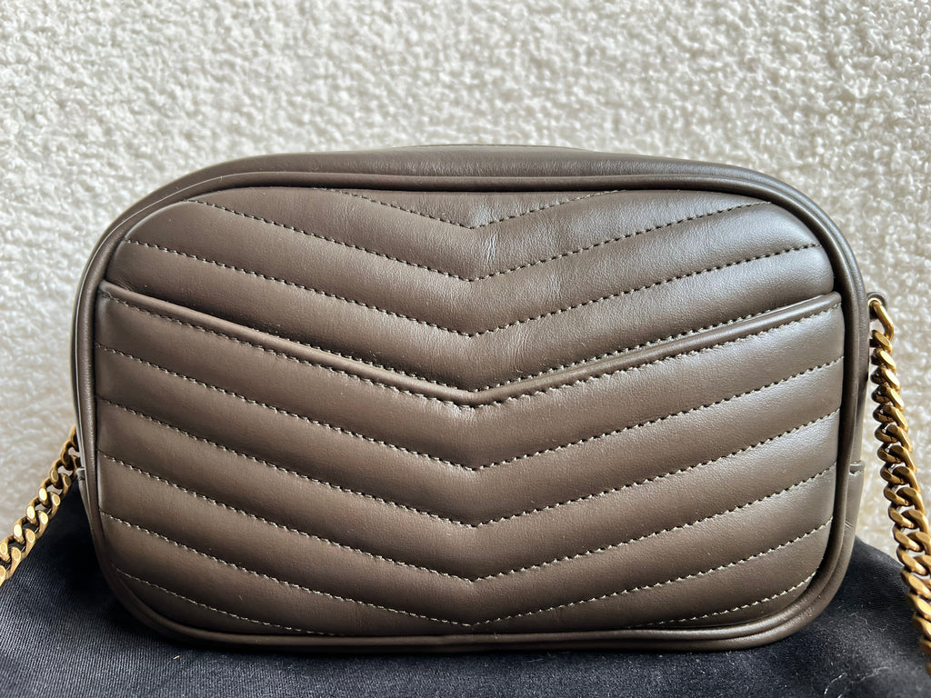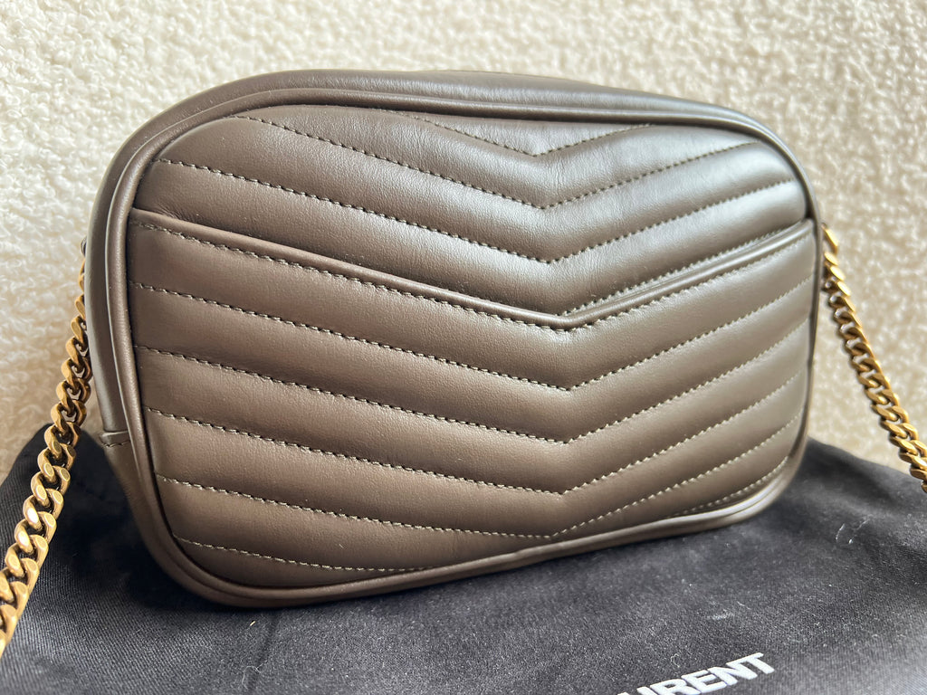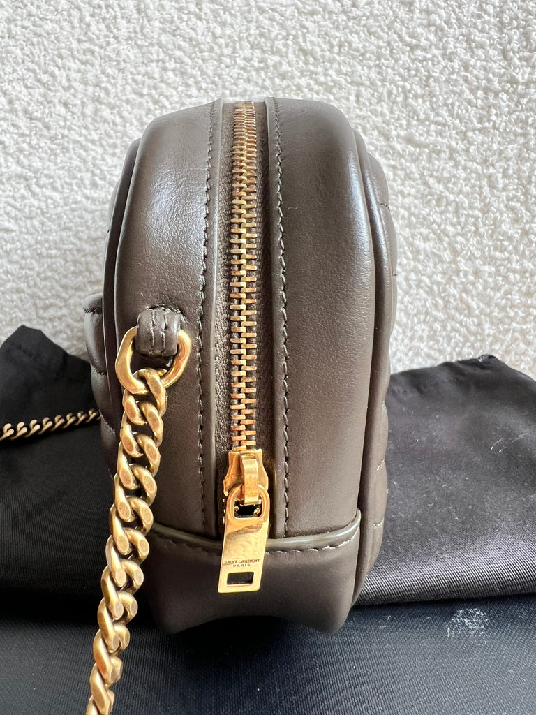 YSL Mini Lou Camera Bag in light musk quilted calfskin leather with gold hardware. This mini camera bag style is structured in this robust grained leather. Zip around closure and long adjustable strap means it can be worn over shoulder or cross body. Ideal for day to night wear. Colour is a dark khaki shade.