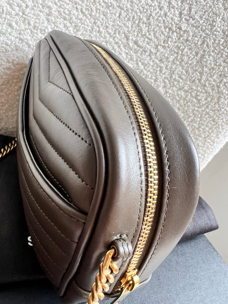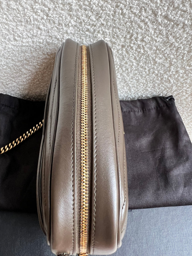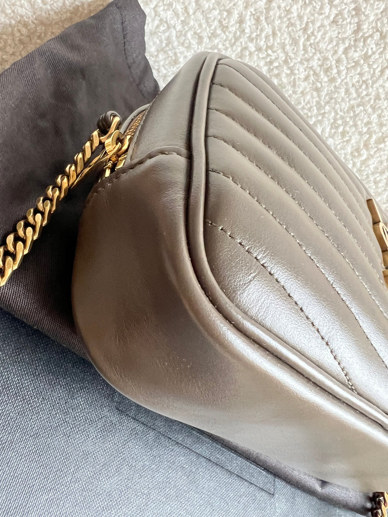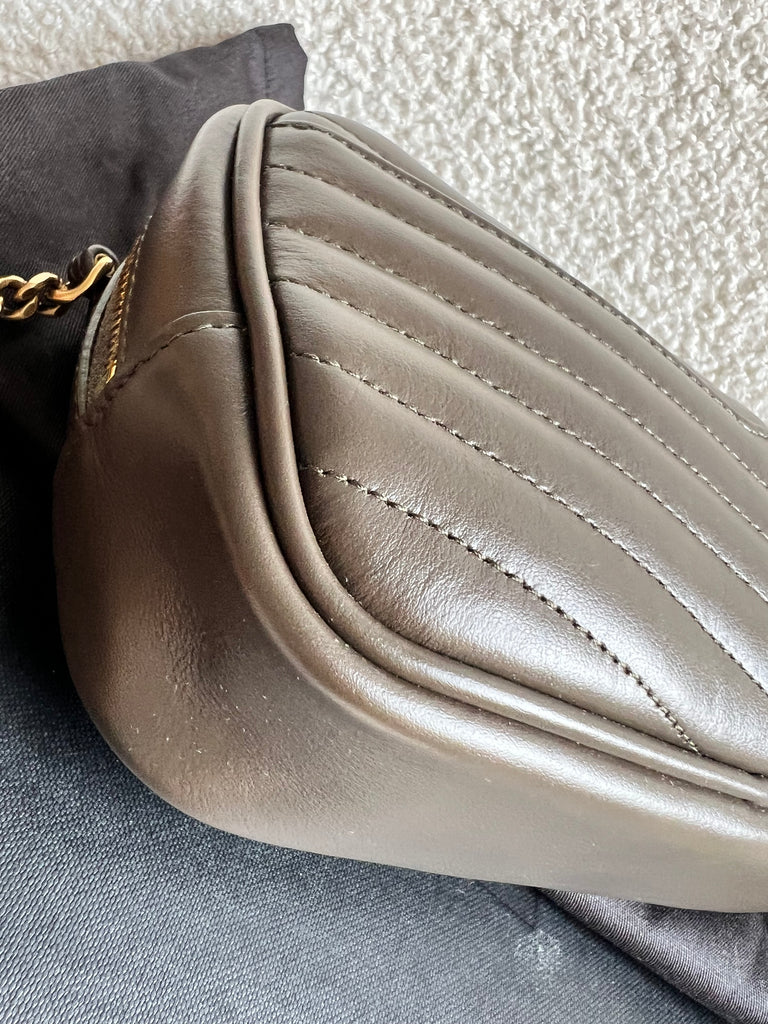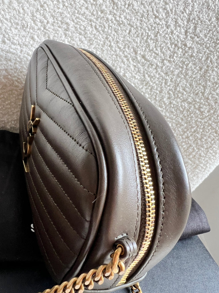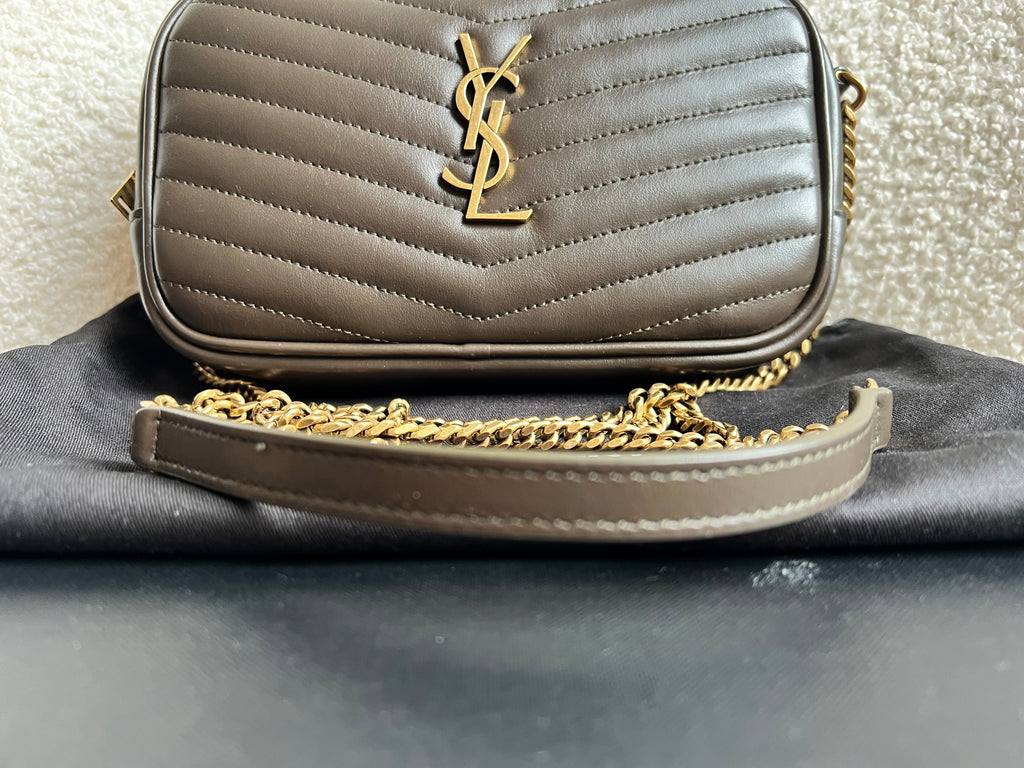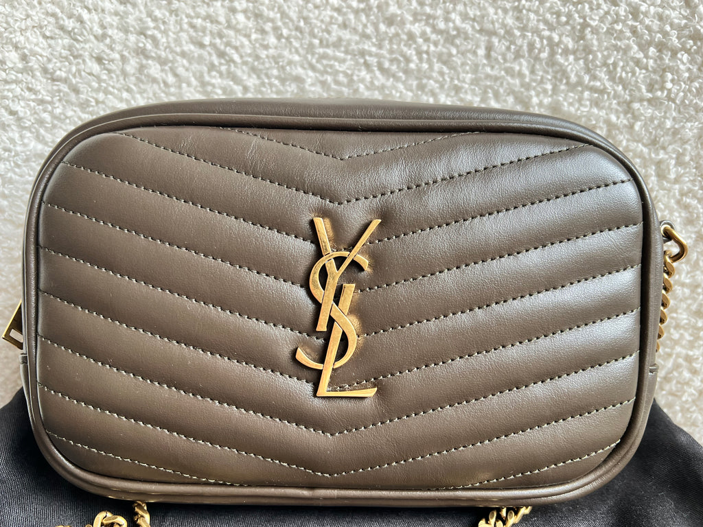 YSL Mini Lou Camera Bag in light musk quilted calfskin leather with gold hardware. This mini camera bag style is structured in this robust grained leather. Zip around closure and long adjustable strap means it can be worn over shoulder or cross body. Ideal for day to night wear. Colour is a dark khaki shade.