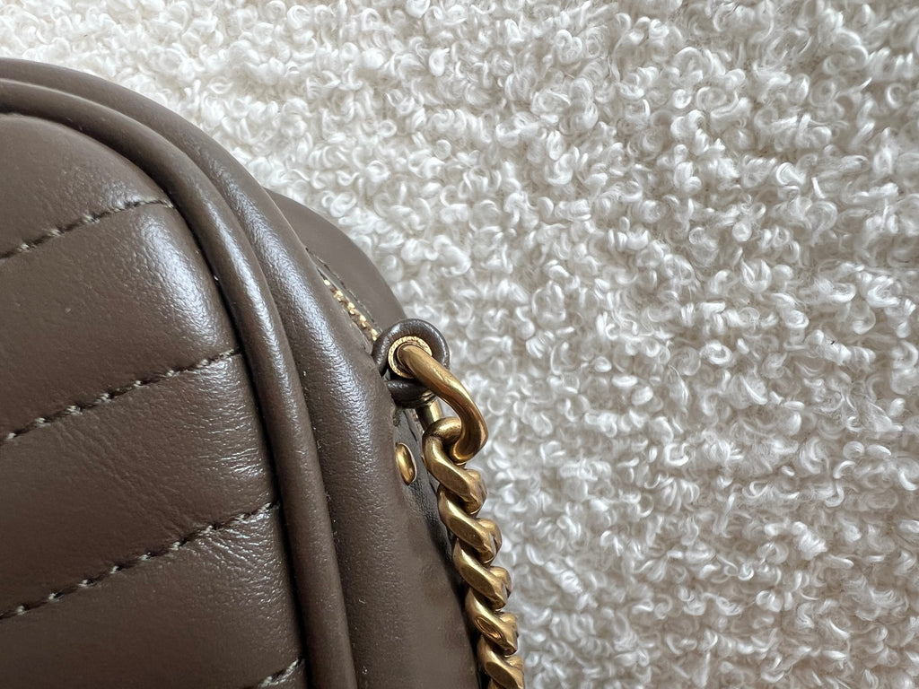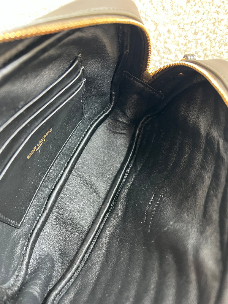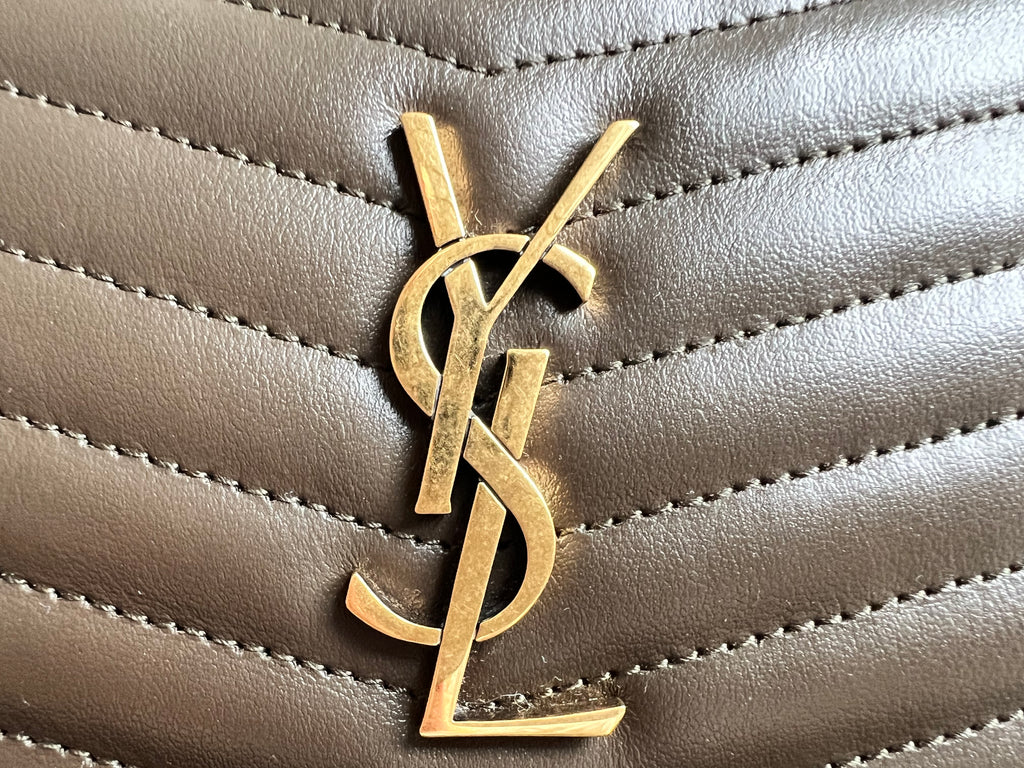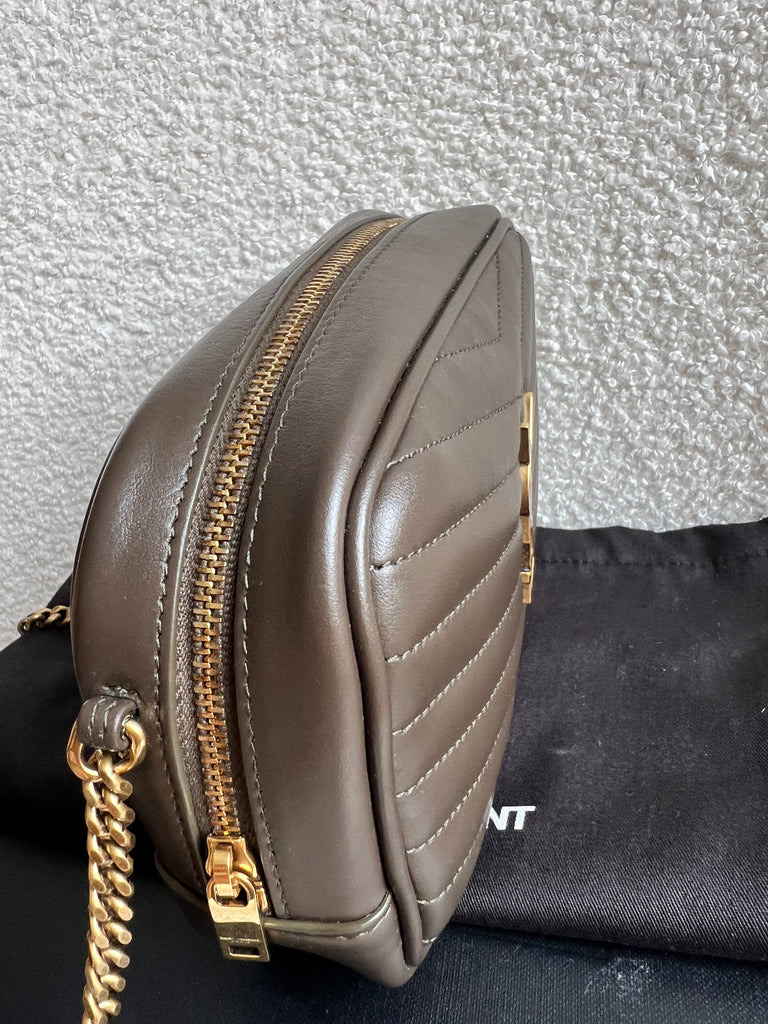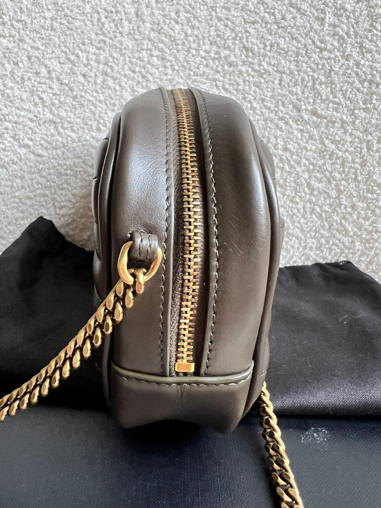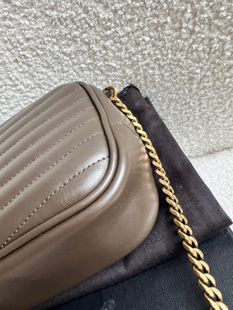 YSL Mini Lou Camera Bag in light musk quilted calfskin leather with gold hardware. This mini camera bag style is structured in this robust grained leather. Zip around closure and long adjustable strap means it can be worn over shoulder or cross body. Ideal for day to night wear. Colour is a dark khaki shade.
