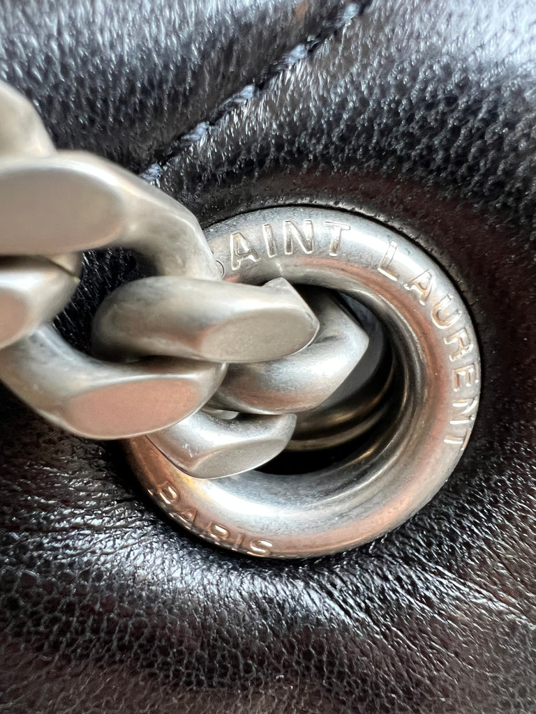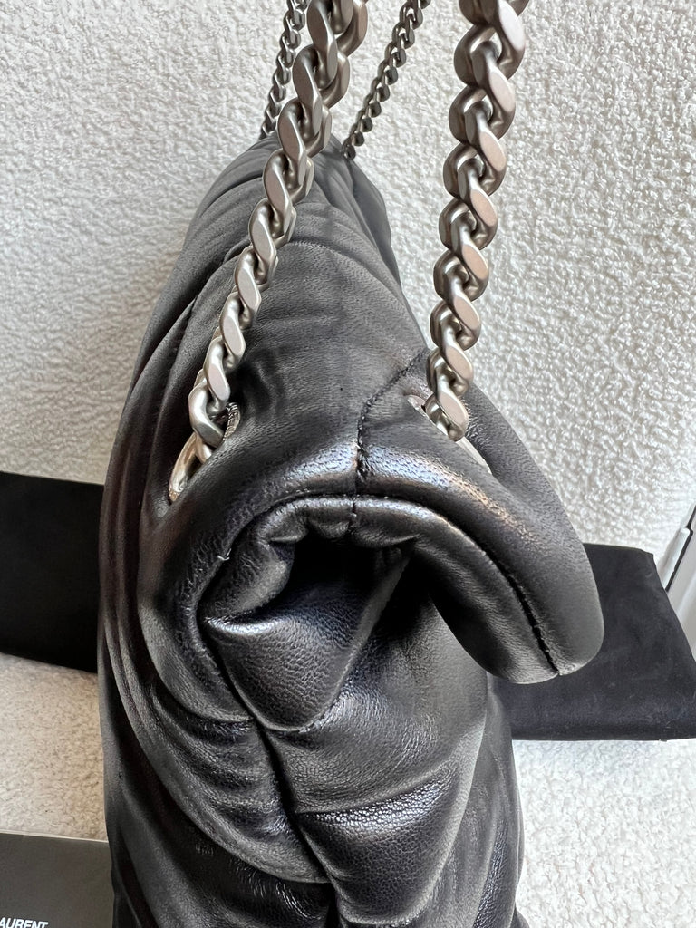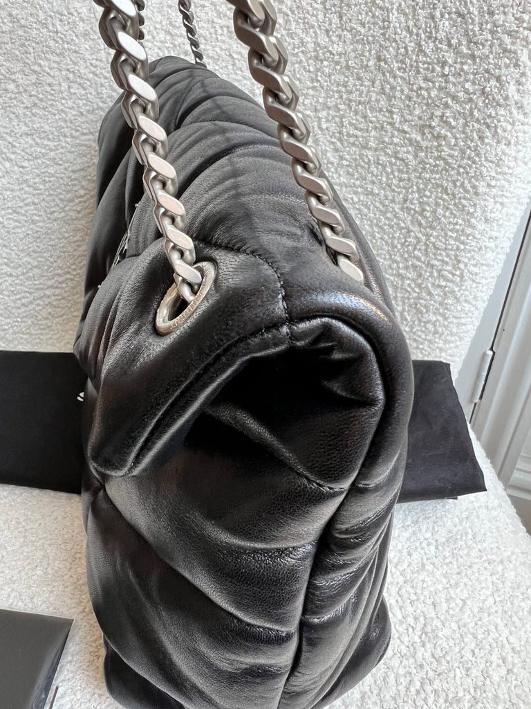 YSL Medium Lou Lou in Black Quilted Puffer Lambskin with silver hardware. Front flap features the iconic metal YSL initials and the luxurious calfskin leather is fairly resilient. Effortlessly chic and sophisticated - perfect for every day use. The sliding chain allows chain to be worn longer (and cross body), or doubled up and over the shoulder.