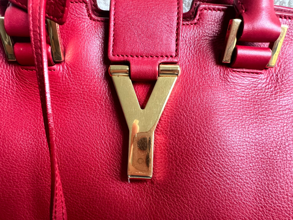 YSL Smal Cabas Chyc bag in red smooth calfskin with gold hardware. This slouchy; medium size tote is is ideal for day to day, gym or work use. Featuring zip top closure, two top handles and a long strap. This casual, chic style goes with both casual and smart outfits.